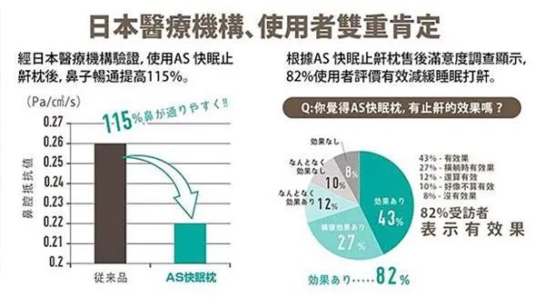 也針對顧客做問券調查,82%的使用者也認為止鼾效果極佳,睡起來很舒適