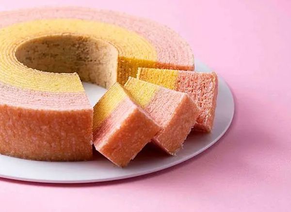 外側則是擁有櫻葉香的的櫻花色年輪蛋糕