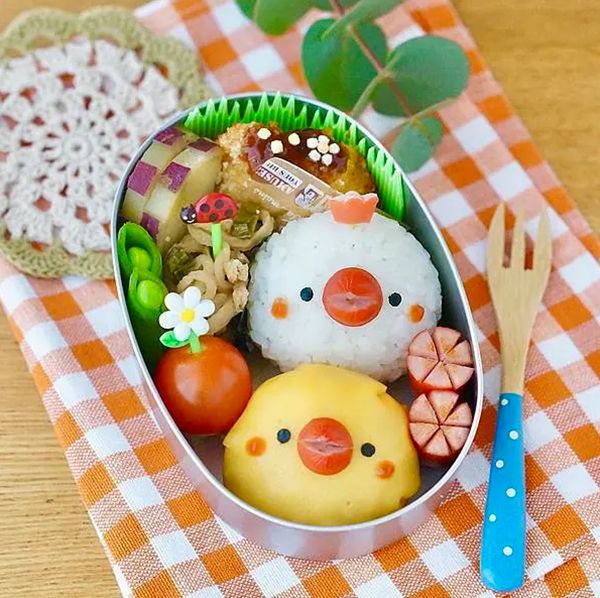 星期四《小雞蛋捲》以蛋捲作成小雞,飯糰作成小雞媽媽,番茄切半作成嘴巴。
