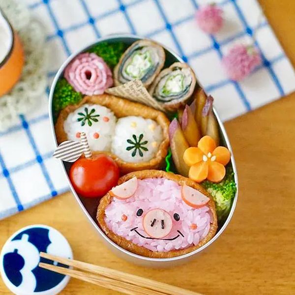 星期五《粉紅皮克》,櫻花醋飯作豬的身體,炸的火腿當鼻子耳朵,外層是豆皮。