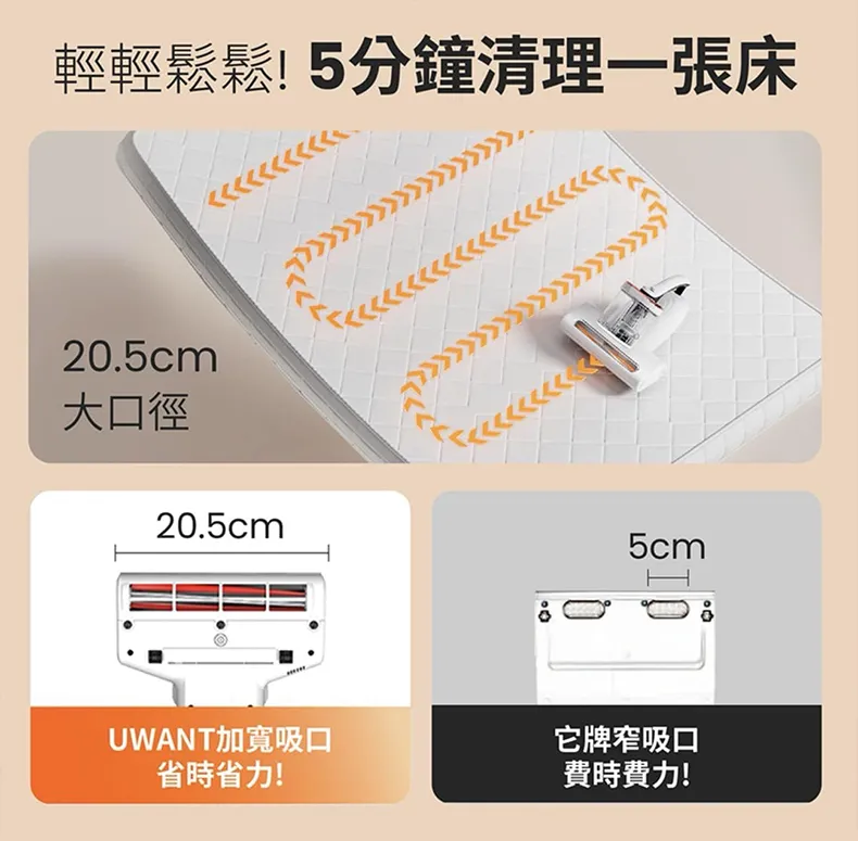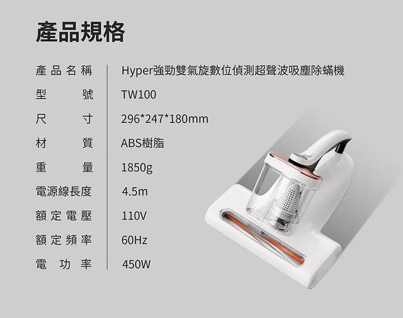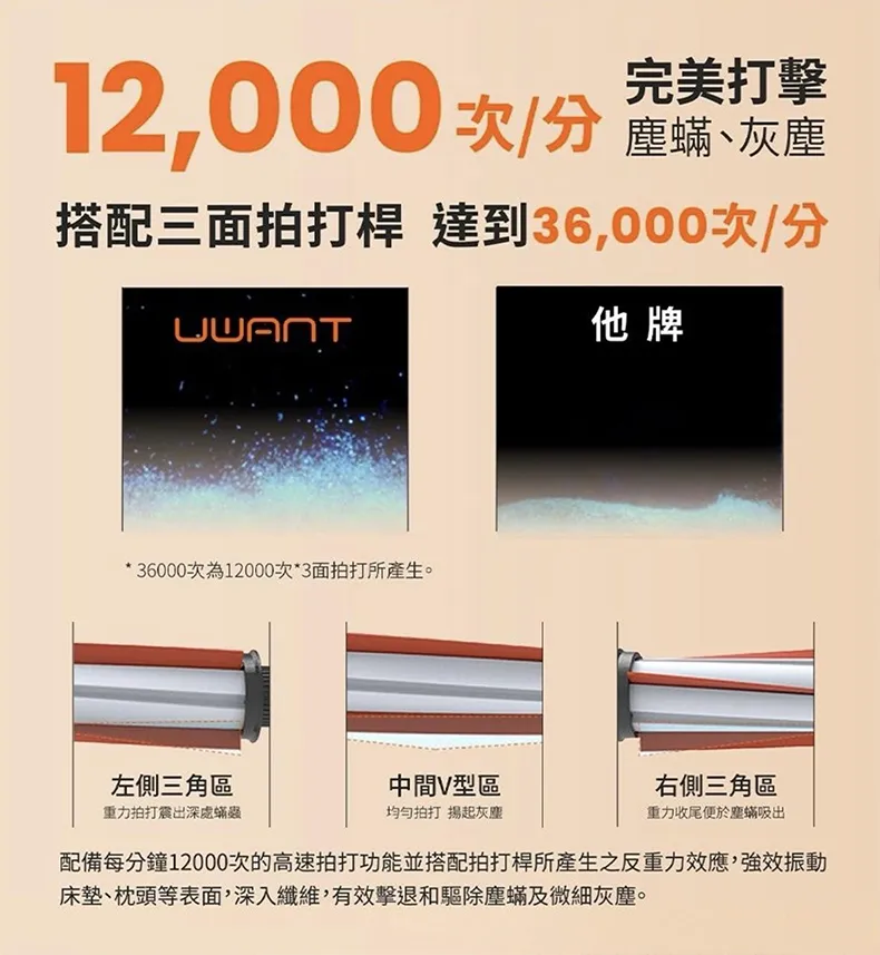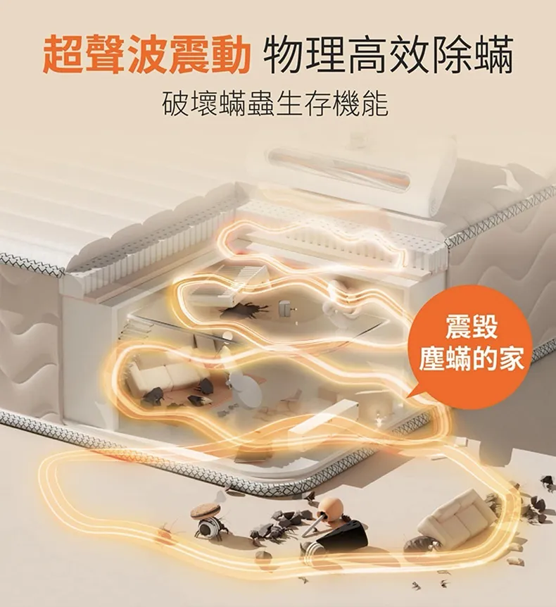 - 超聲波震動技術,每分鐘 12000 次震動,高效震落塵蟎。