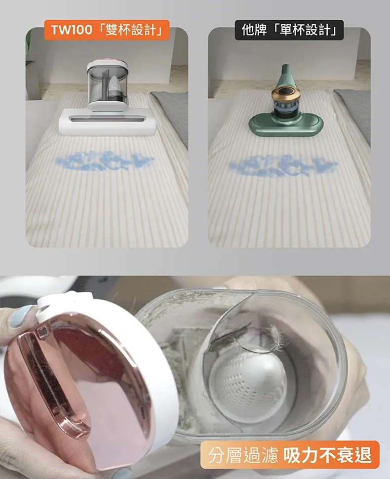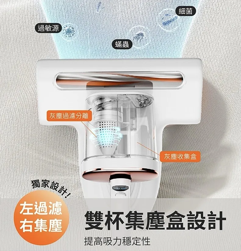 - 雙杯集塵盒設計,左側過濾,右側集塵,吸力持久不衰減。
