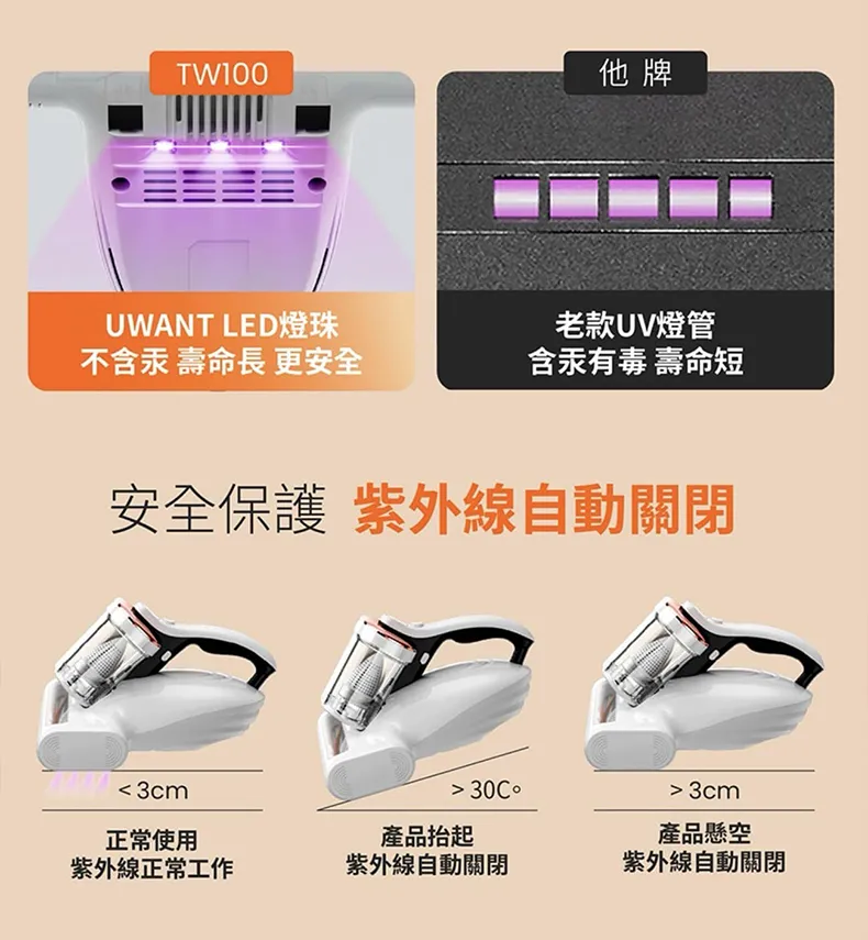 - UVC 紫外線殺菌,採用 LED 燈珠,無汞設計,壽命更長更安全。