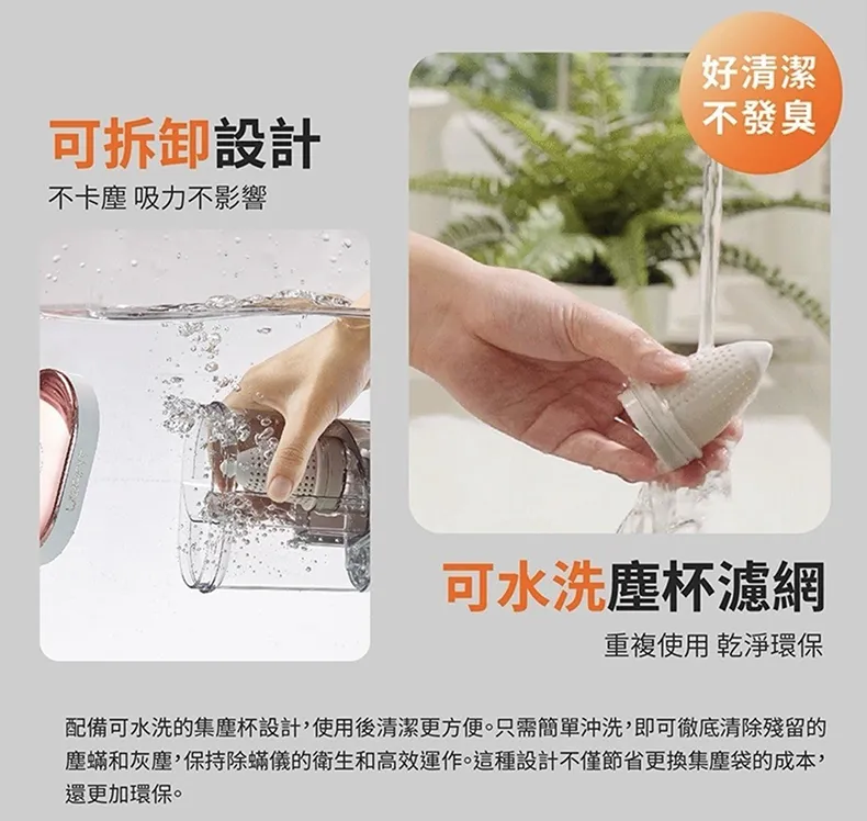 - 可水洗塵杯與濾網,清潔更方便,重複使用更環保。