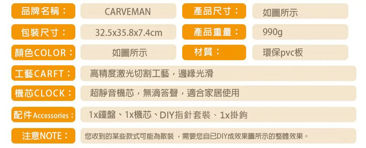 配件:鐘盤 x1 / 機芯 x1 / DIY 指針套裝 / 掛鉤 x1 / 黏貼雙面膠