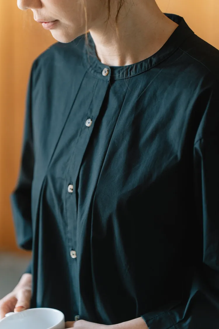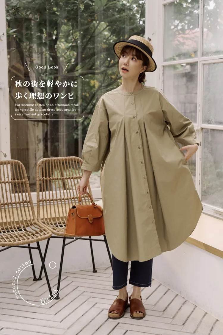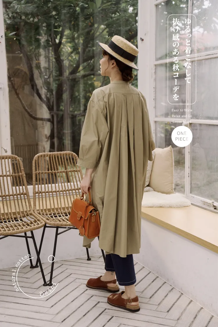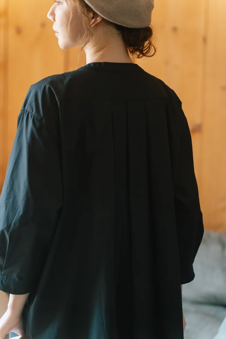 布料本身帶乾爽的紙感棉料,高支數緊密棉高密棉特性硬挺,穿起來有空氣感日系感十足!布料是有挺度不是軟棉綿的那種,俐落度100分!再加上胸前和背後的寬打褶線條,讓衣服呈現出傘狀的樣子,能修飾身材也給人一種很優雅的感覺!
