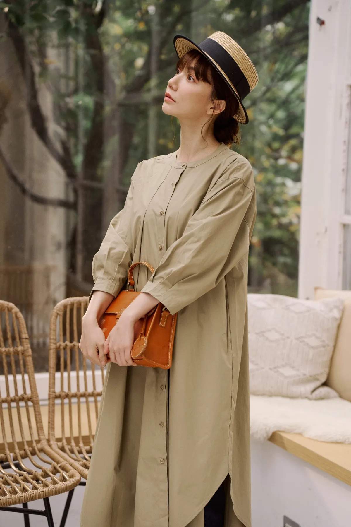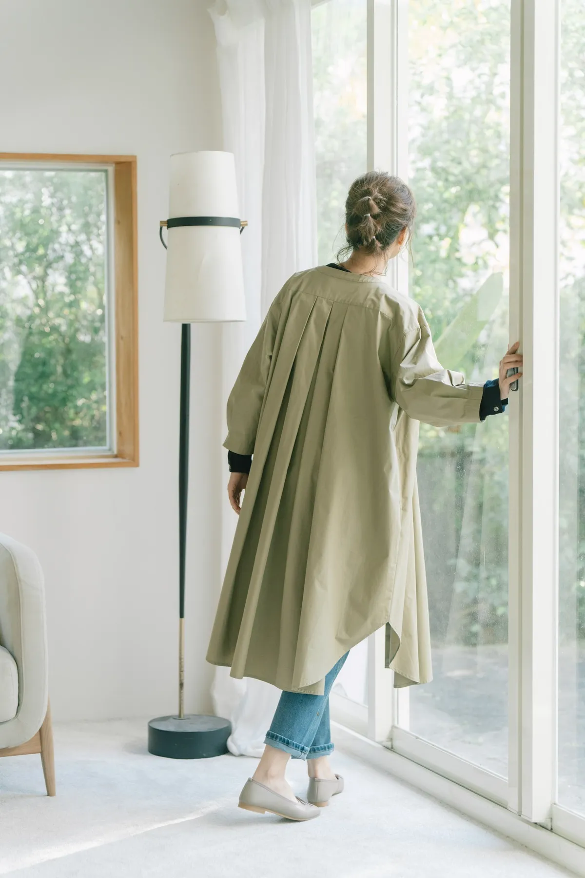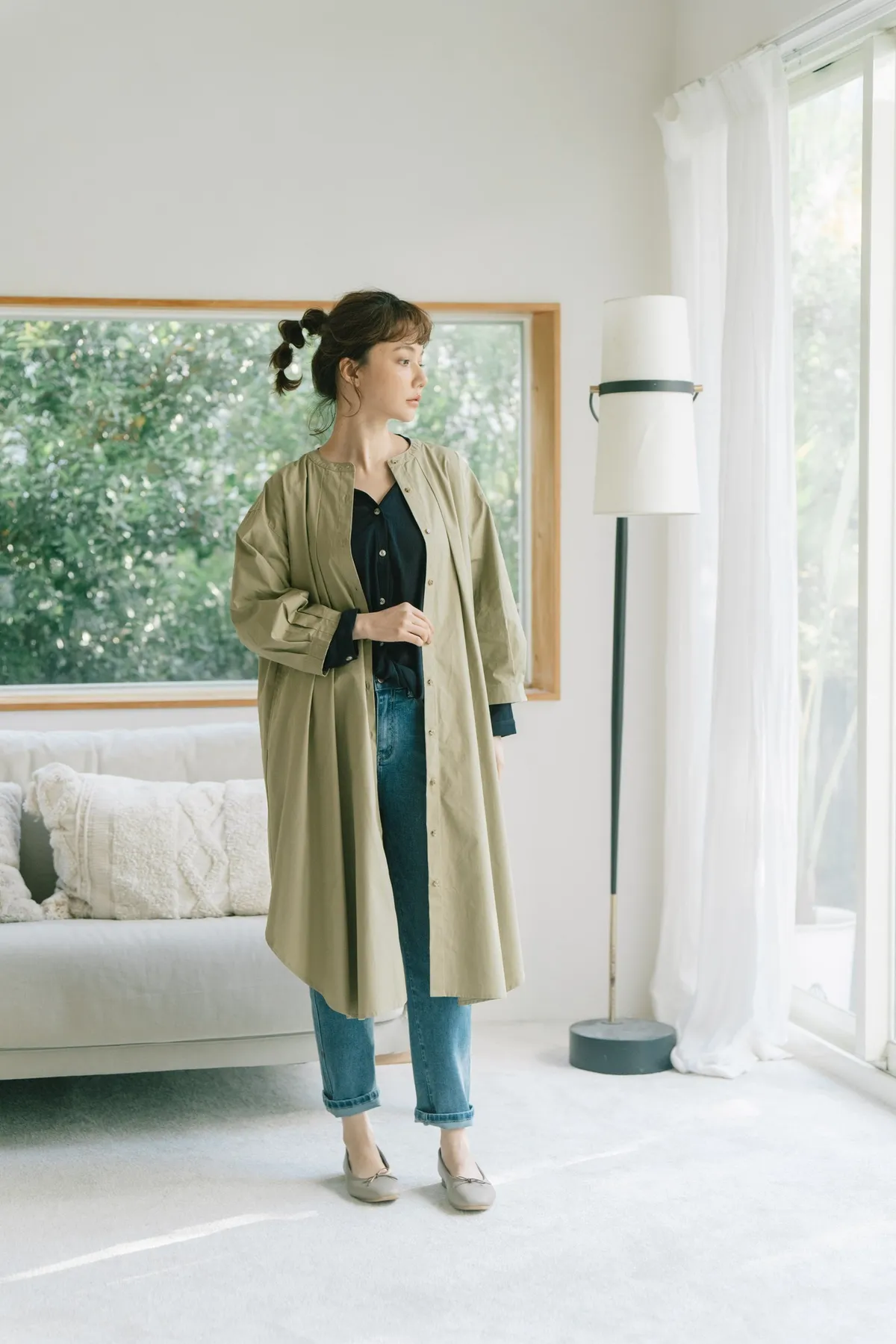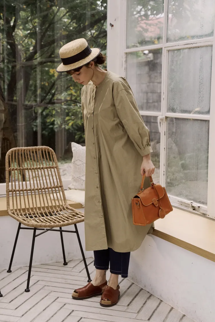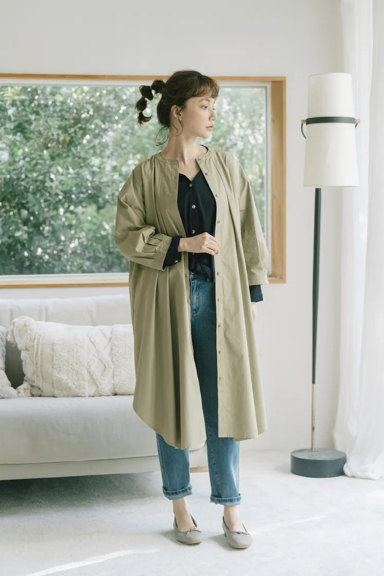 袖子帶有點立體感的澎袖,但不會過澎能剛好的修飾手臂!襯衫型設計方便多重搭配,想要帥氣可以敞開當風衣外型,搭配T恤加牛仔褲,想要淑女可搭配高領內搭毛衣,中段扣起幾顆扣子係上腰帶搭配長裙。這件穿起來真的很美~許多小細節都設計得很細膩又恰到好處。不花腦就能完成一日美麗穿搭喔!