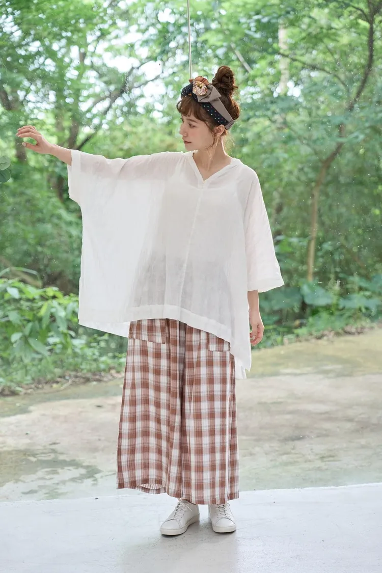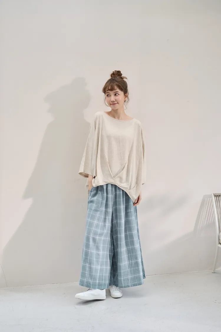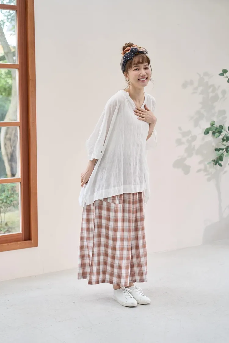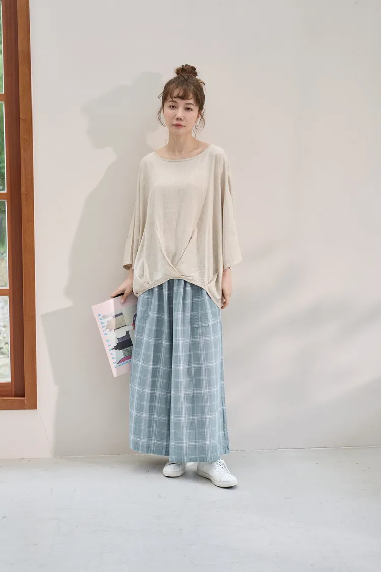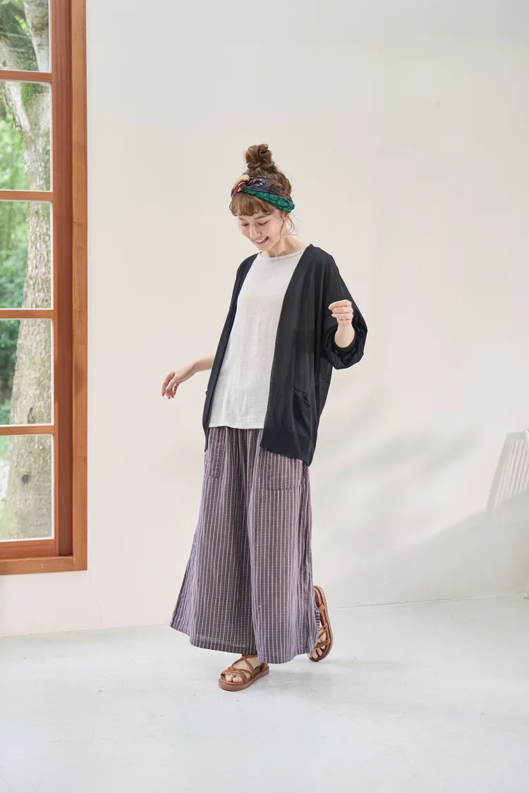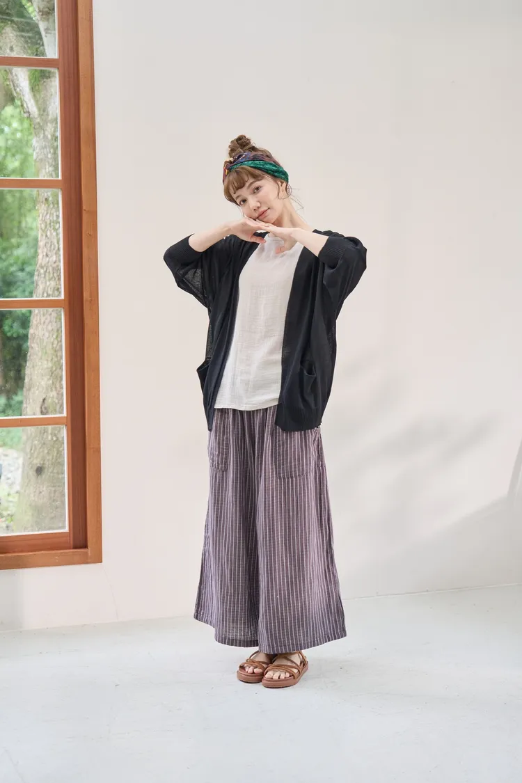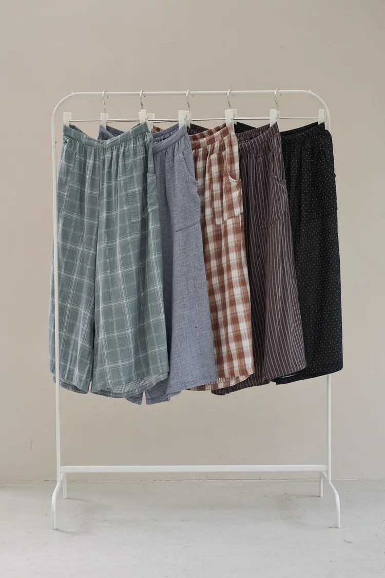 非常輕柔 觸感極佳 很輕的布料 夏天最合適,這種材質還會給人一種很穩重的日本自然系氛圍,洗濯後質感不會變喔!穿起來很涼爽,很輕盈沒什麼負擔的感覺,風還會透進去,夏季穿整個都涼涼的。大部份的人都會買一件格子/條紋系列再配一件素色的~或是一淺一深,穿起來會有點像褲裙 在休閒的打扮中帶點女人味。褲長大約落在腳踝上一些 會隱約露出腳踝線條,如果很在意屁股比較顯眼的人這種寬褲剛剛好可以蓋住屁股,也無須在意會透光造成曝光!在手放下來的地方剛好有兩個口袋,褲頭內裡有鬆緊帶綁帶設計可調整腰圍喔。