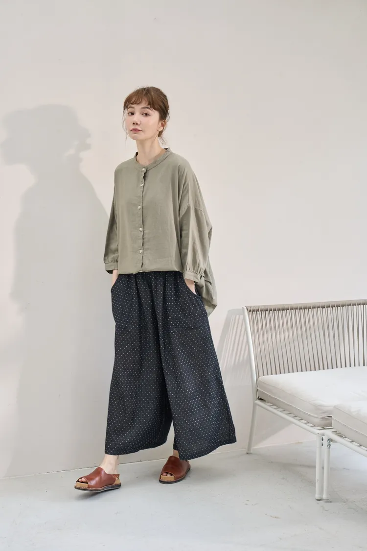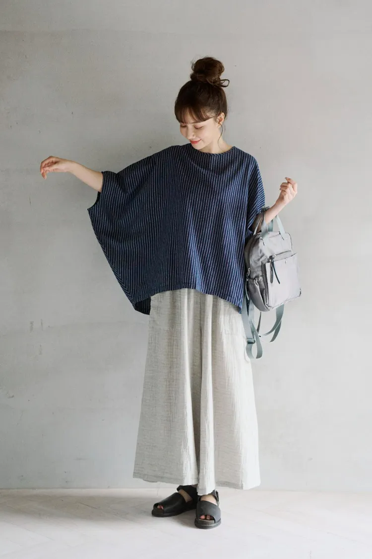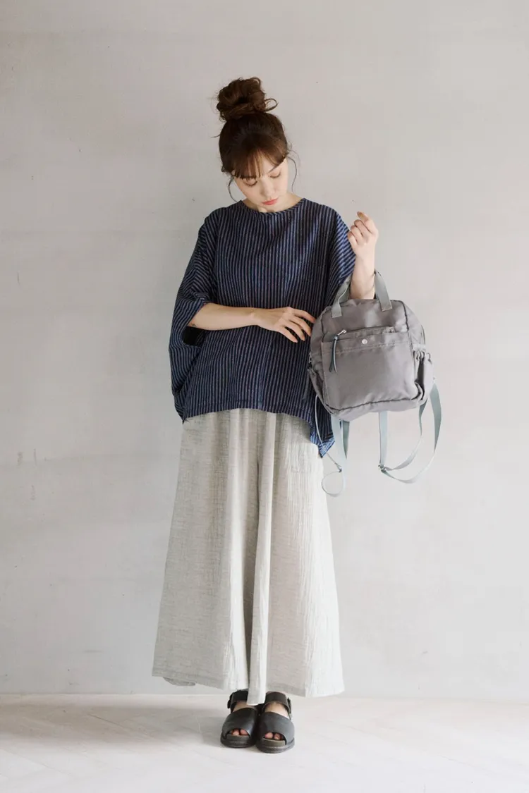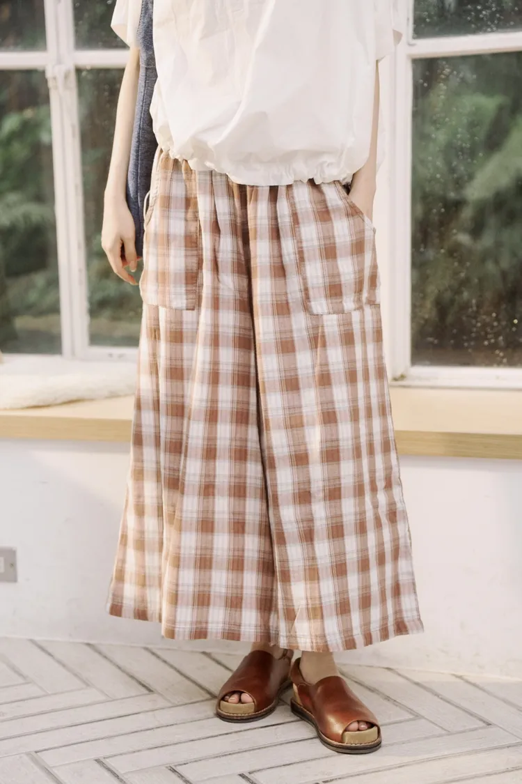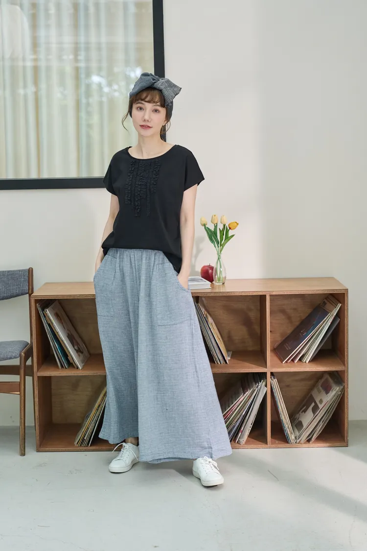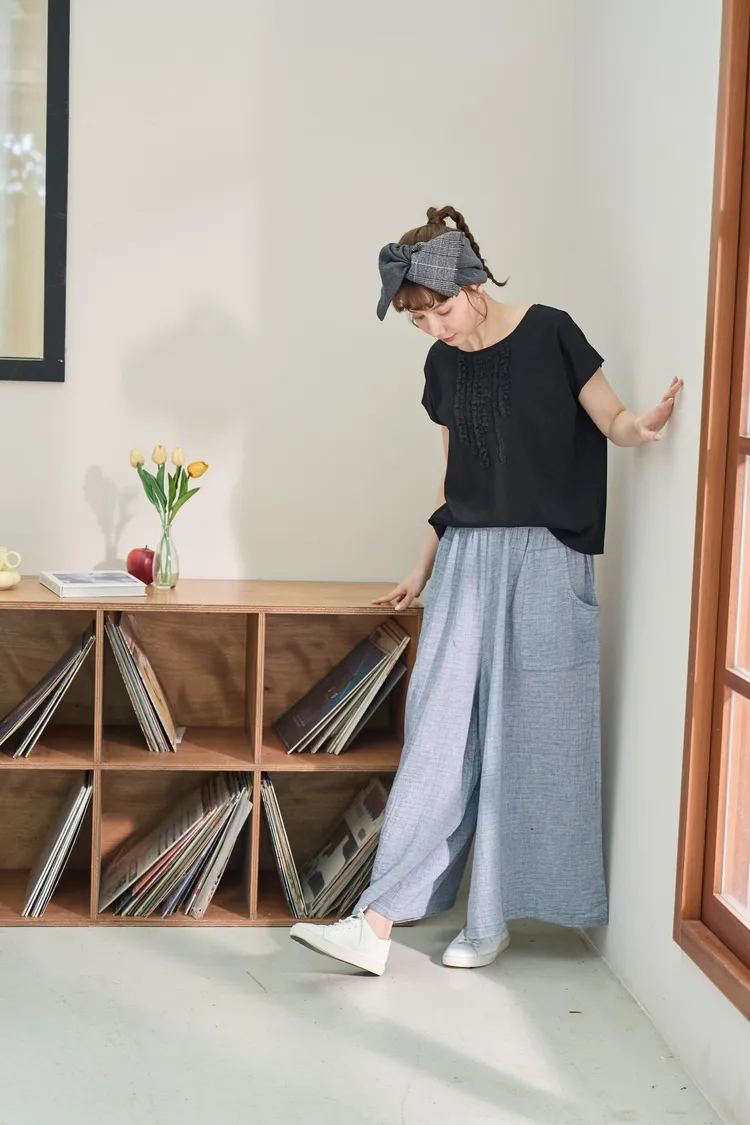 非常輕柔 觸感極佳 很輕的布料 夏天最合適,這種材質還會給人一種很穩重的日本自然系氛圍,洗濯後質感不會變喔!穿起來很涼爽,很輕盈沒什麼負擔的感覺,風還會透進去,夏季穿整個都涼涼的。大部份的人都會買一件格子/條紋系列再配一件素色的~或是一淺一深,穿起來會有點像褲裙 在休閒的打扮中帶點女人味。褲長大約落在腳踝上一些 會隱約露出腳踝線條,如果很在意屁股比較顯眼的人這種寬褲剛剛好可以蓋住屁股,也無須在意會透光造成曝光!在手放下來的地方剛好有兩個口袋,褲頭內裡有鬆緊帶綁帶設計可調整腰圍喔。