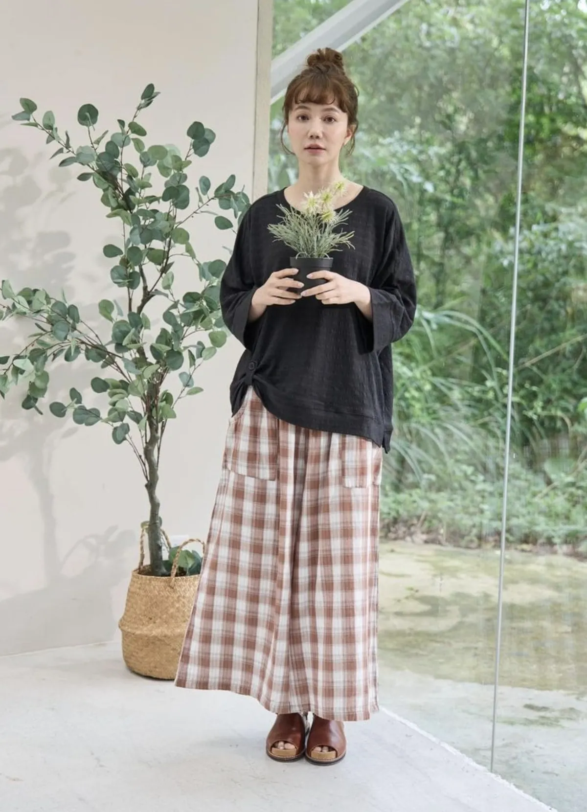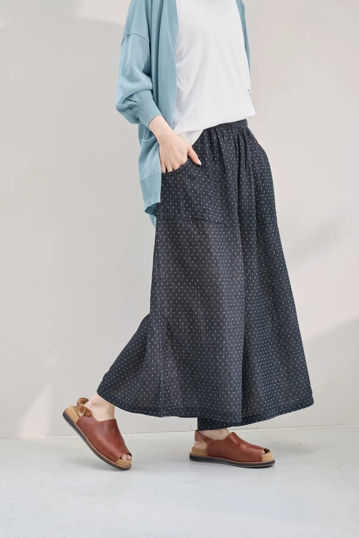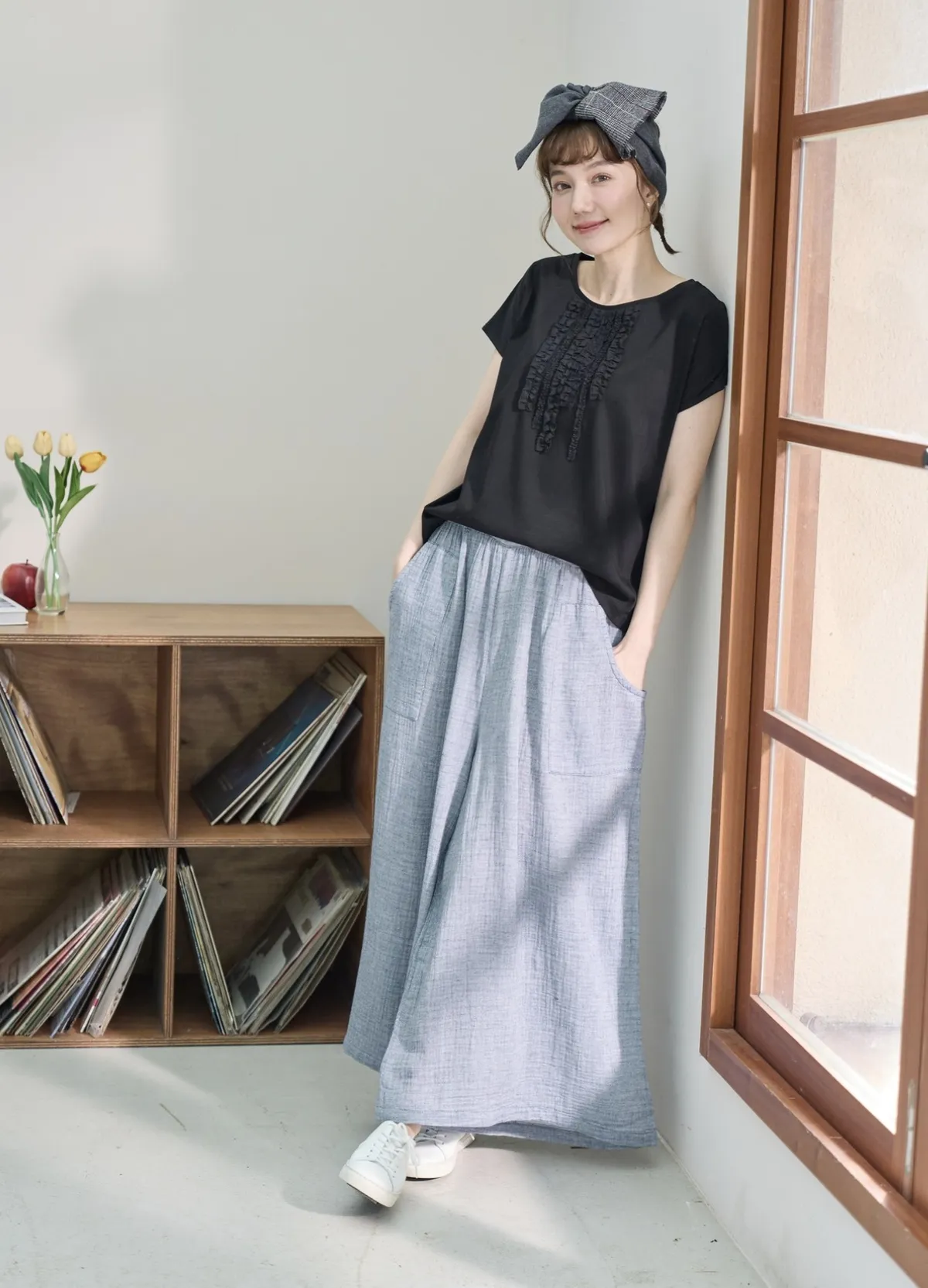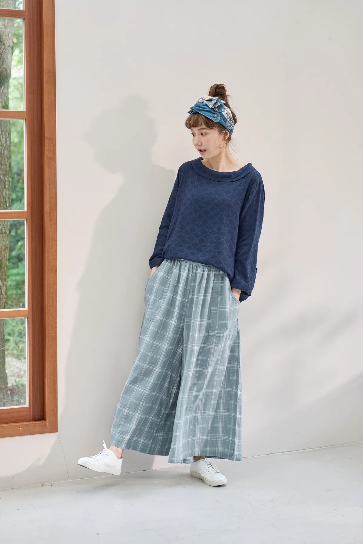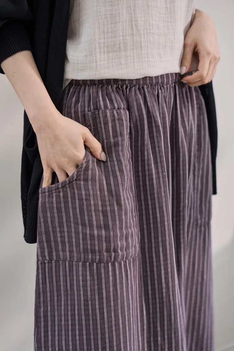 非常輕柔 觸感極佳 很輕的布料 夏天最合適,這種材質還會給人一種很穩重的日本自然系氛圍,洗濯後質感不會變喔!穿起來很涼爽,很輕盈沒什麼負擔的感覺,風還會透進去,夏季穿整個都涼涼的。大部份的人都會買一件格子/條紋系列再配一件素色的~或是一淺一深,穿起來會有點像褲裙 在休閒的打扮中帶點女人味。褲長大約落在腳踝上一些 會隱約露出腳踝線條,如果很在意屁股比較顯眼的人這種寬褲剛剛好可以蓋住屁股,也無須在意會透光造成曝光!在手放下來的地方剛好有兩個口袋,褲頭內裡有鬆緊帶綁帶設計可調整腰圍喔。