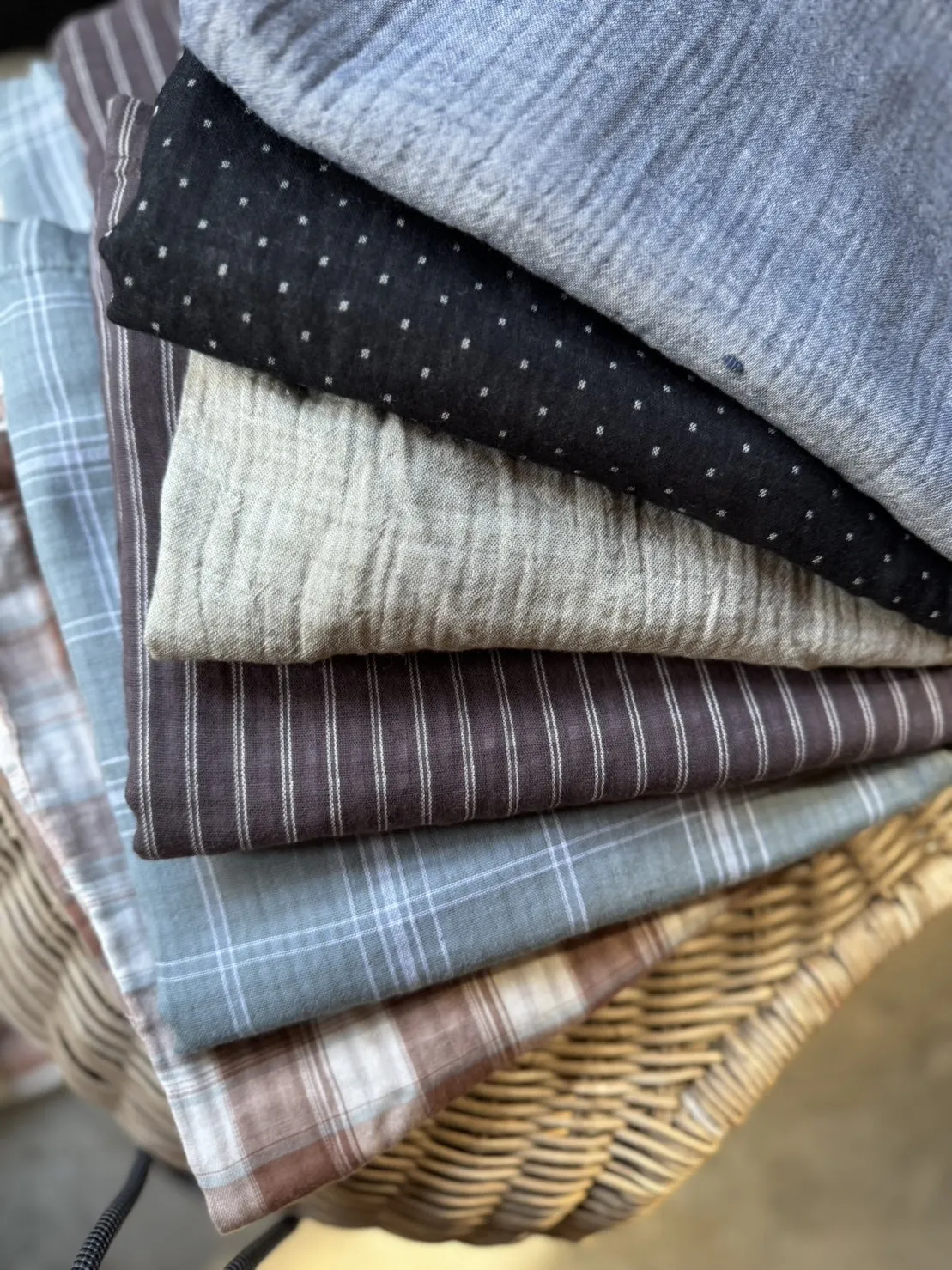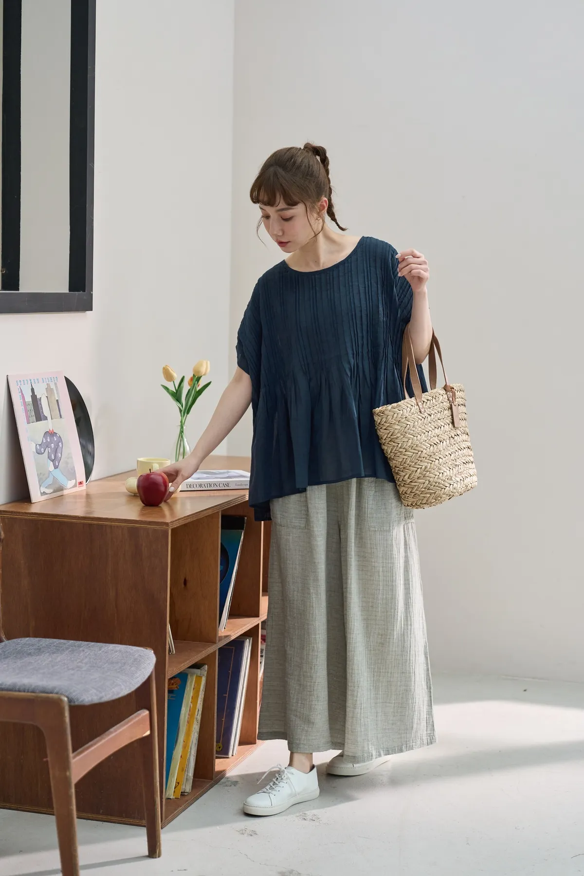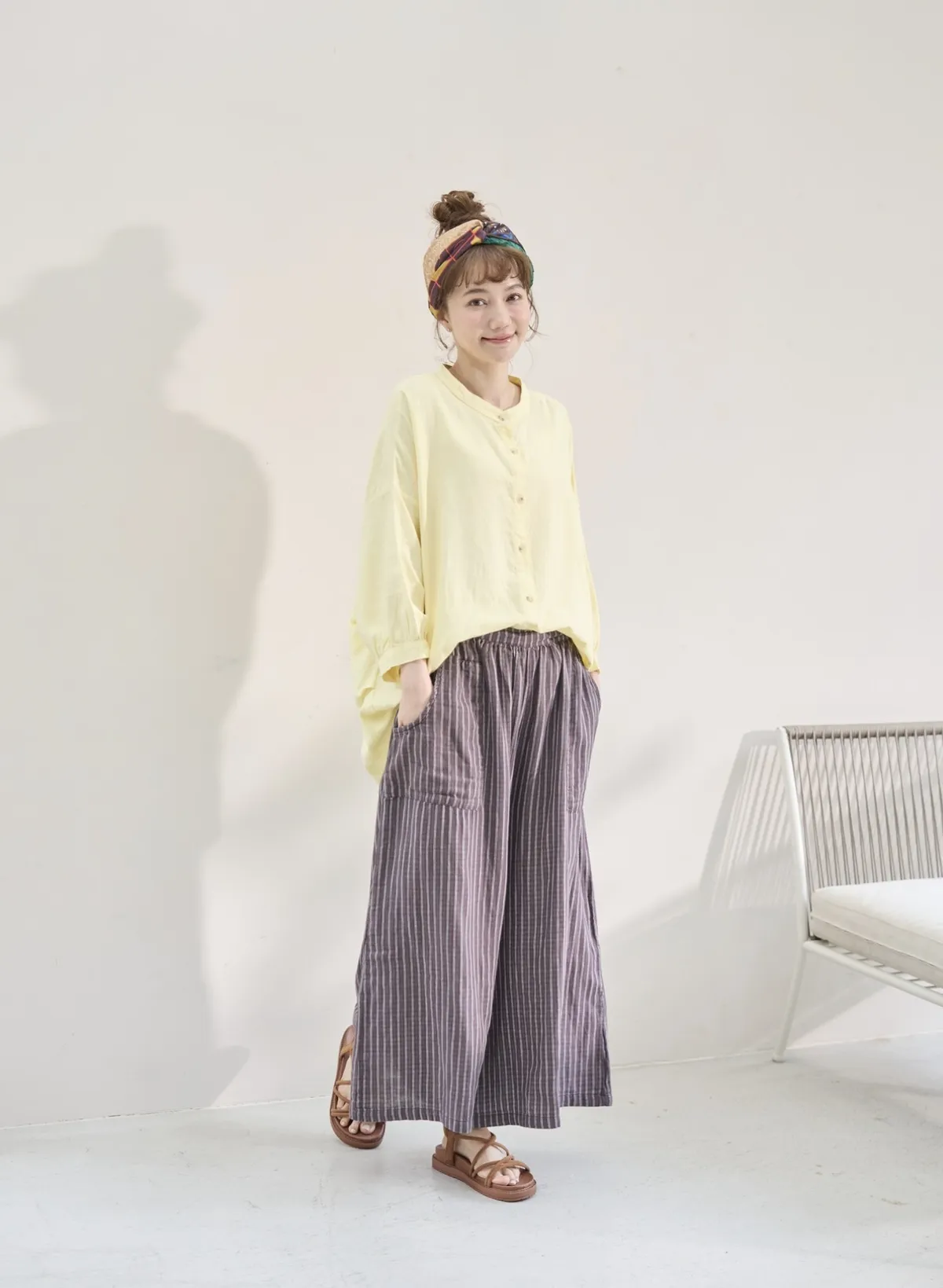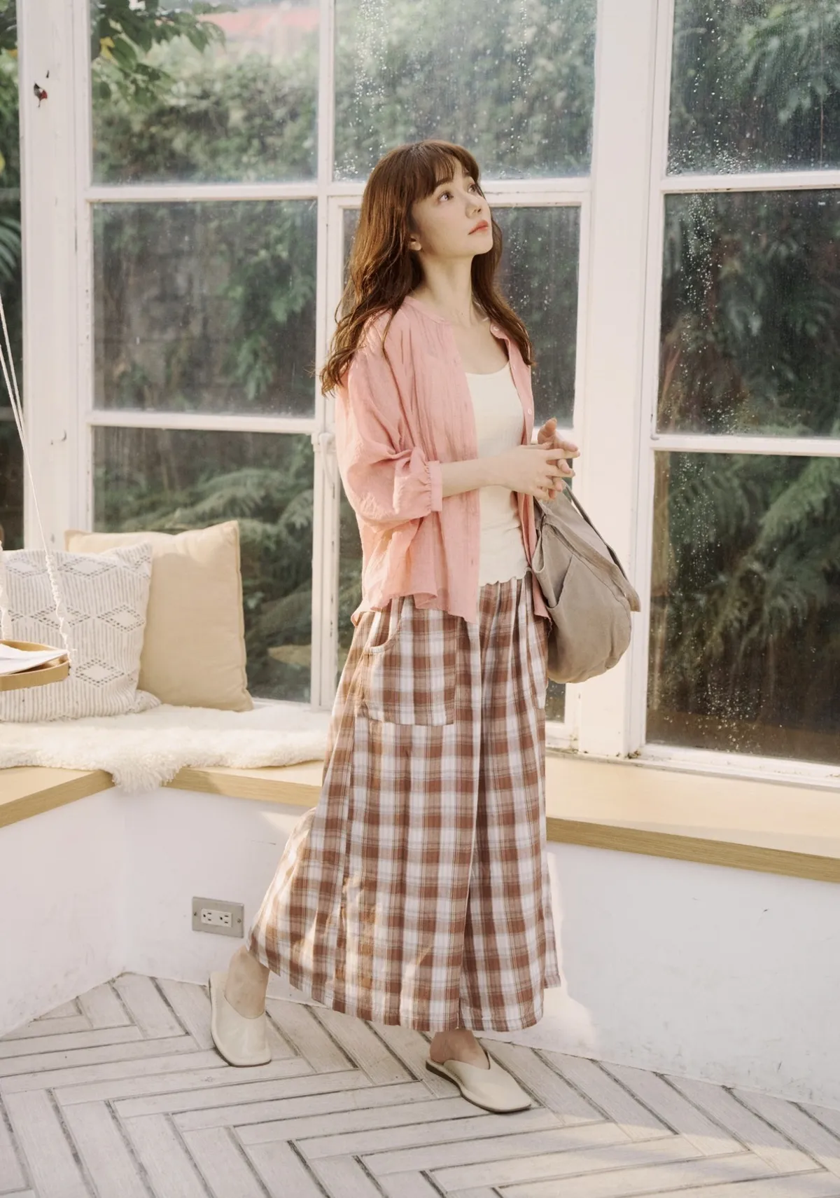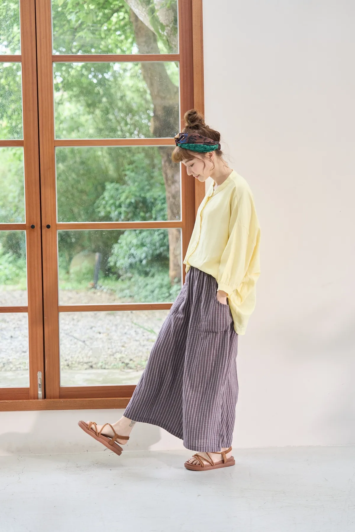 非常輕柔 觸感極佳 很輕的布料 夏天最合適,這種材質還會給人一種很穩重的日本自然系氛圍,洗濯後質感不會變喔!穿起來很涼爽,很輕盈沒什麼負擔的感覺,風還會透進去,夏季穿整個都涼涼的。大部份的人都會買一件格子/條紋系列再配一件素色的~或是一淺一深,穿起來會有點像褲裙 在休閒的打扮中帶點女人味。褲長大約落在腳踝上一些 會隱約露出腳踝線條,如果很在意屁股比較顯眼的人這種寬褲剛剛好可以蓋住屁股,也無須在意會透光造成曝光!在手放下來的地方剛好有兩個口袋,褲頭內裡有鬆緊帶綁帶設計可調整腰圍喔。