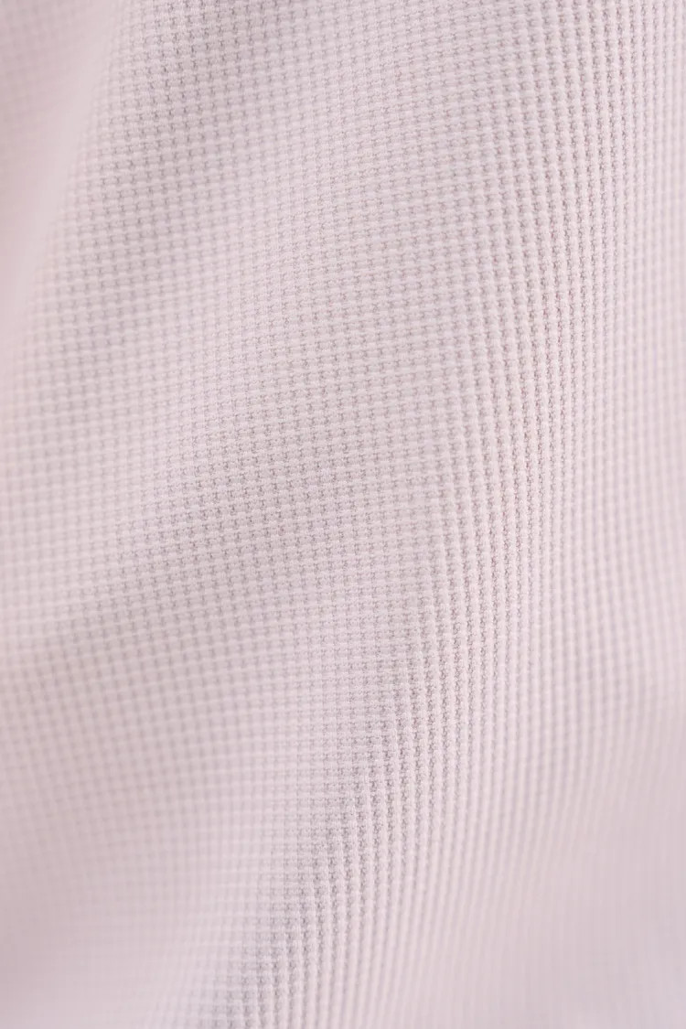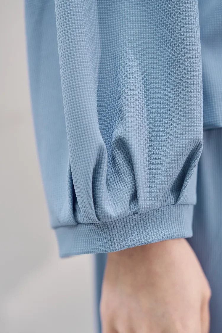對應飛機車內的悶熱氣溫,特地設計七分袖設計,穿起來不會感到太冷,但也因為布料特性不會悶熱,再加上布料特性是凹凸細格紋設計,穿起來帶有修飾體型的效果。還帶有彈性真的穿脫方便