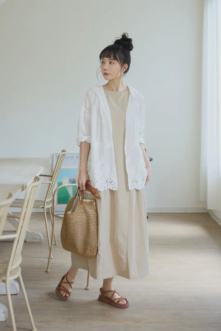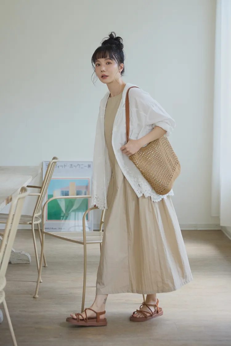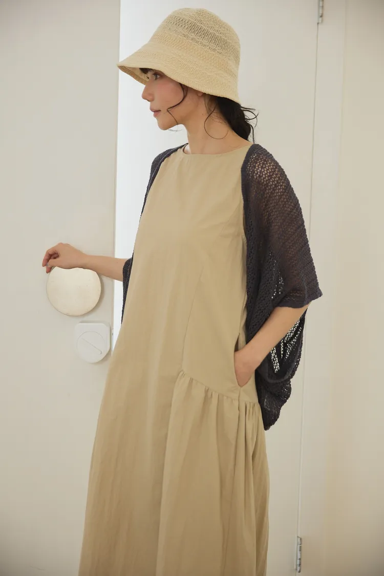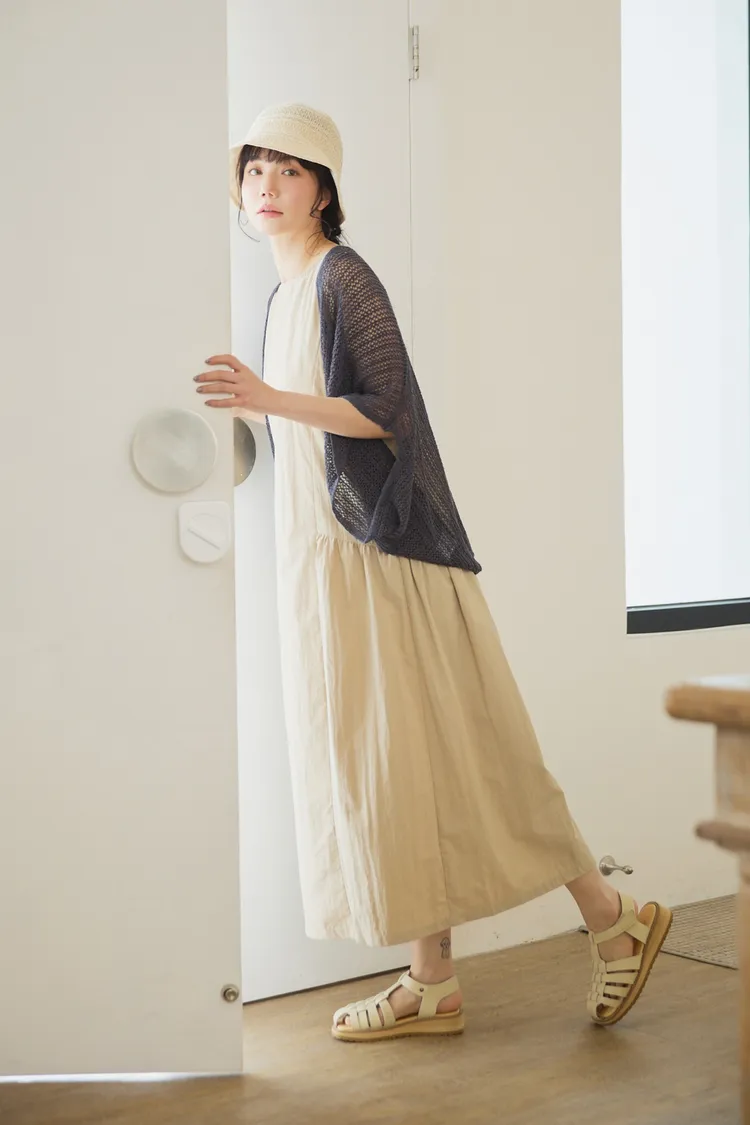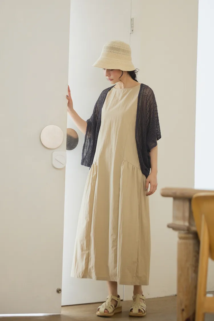 在洋裝腰圍和側邊設計立體車縫線與抓皺設計,讓穿起來的時候有抓腰的感覺,不會整件衣服順身而下像孕婦裝。穿起來既優雅又時尚!加上布料是有點紙感加上稍微防潑水設計,質感穿起來效果很挺,不會貼著皮膚,衣服本身布料關係,整件很輕盈沒有負擔感,夏季穿起來很涼爽,不會因爲是長洋就很有重量感喔