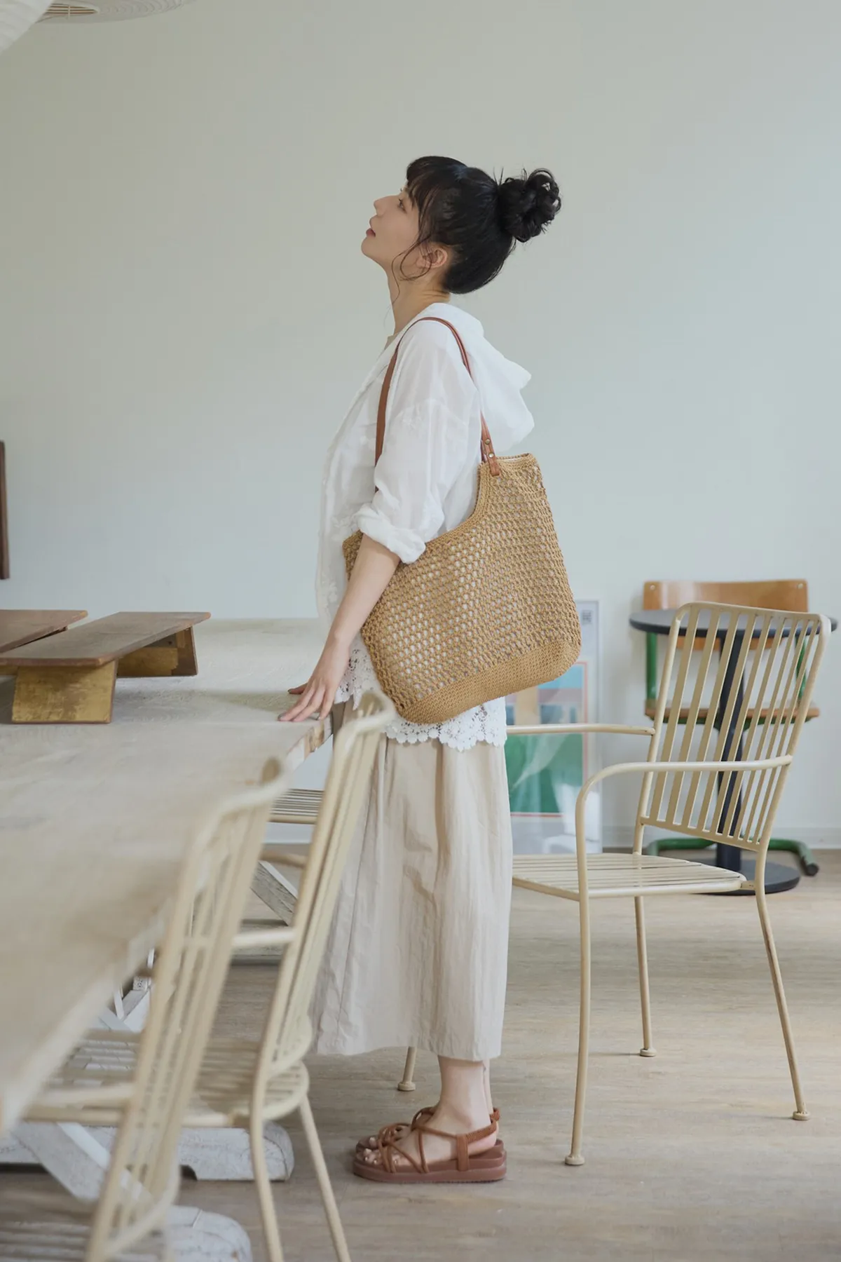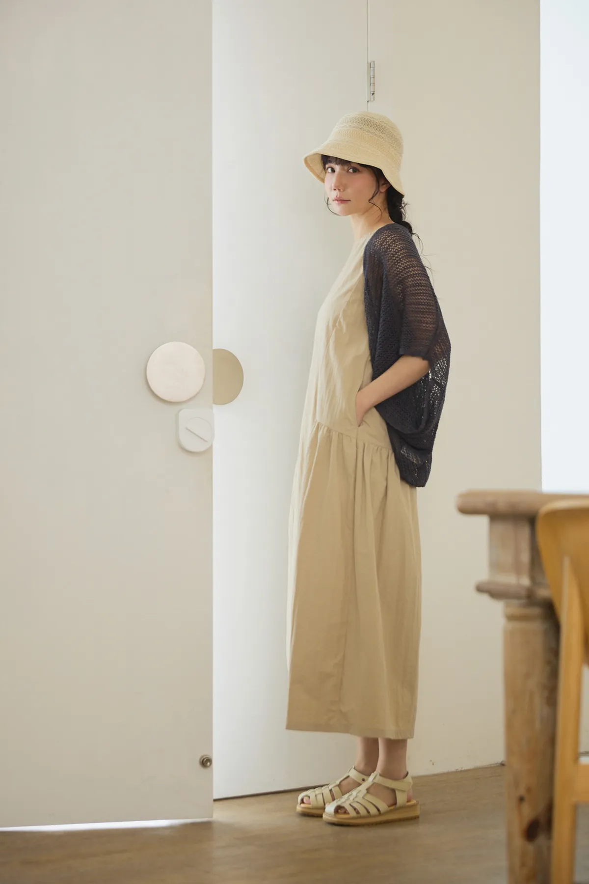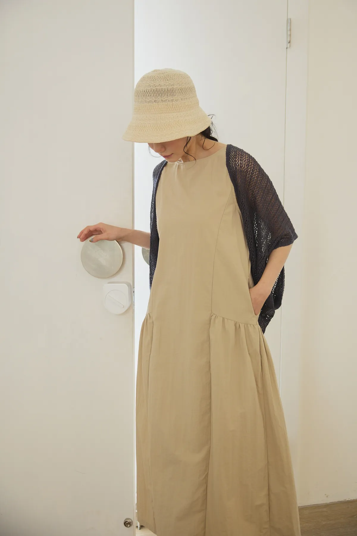 在洋裝腰圍和側邊設計立體車縫線與抓皺設計,讓穿起來的時候有抓腰的感覺,不會整件衣服順身而下像孕婦裝。穿起來既優雅又時尚!加上布料是有點紙感加上稍微防潑水設計,質感穿起來效果很挺,不會貼著皮膚,衣服本身布料關係,整件很輕盈沒有負擔感,夏季穿起來很涼爽,不會因爲是長洋就很有重量感喔