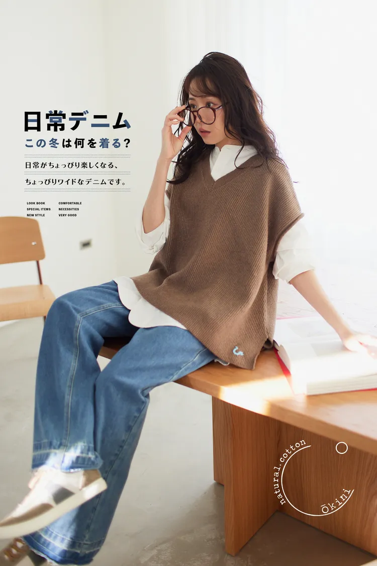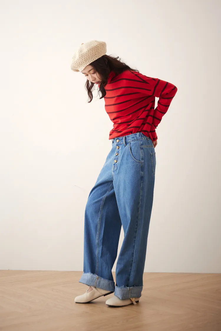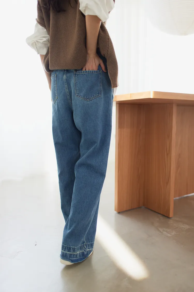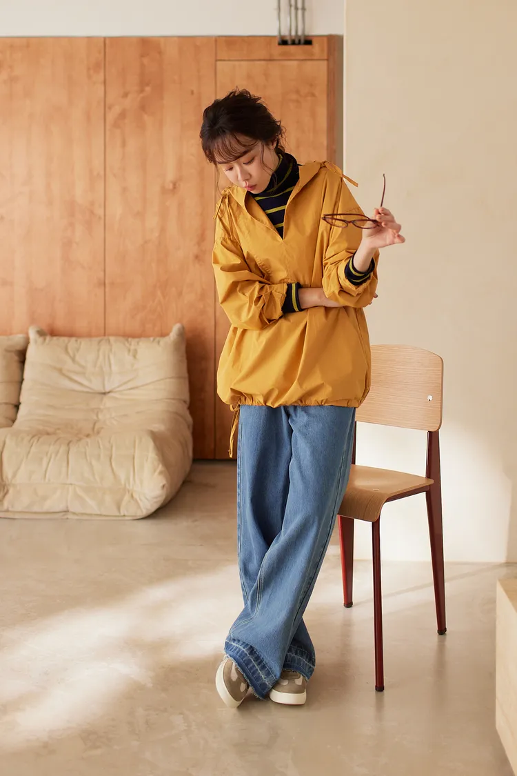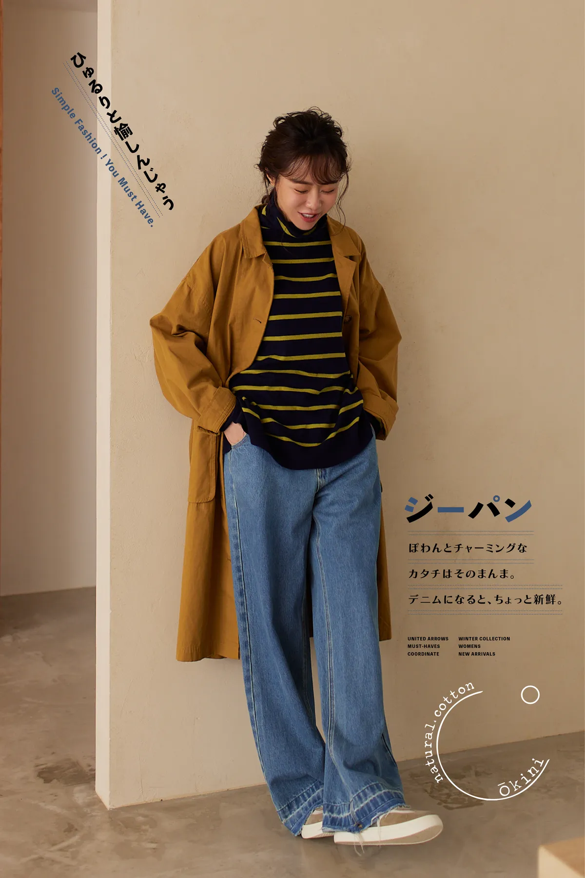 以牛仔襯衫夾克與直筒牛仔褲混搭,俐落褲款剪裁為臀部和大腿瞬間顯瘦,使整體看起來既不隨便還可呈現率性個性。腰圍友善,背後半圈鬆緊帶設計,牛仔水洗色是採用二手水洗工法,刻意營造出古董褲的色澤,非常好看!