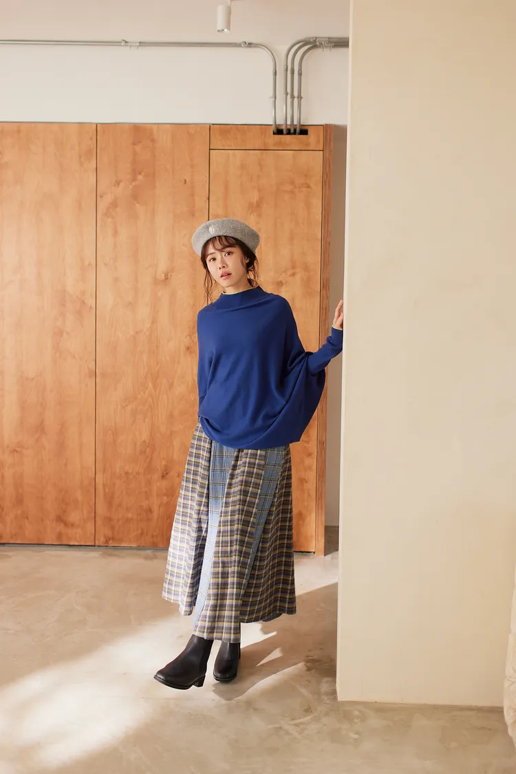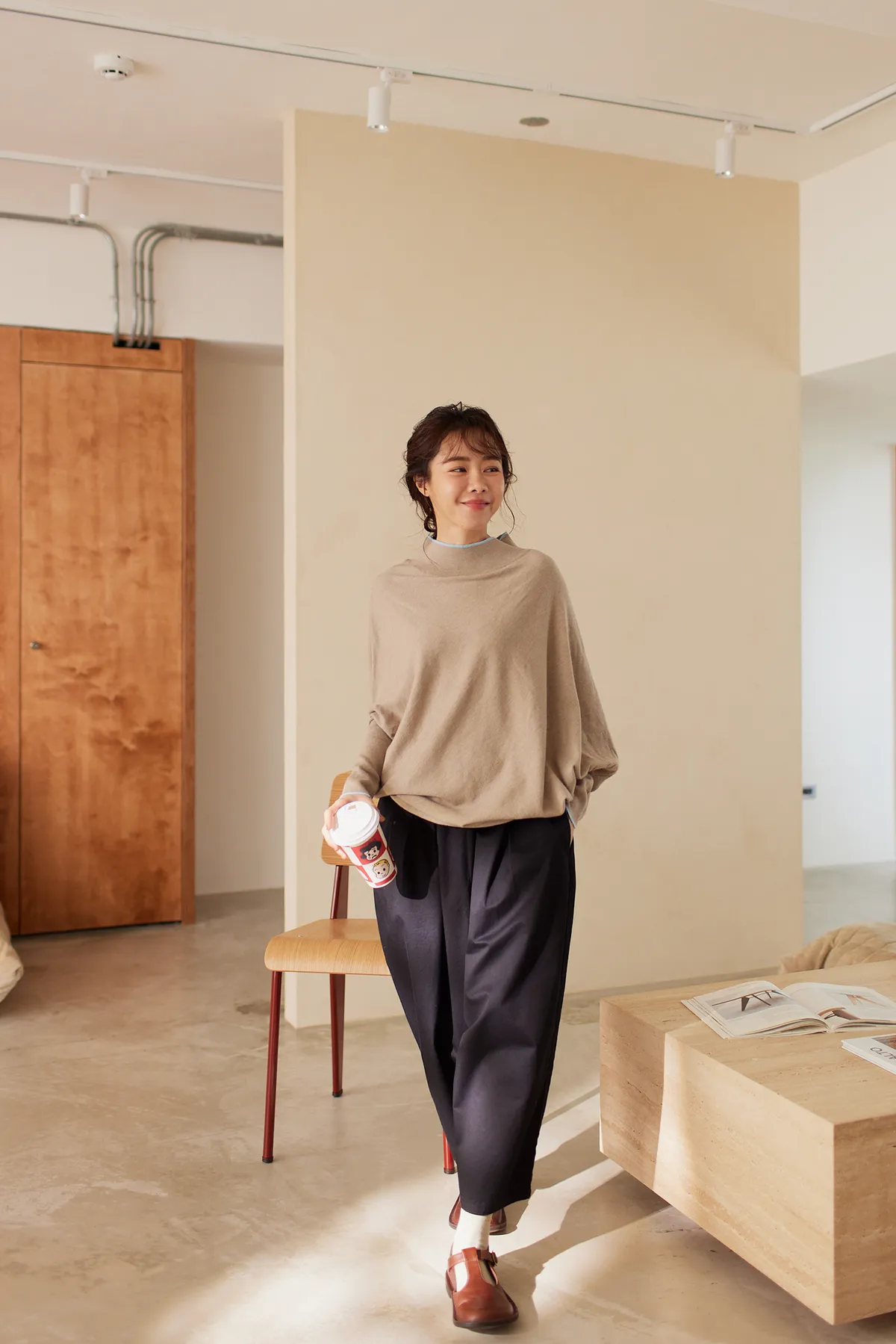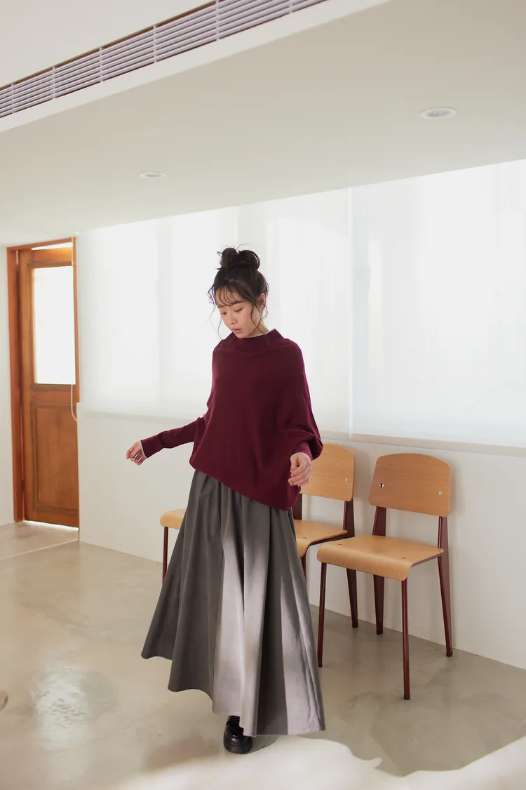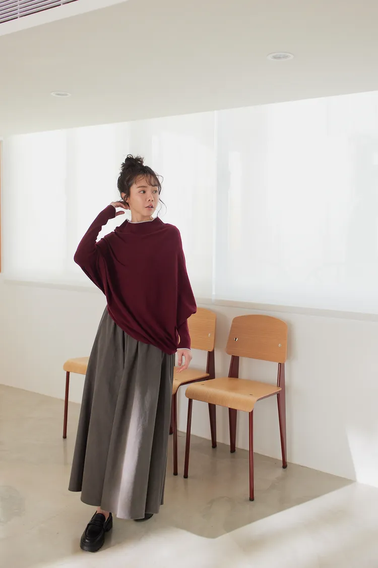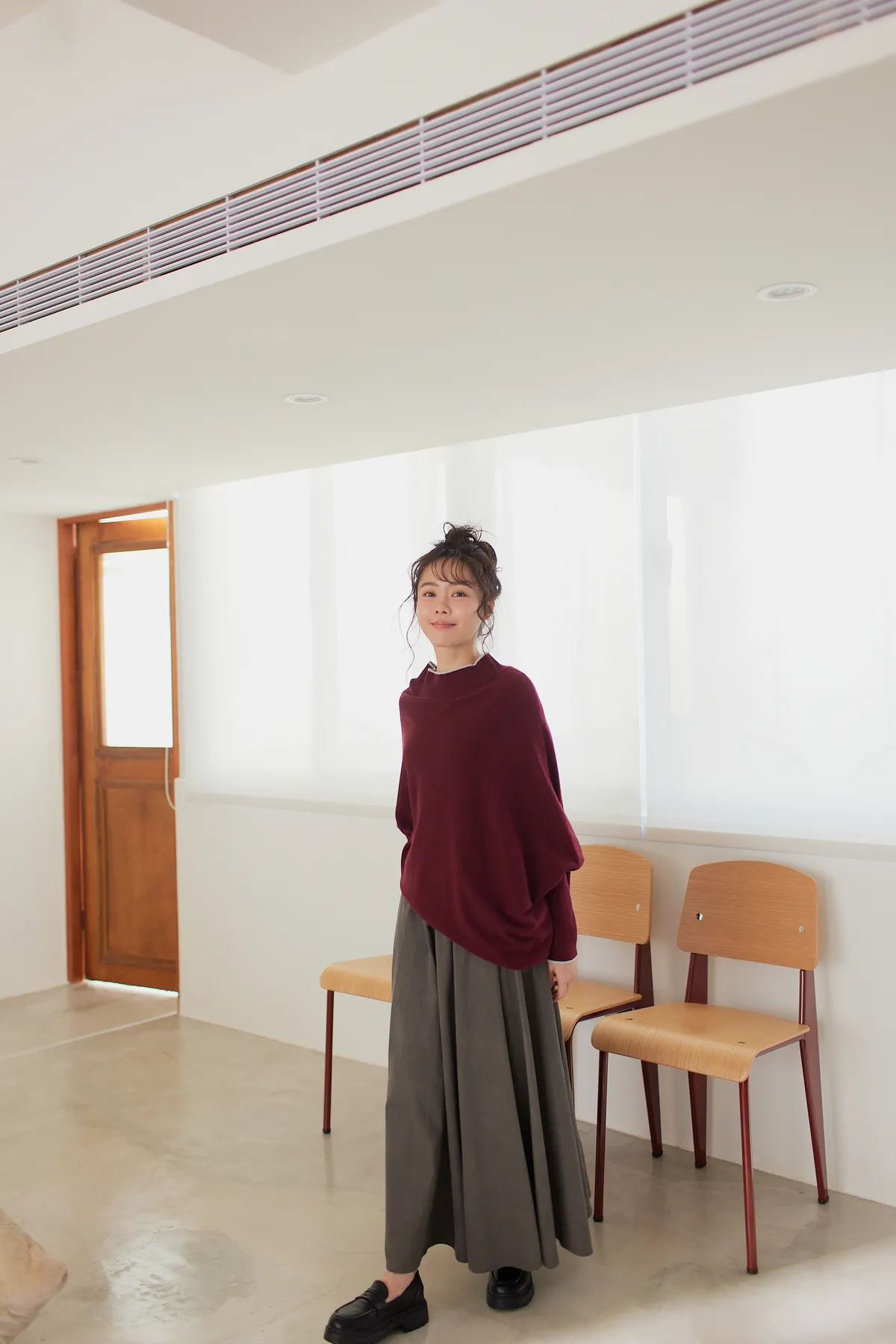 身體是斜斜的四方形,穿上的時候,腰部自然左右高低的堆積非常好看,完全隱藏肉肉。高寬領的設計,領口開開的不會憋著脖子,又能保暖,視覺感顯瘦。不管搭配褲子或裙子,甚至把連身的打底洋裝穿進去搭配都沒問題。非常好看,又有型的一件毛衣。