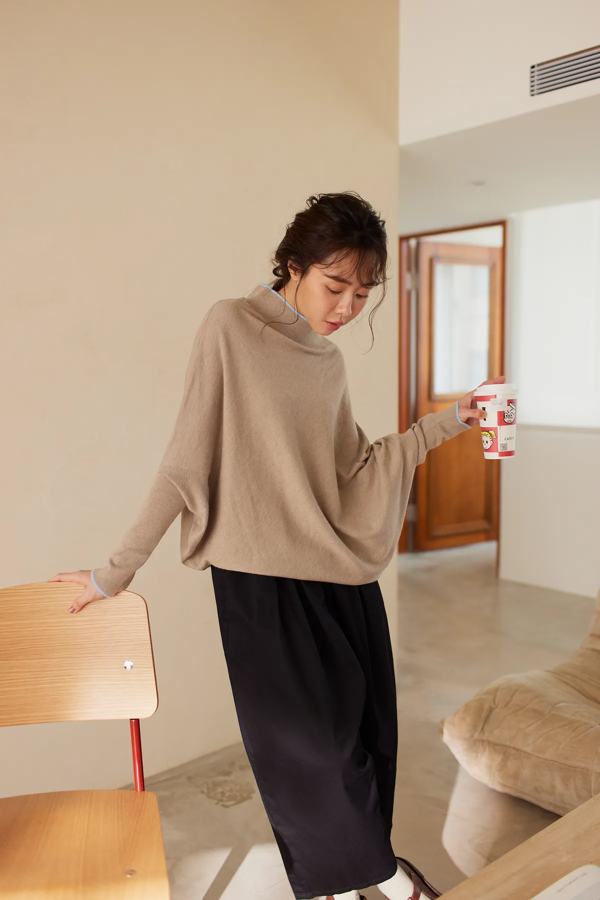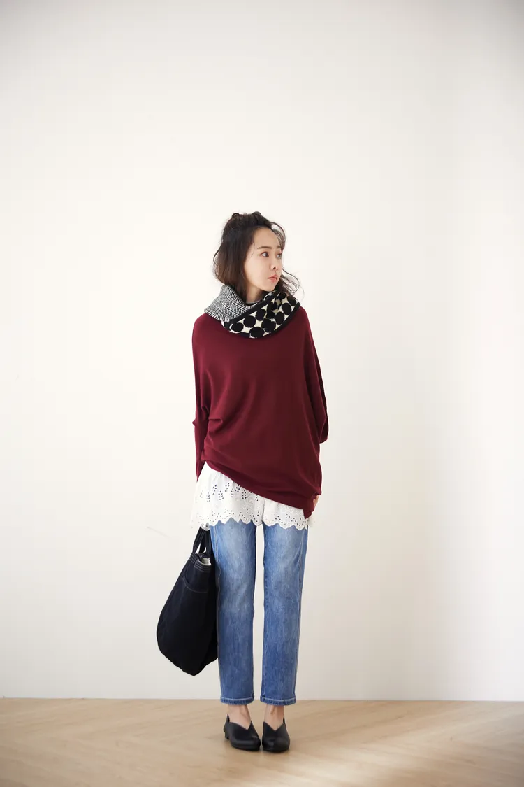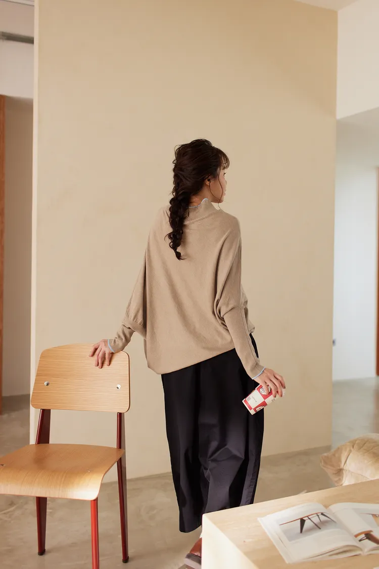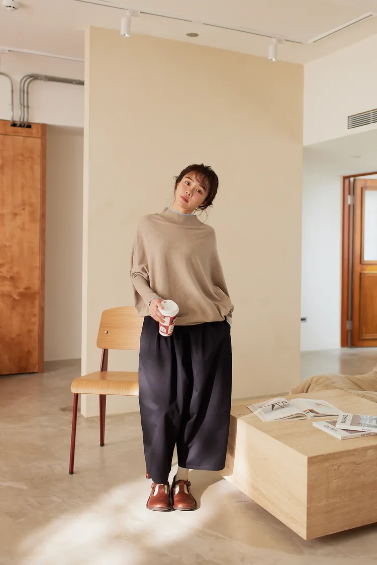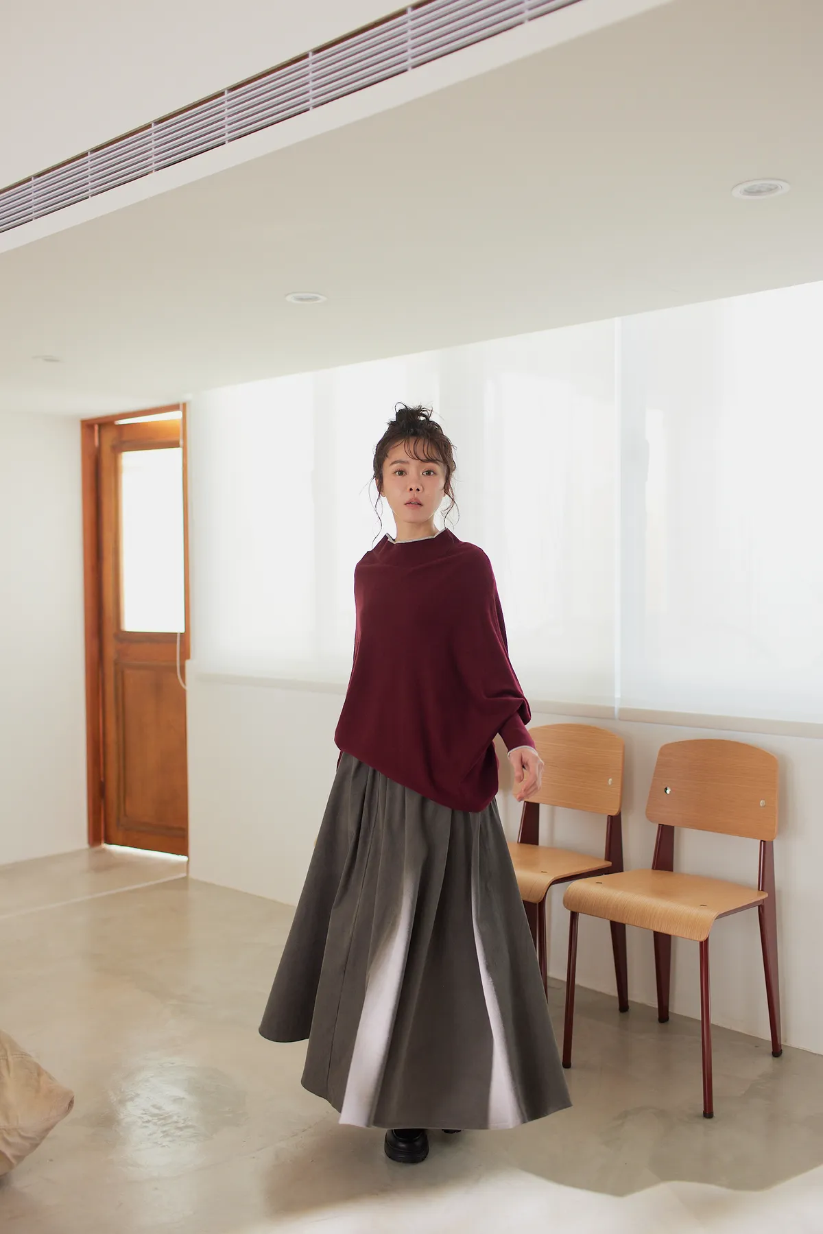 身體是斜斜的四方形,穿上的時候,腰部自然左右高低的堆積非常好看,完全隱藏肉肉。高寬領的設計,領口開開的不會憋著脖子,又能保暖,視覺感顯瘦。不管搭配褲子或裙子,甚至把連身的打底洋裝穿進去搭配都沒問題。非常好看,又有型的一件毛衣。