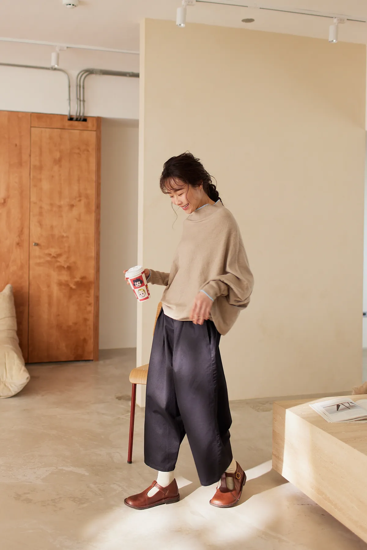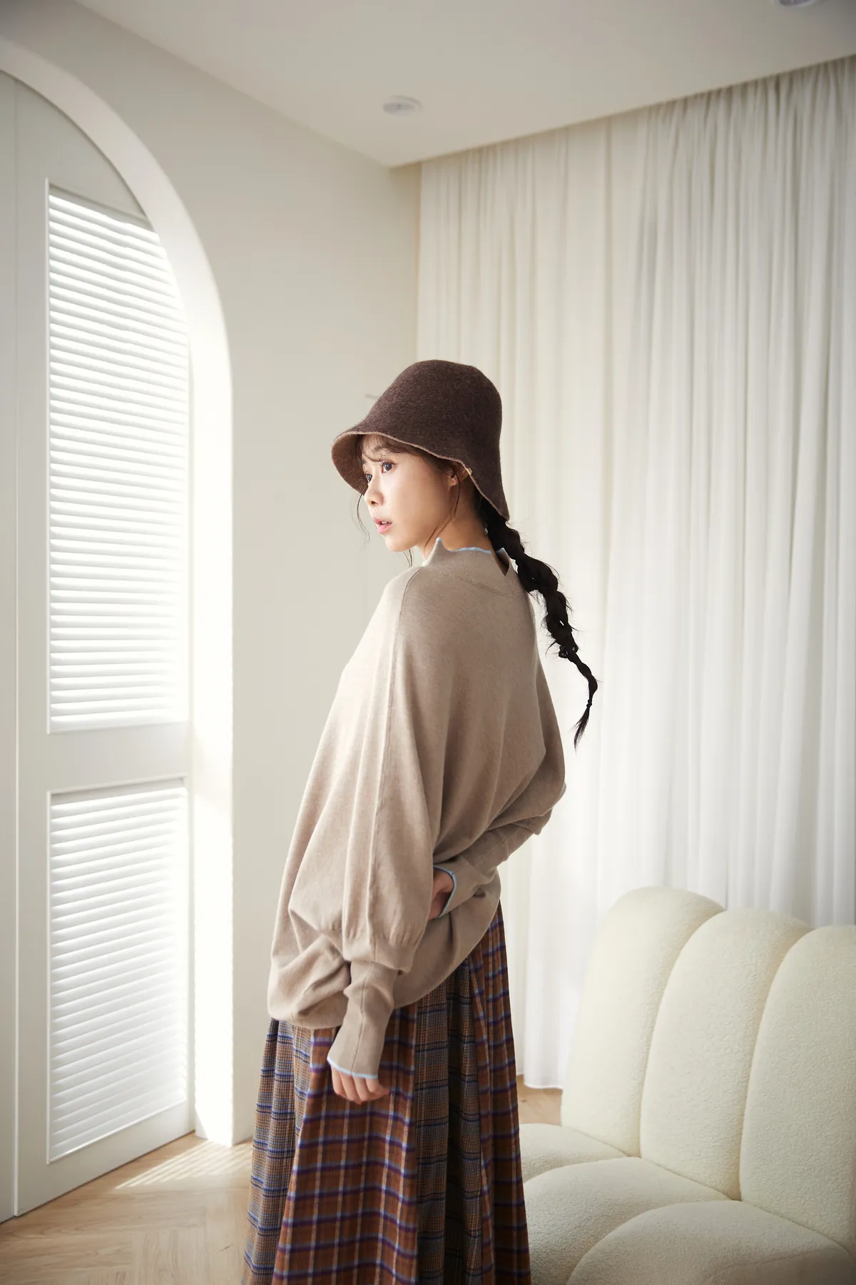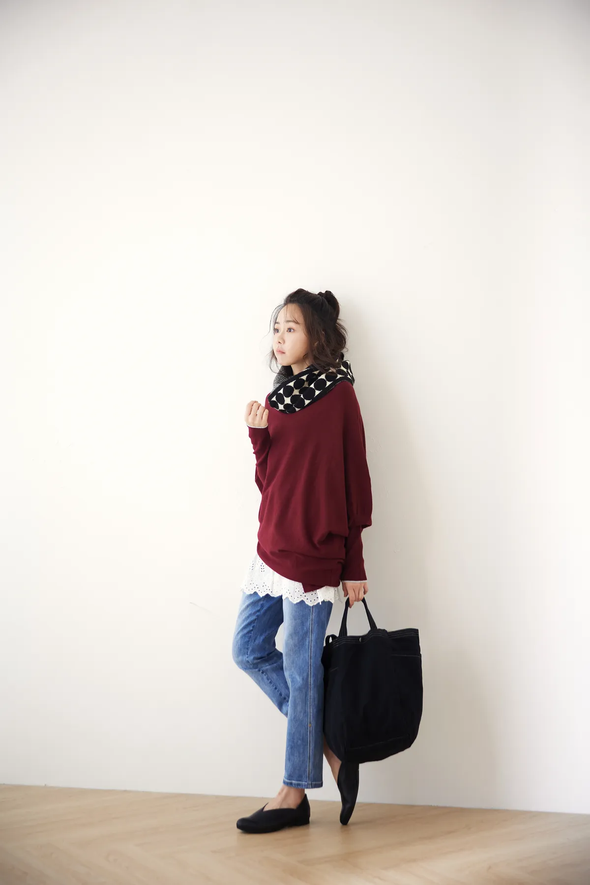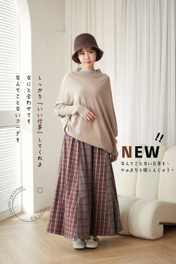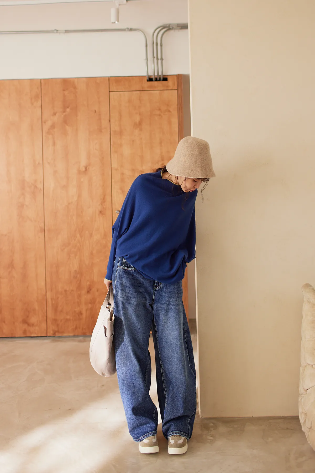 身體是斜斜的四方形,穿上的時候,腰部自然左右高低的堆積非常好看,完全隱藏肉肉。高寬領的設計,領口開開的不會憋著脖子,又能保暖,視覺感顯瘦。不管搭配褲子或裙子,甚至把連身的打底洋裝穿進去搭配都沒問題。非常好看,又有型的一件毛衣。
