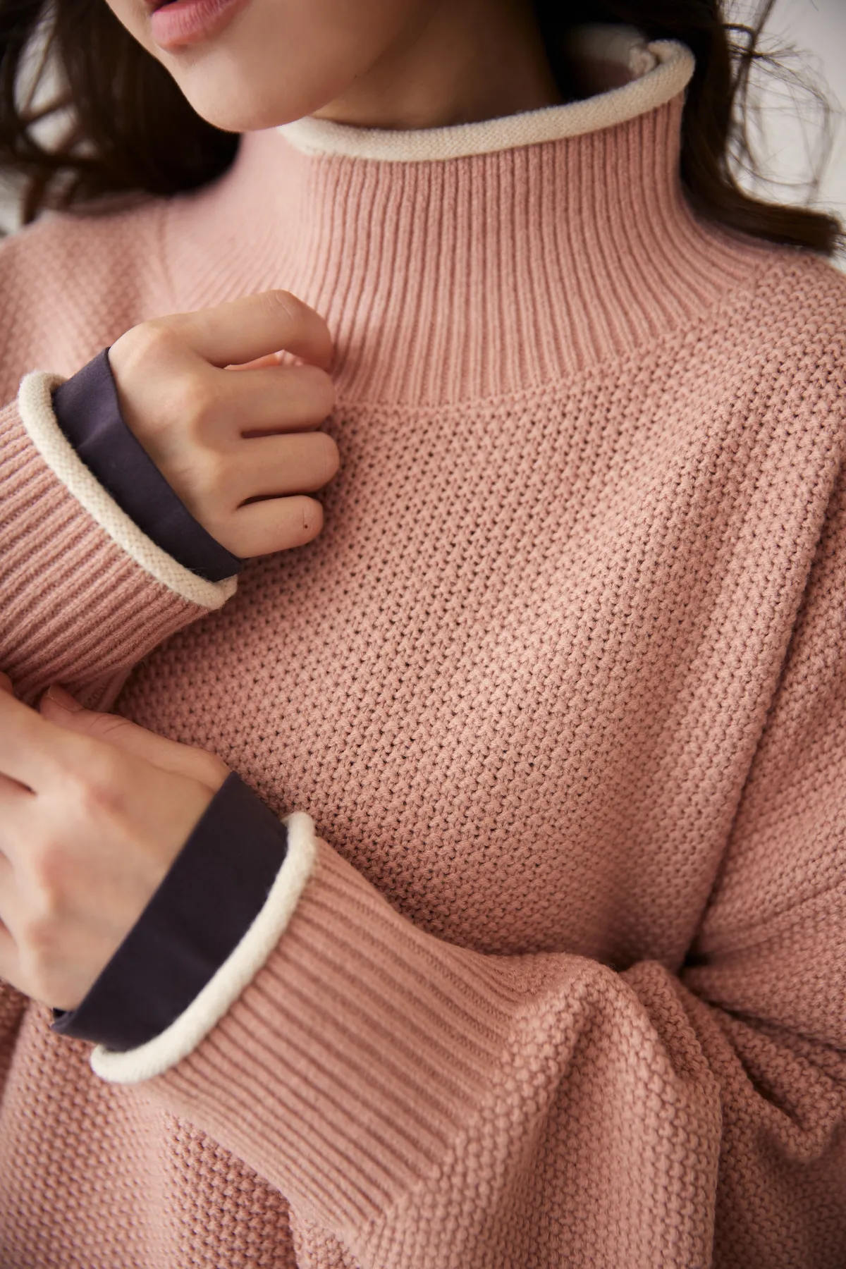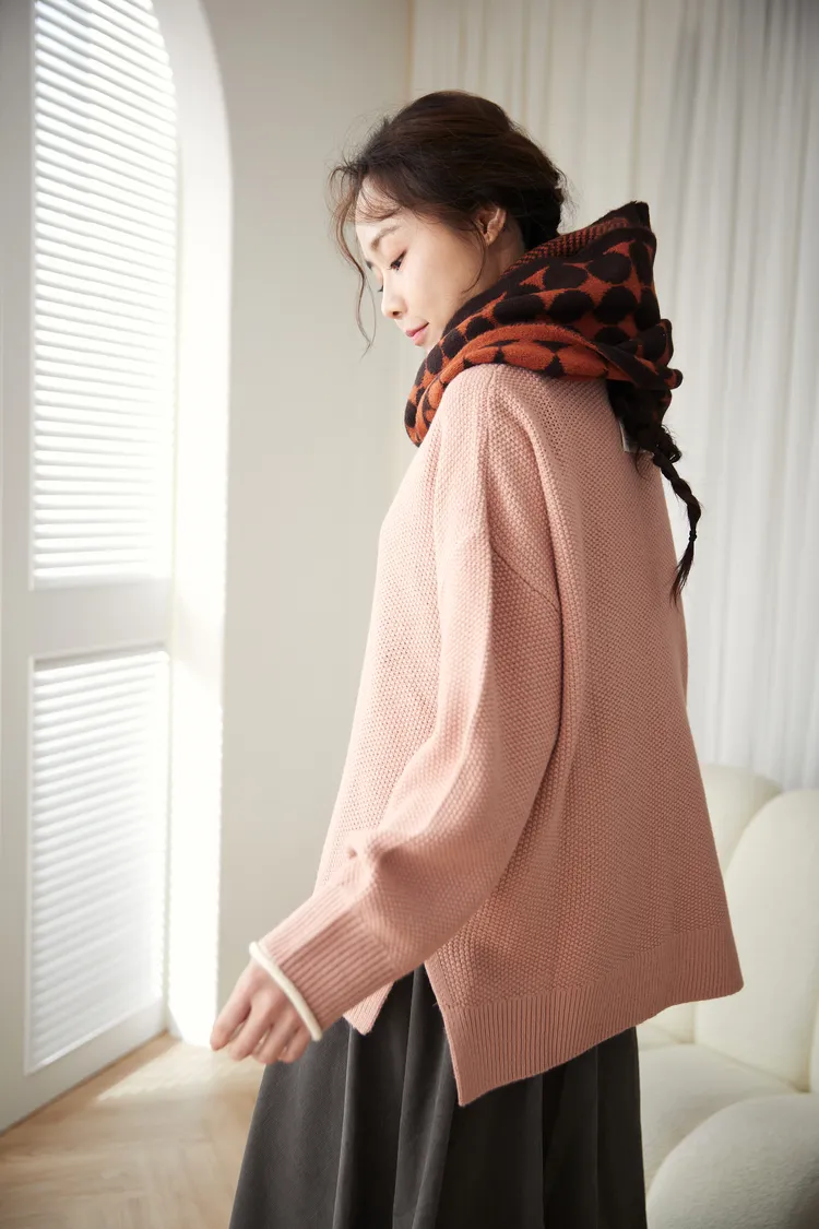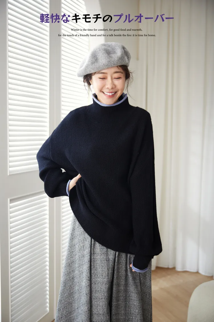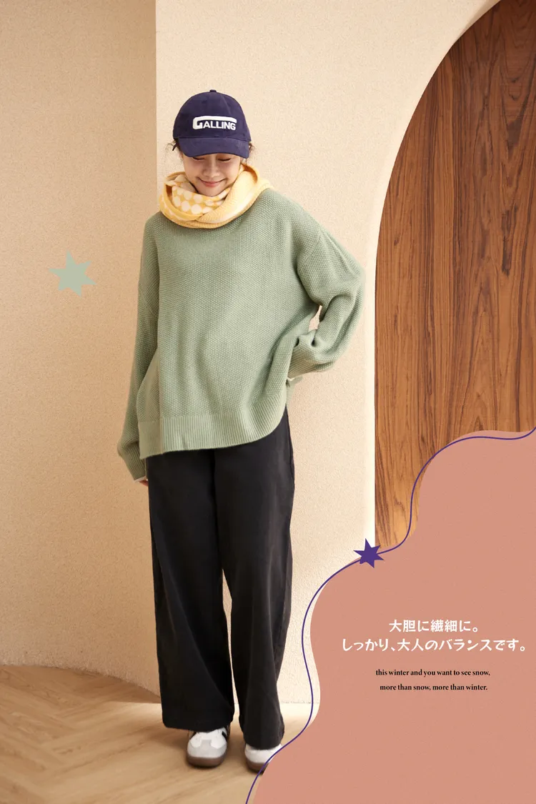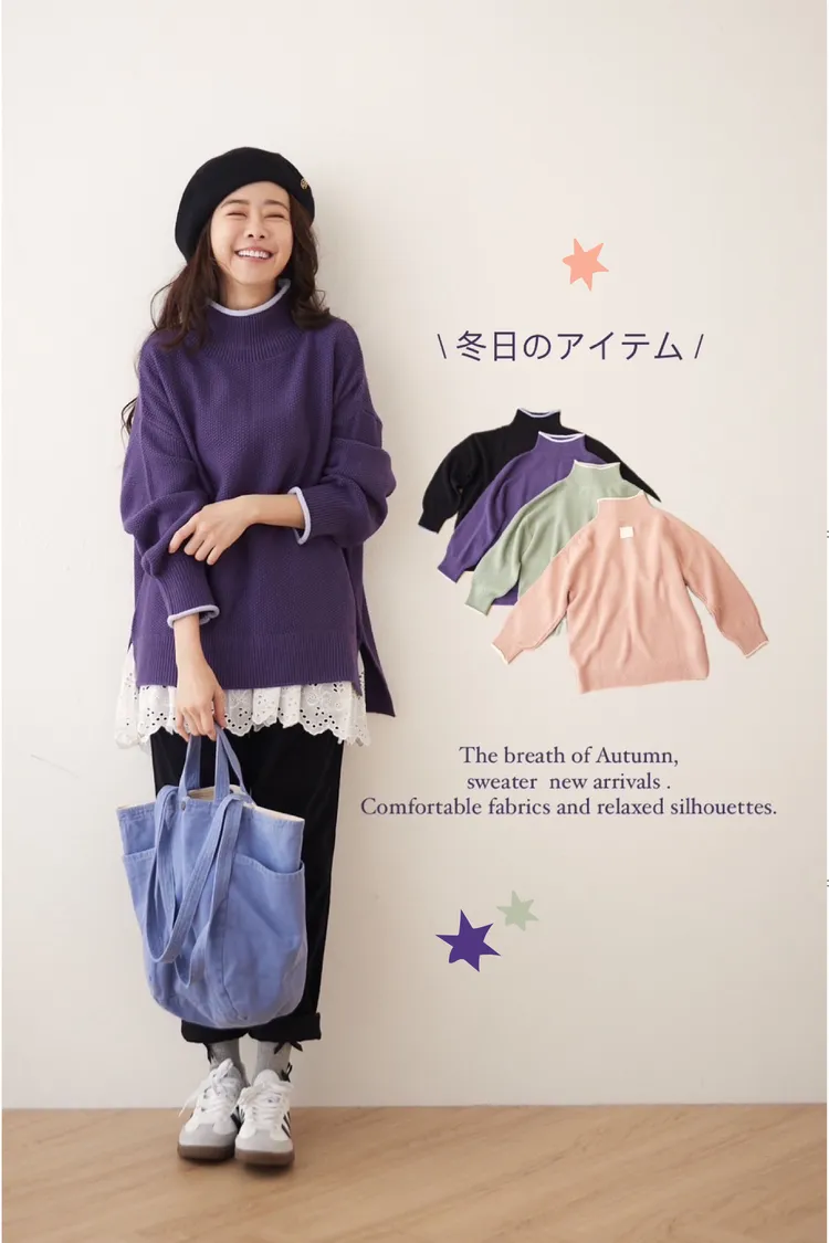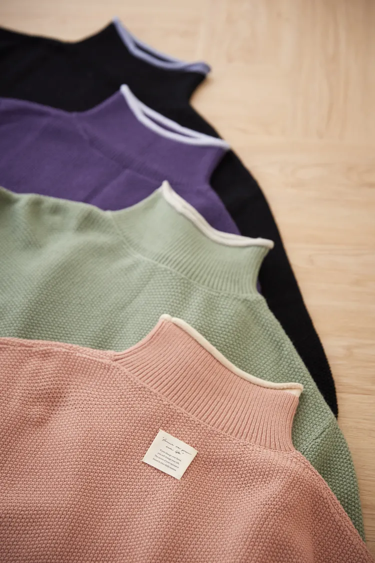 想穿高領毛衣但又害怕勒脖子那就選這件沒錯!喔喔喔!這件毛衣好特別,在領口邊緣利用跳色帶出層次感,不再只是單單一件毛衣而已,就連織法也很特別,是立體球球拼接在一起的挺版織紋,穿起來有點空氣感,不會厚重的壓在身上~