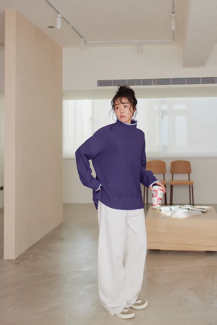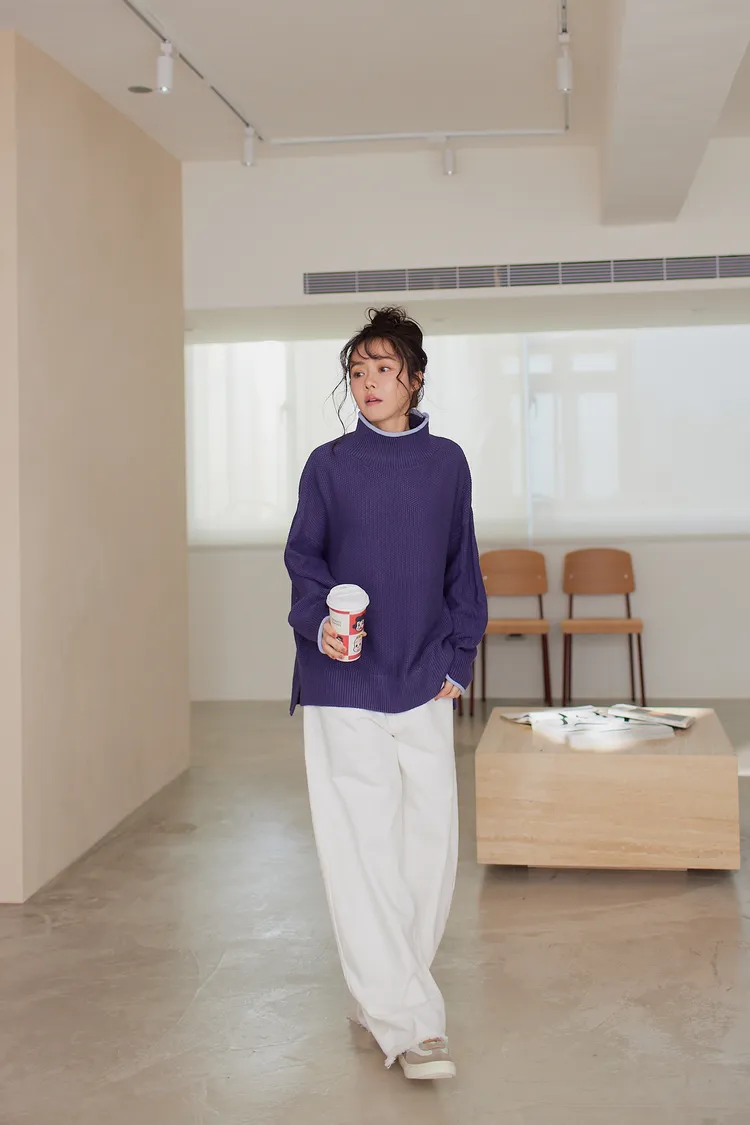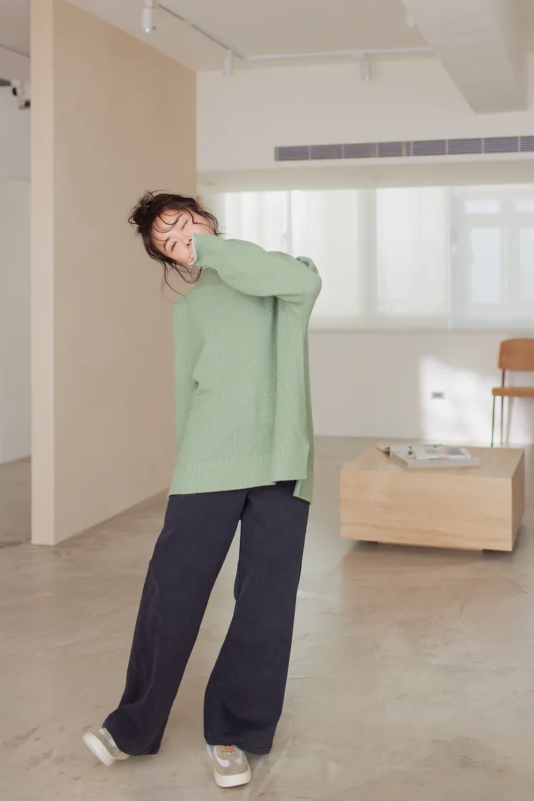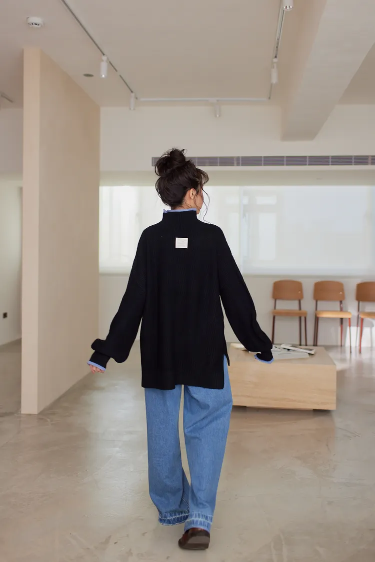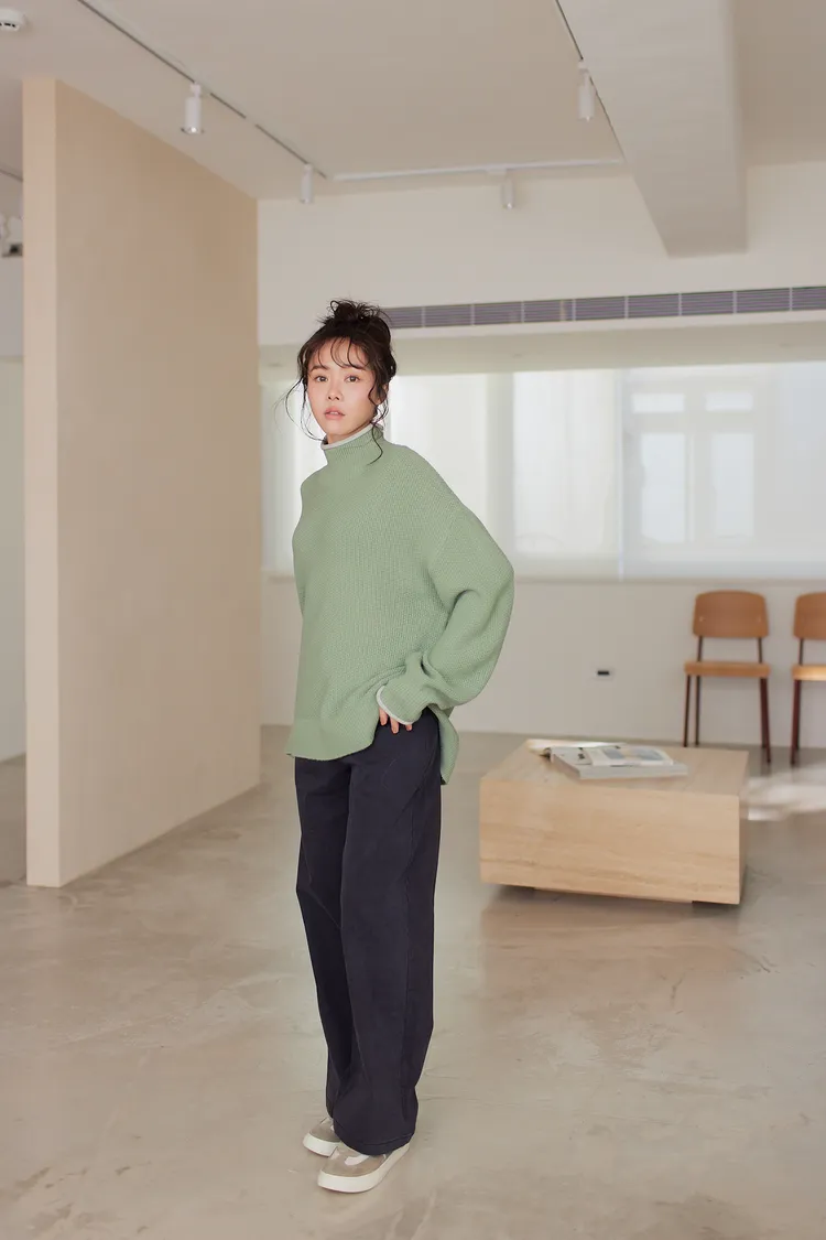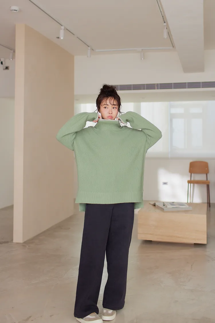 我最愛它的鬆鬆的高領設計,鬆鬆的不會整個勒住脖子,但又有高領帶來的保暖度,這樣鬆鬆的高領設計也不會因為太緊而讓整個臉看起來很腫!鬆弛感的高領,尺寸很大,外圈有小卷邊設計,這樣自然小卷邊設計還能帶出休閒感。