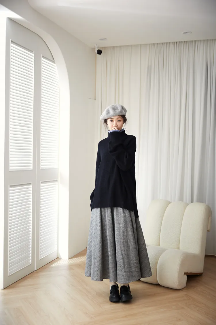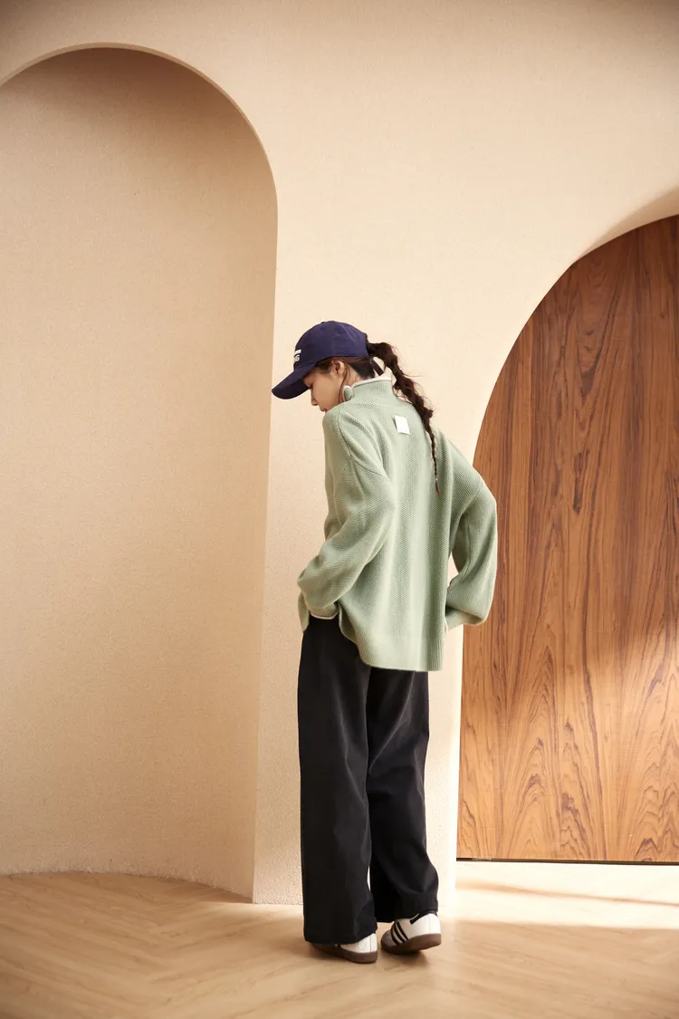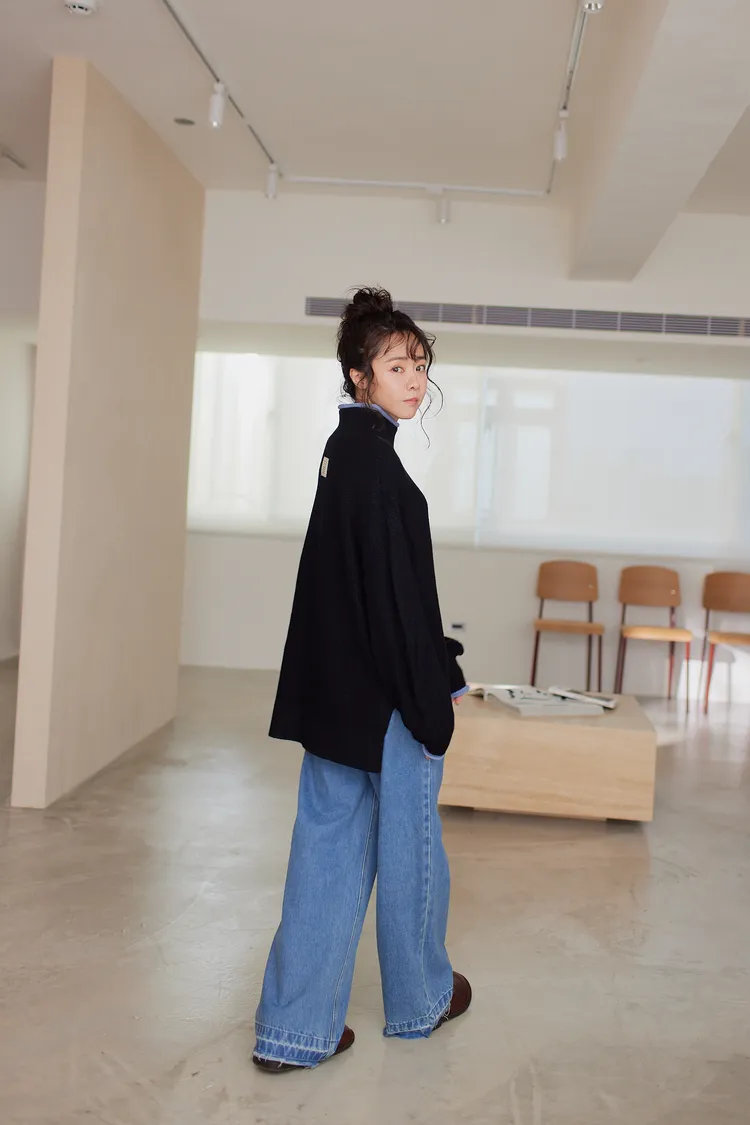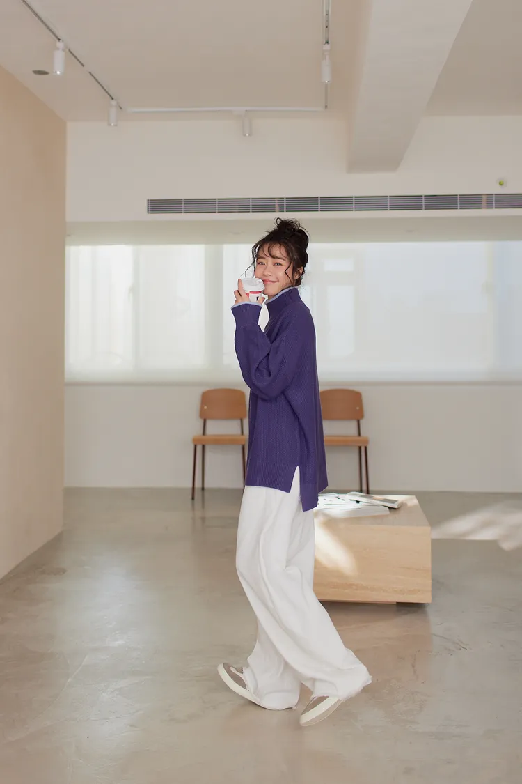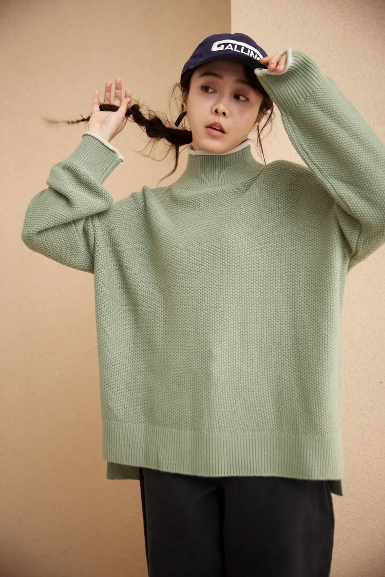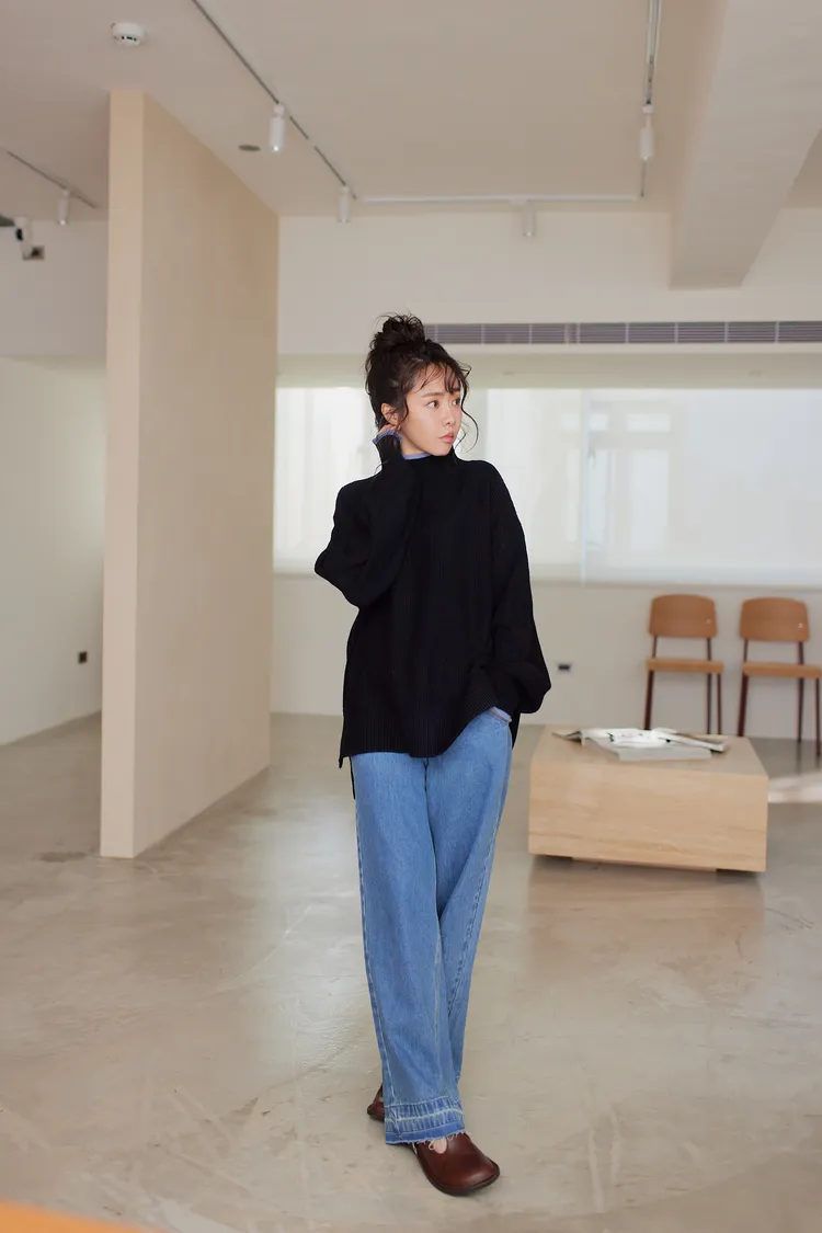 我最愛它的鬆鬆的高領設計,鬆鬆的不會整個勒住脖子,但又有高領帶來的保暖度,這樣鬆鬆的高領設計也不會因為太緊而讓整個臉看起來很腫!鬆弛感的高領,尺寸很大,外圈有小卷邊設計,這樣自然小卷邊設計還能帶出休閒感。