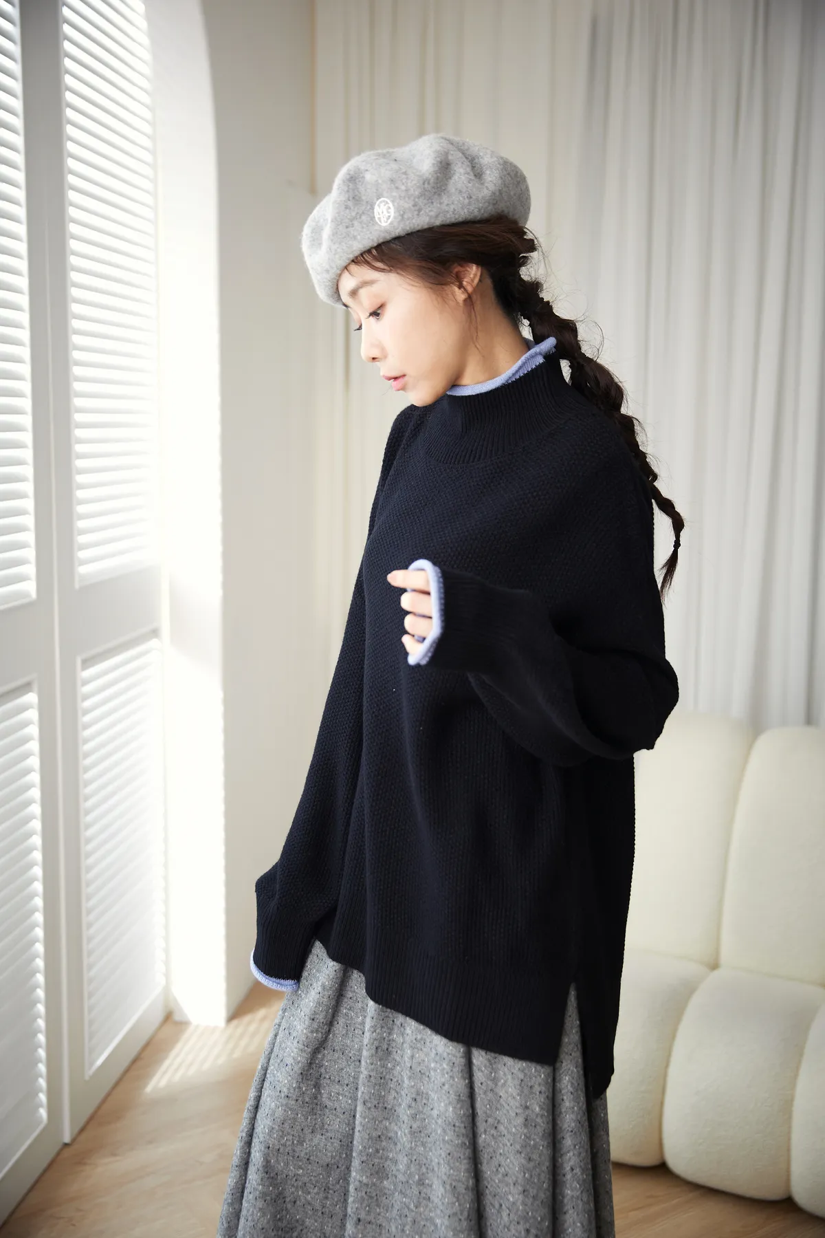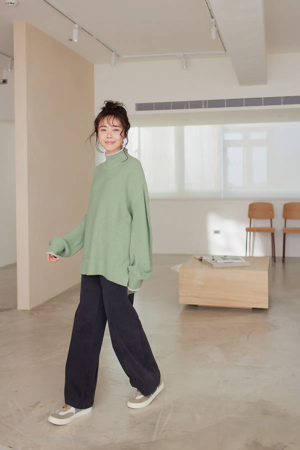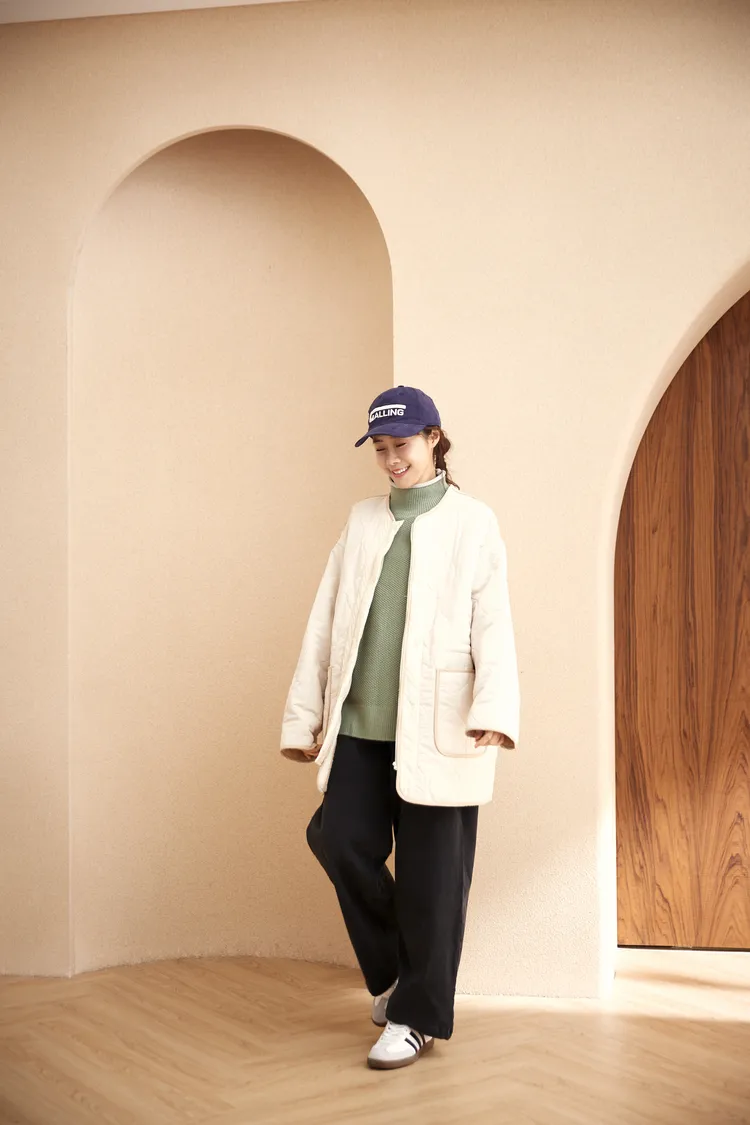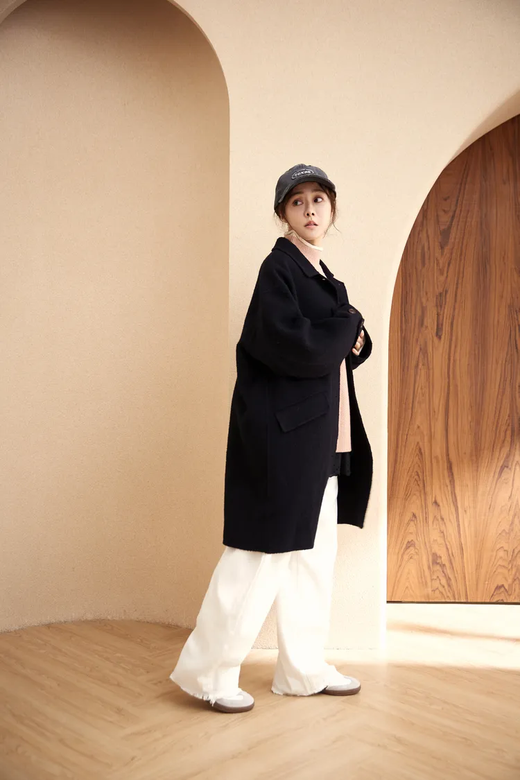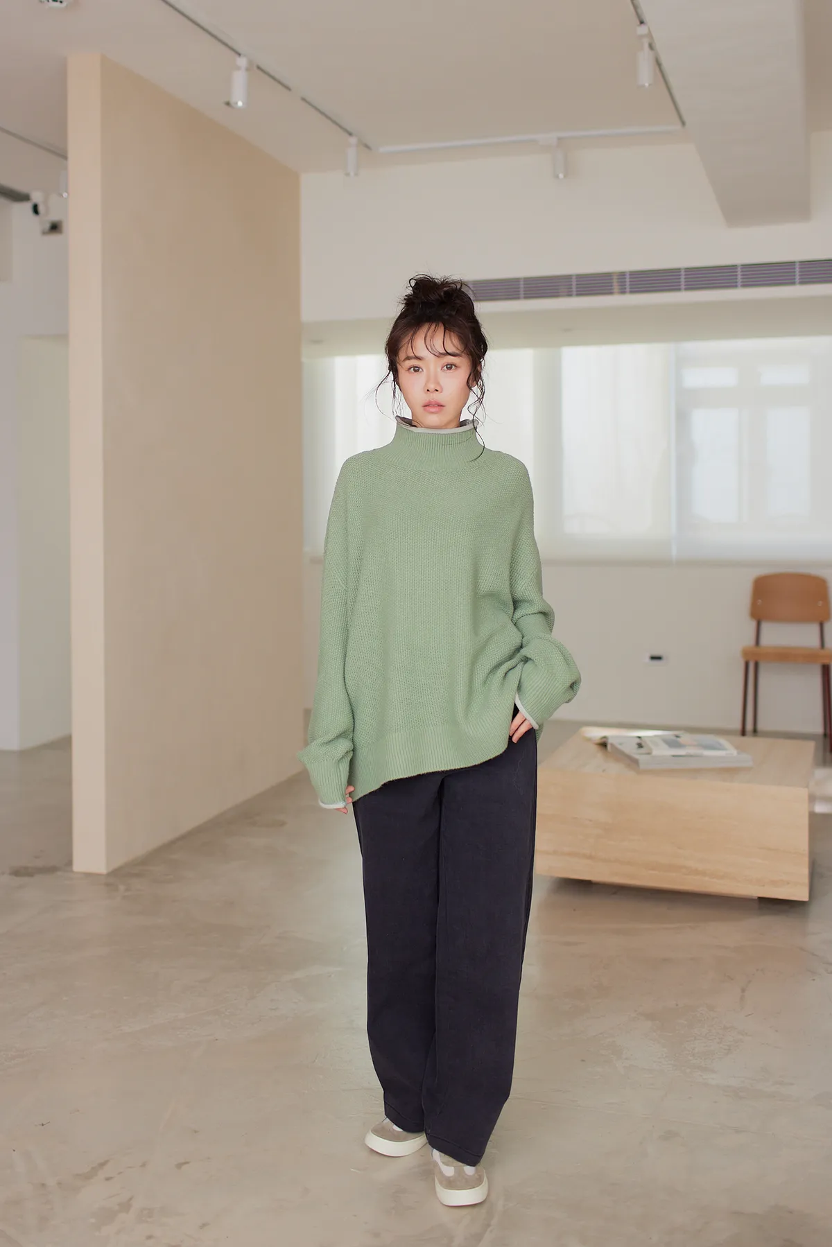我最愛它的鬆鬆的高領設計,鬆鬆的不會整個勒住脖子,但又有高領帶來的保暖度,這樣鬆鬆的高領設計也不會因為太緊而讓整個臉看起來很腫!鬆弛感的高領,尺寸很大,外圈有小卷邊設計,這樣自然小卷邊設計還能帶出休閒感。