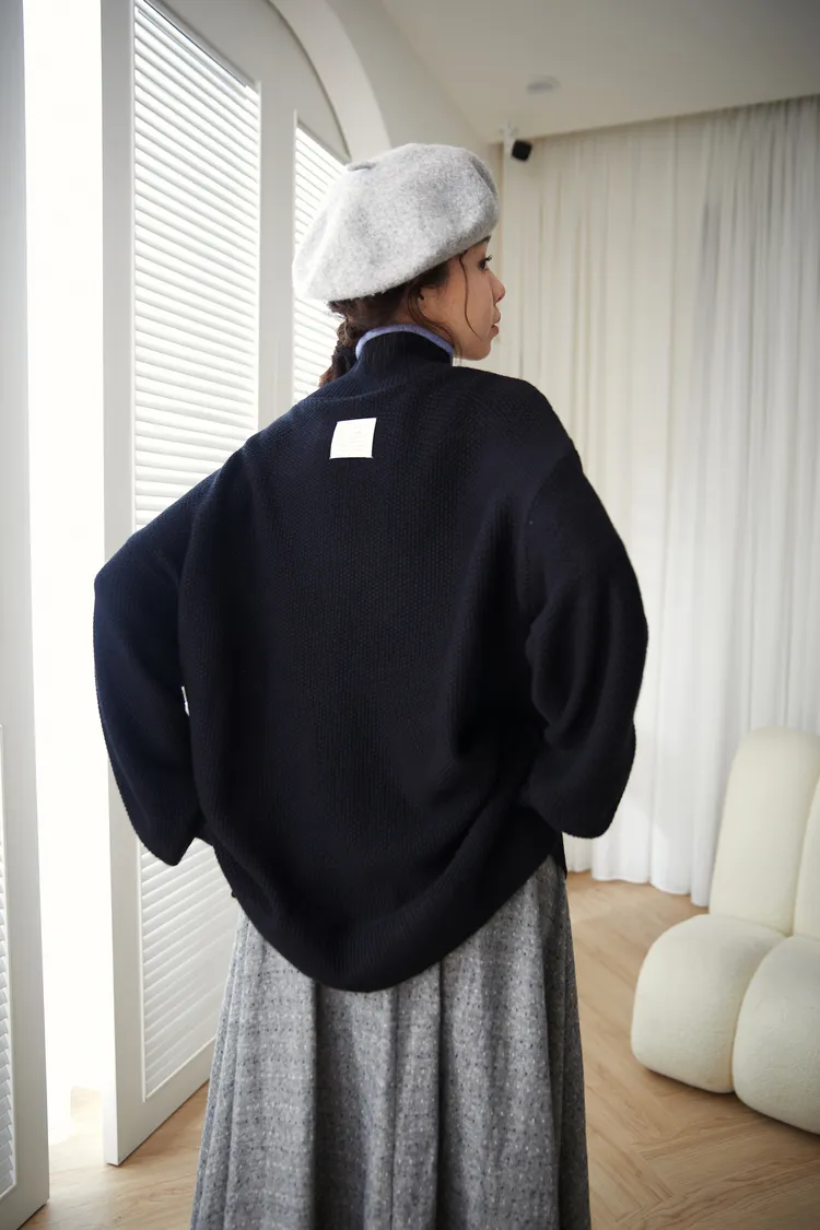 長度也可以搭配任何長裙跟褲子都沒有違和。紗線是羊毛風格粗針紗線,有羊毛的粗獷外表,沒有羊毛的臭臭跟搔癢~超級推薦!後面還有個小布貼設計,連背後看起來都超有型喔!