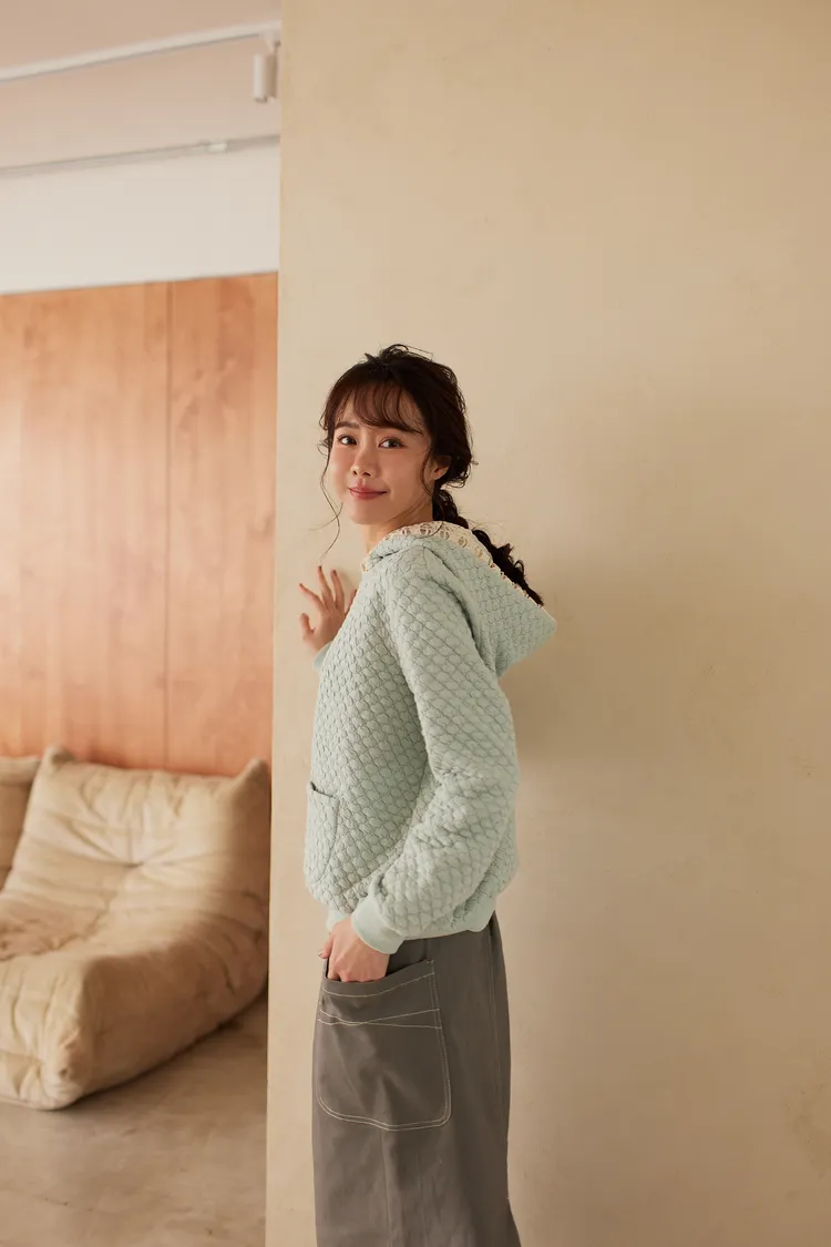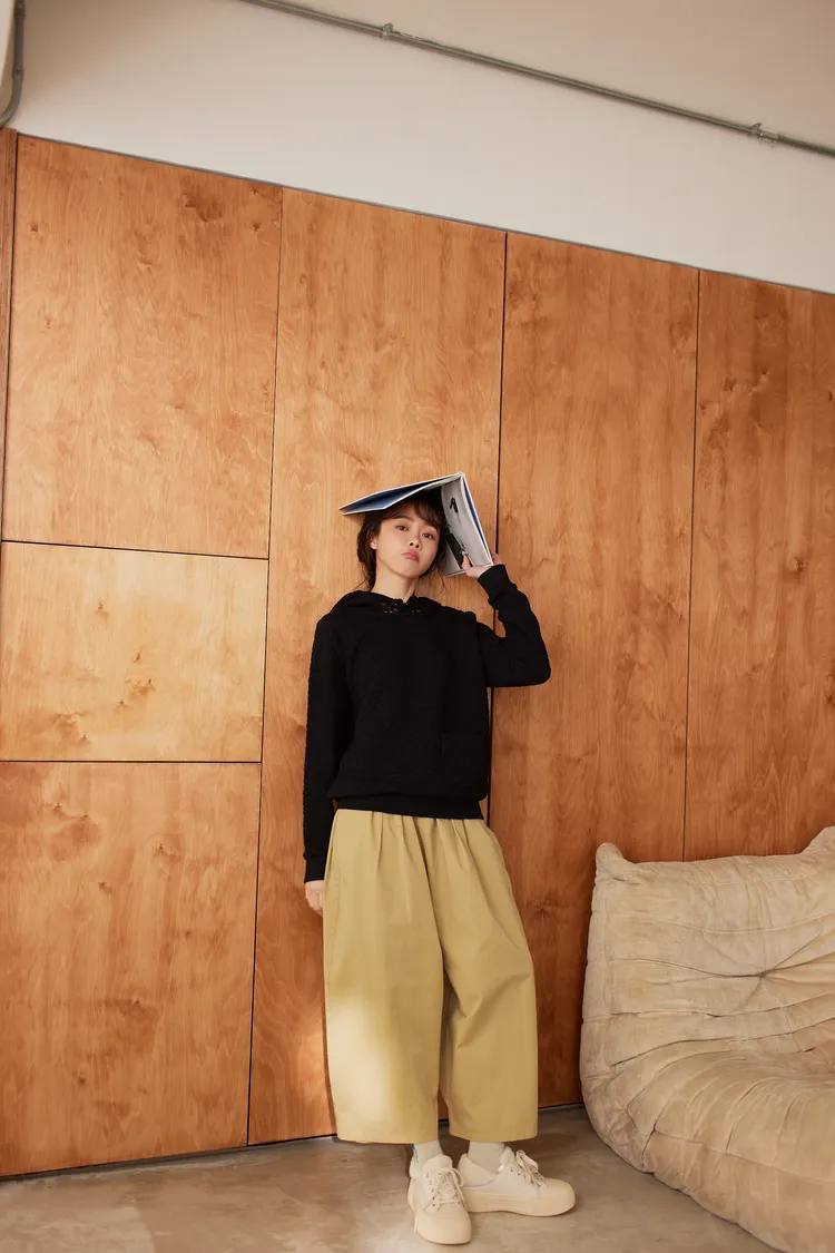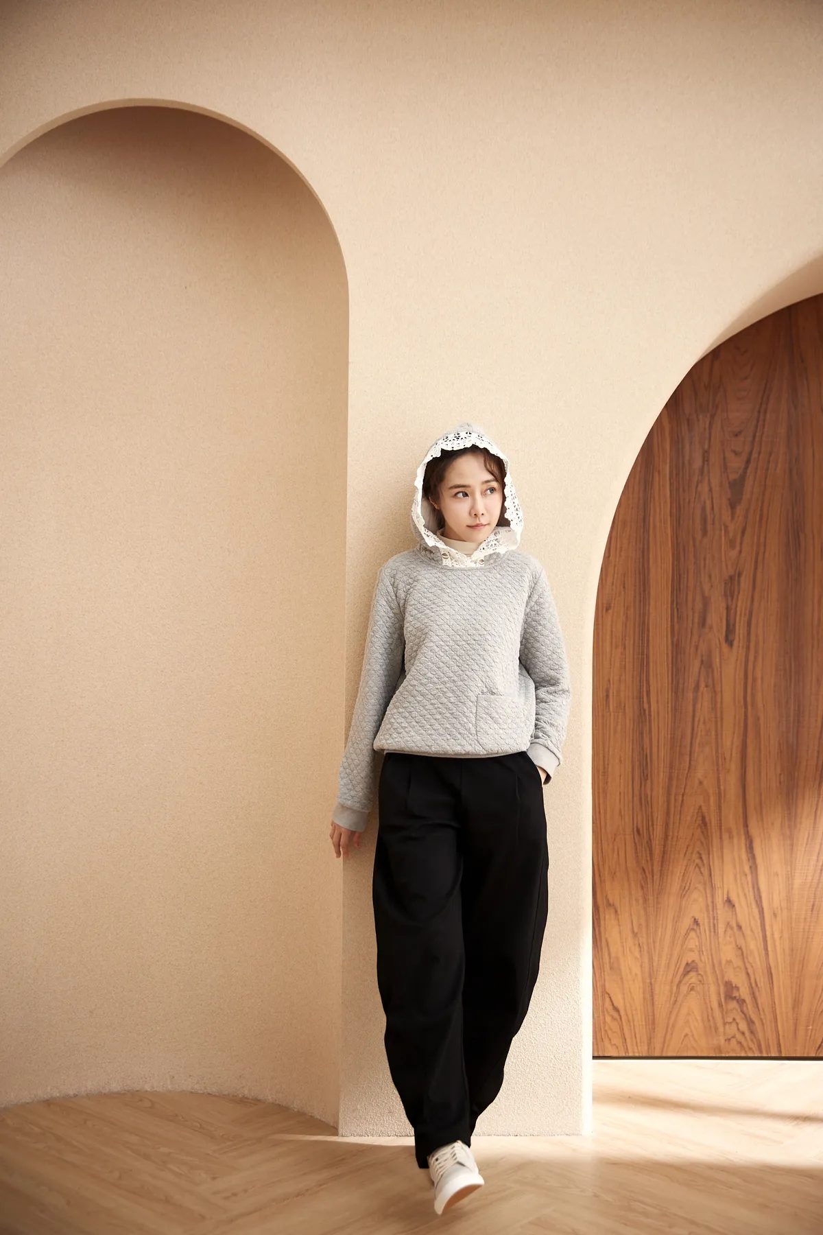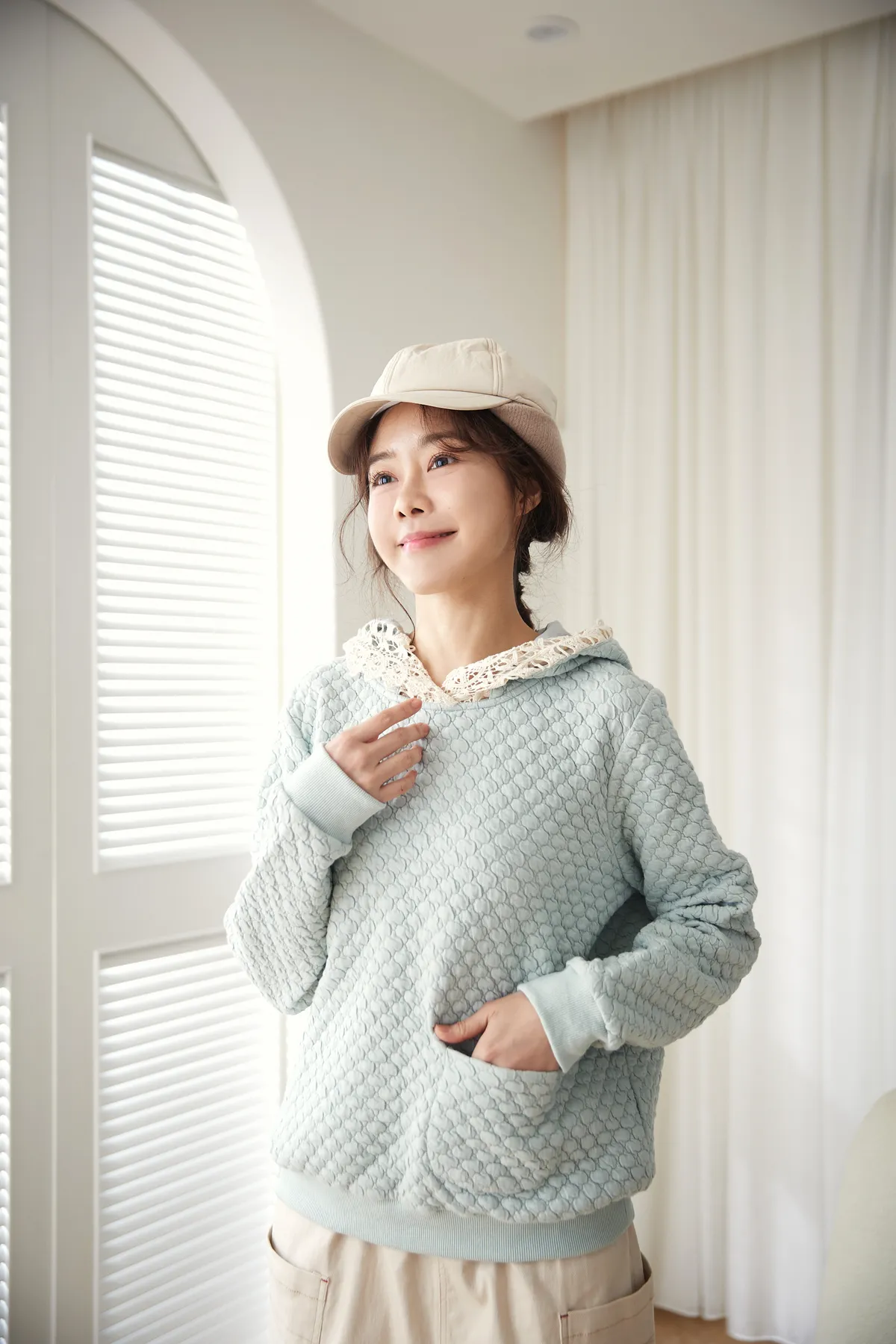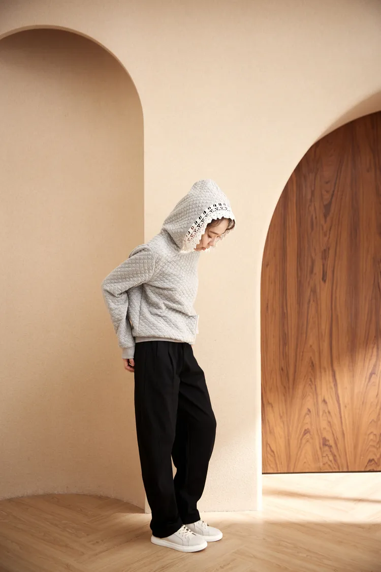帽子外使用全棉的經編蕾絲,搭配澎澎布棉,非常可愛,無論從背面側面都能看到微微的蕾絲,好精緻的樣式!剛剛好的版型,不會因為穿著帽T而看起來臃腫沒精神,這件適合搭配各種寬鬆下半身,能提升身材比例,還有個小口袋增添造型感。