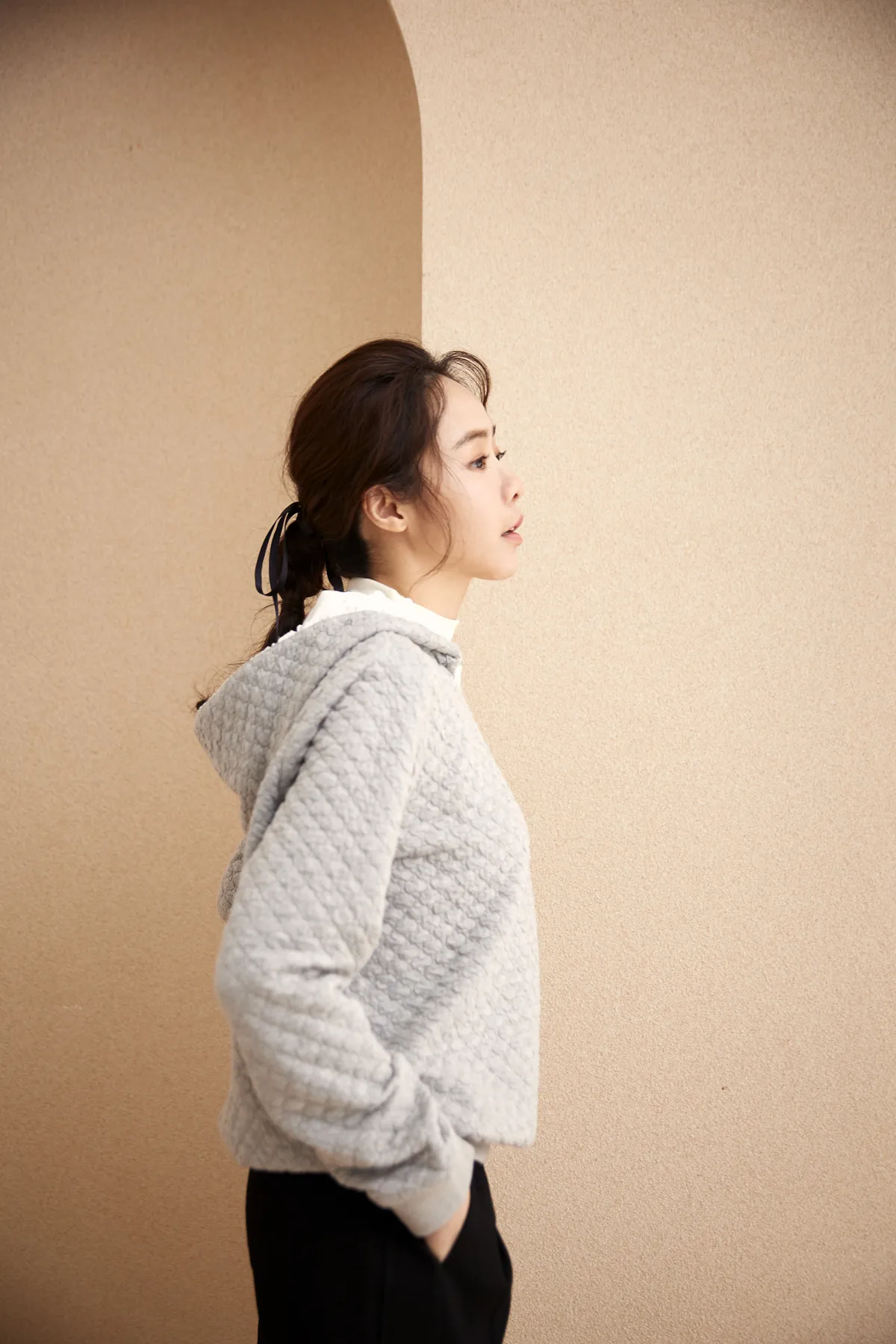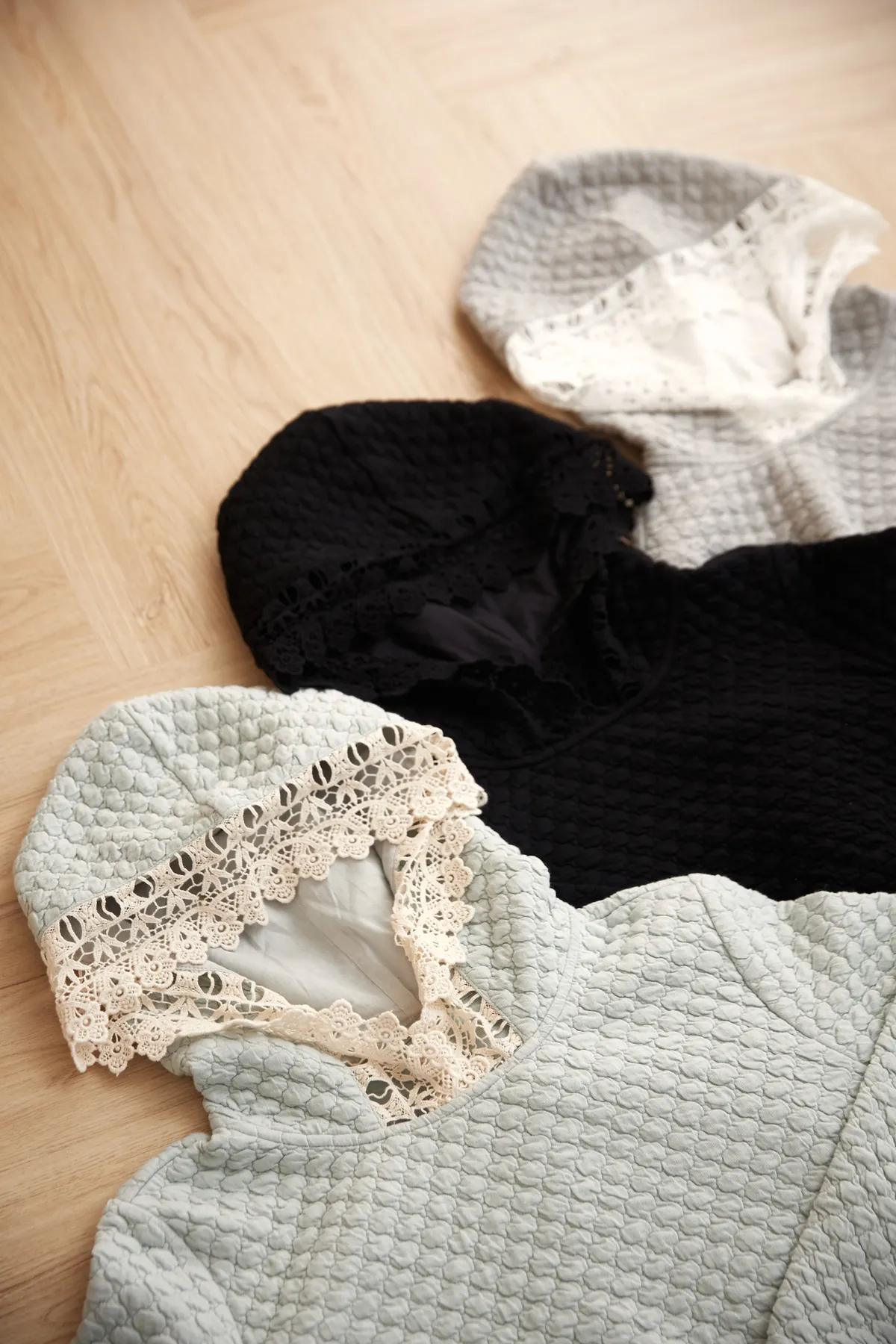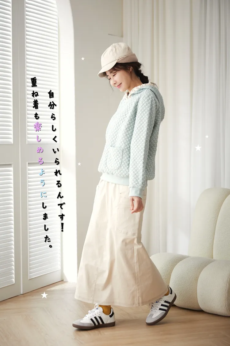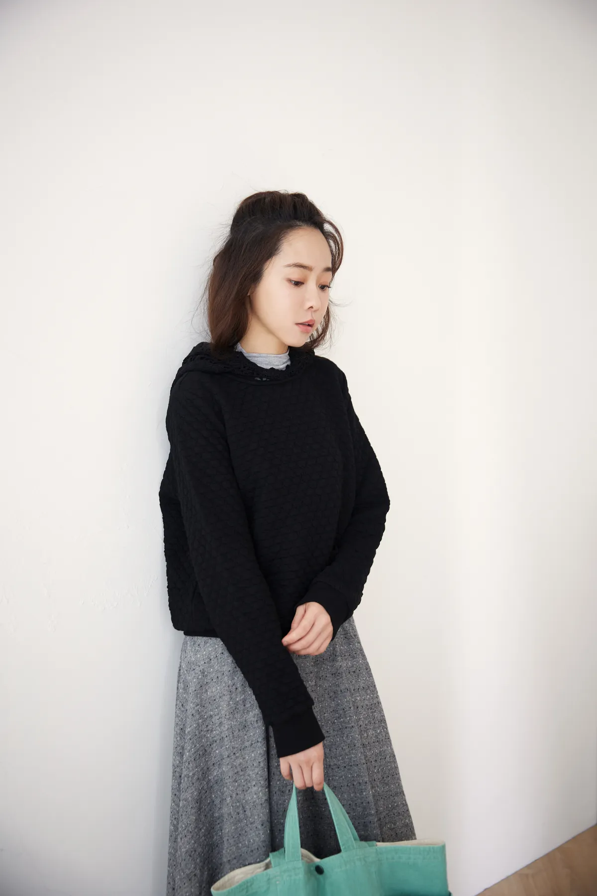 帽子外使用全棉的經編蕾絲,搭配澎澎布棉,非常可愛,無論從背面側面都能看到微微的蕾絲,好精緻的樣式!剛剛好的版型,不會因為穿著帽T而看起來臃腫沒精神,這件適合搭配各種寬鬆下半身,能提升身材比例,還有個小口袋增添造型感。