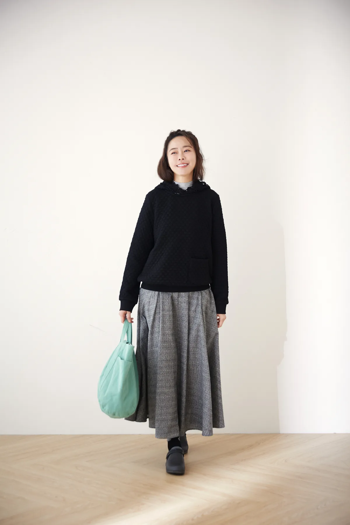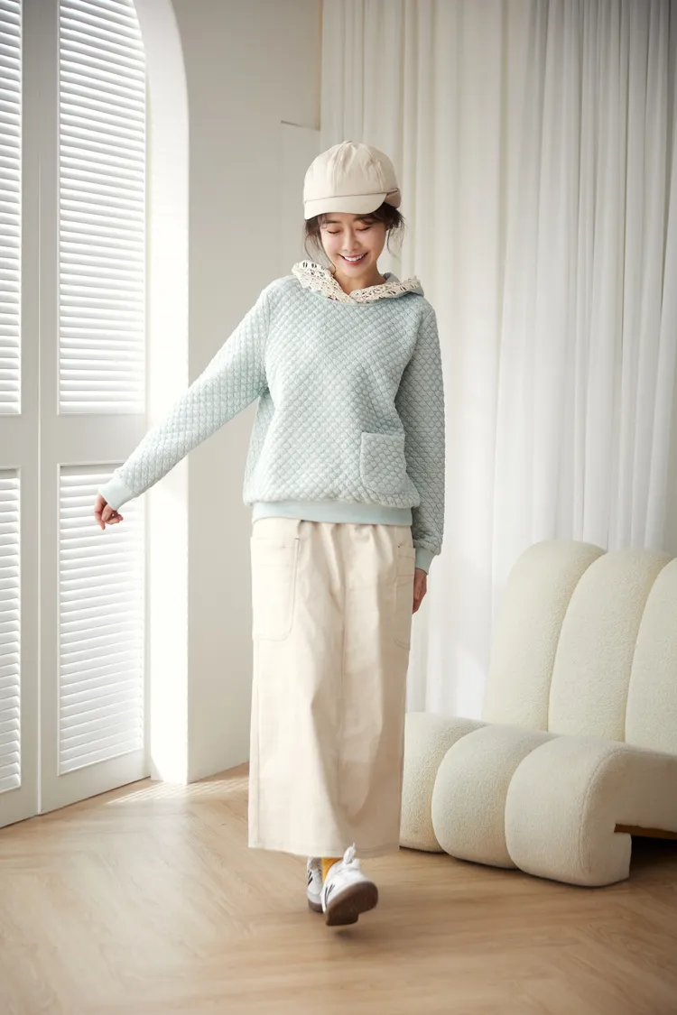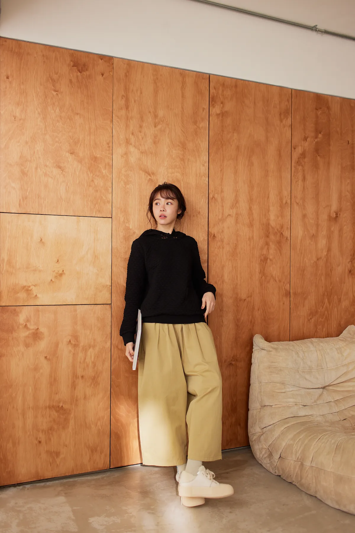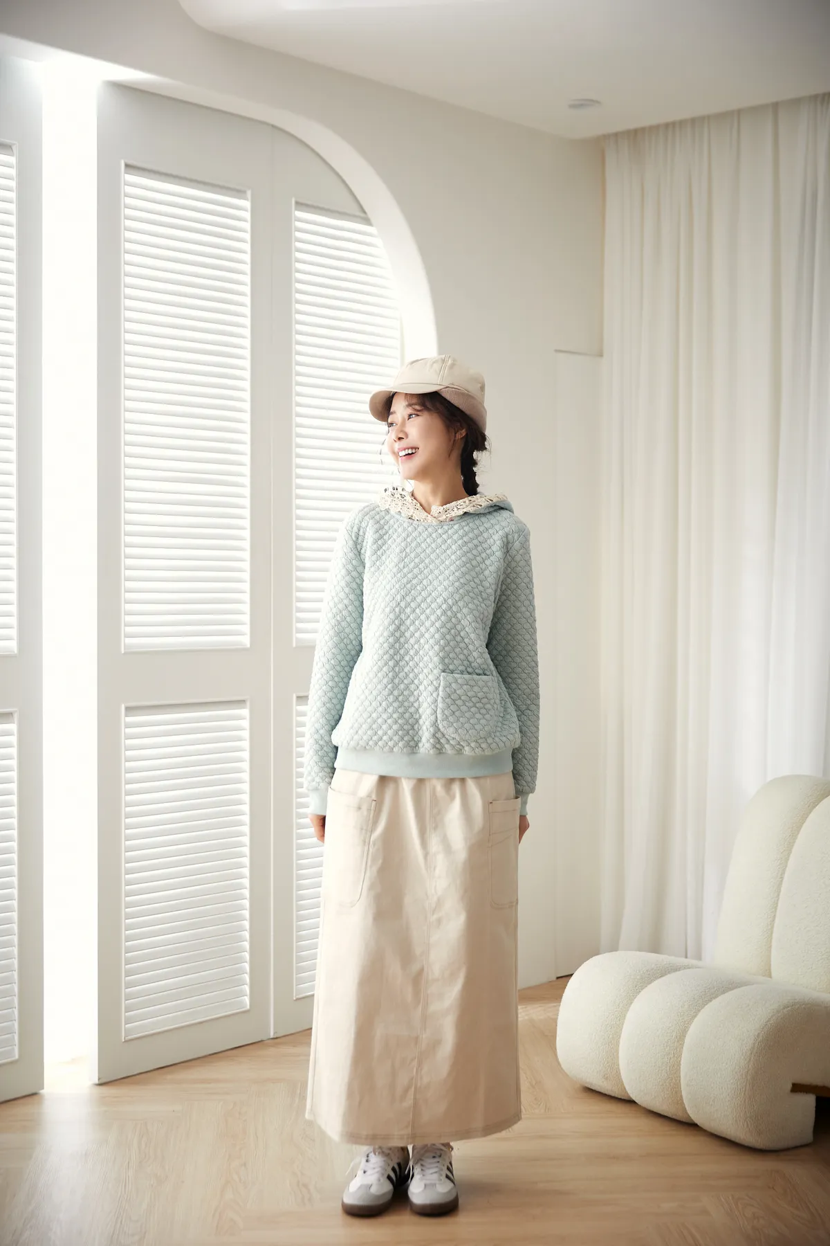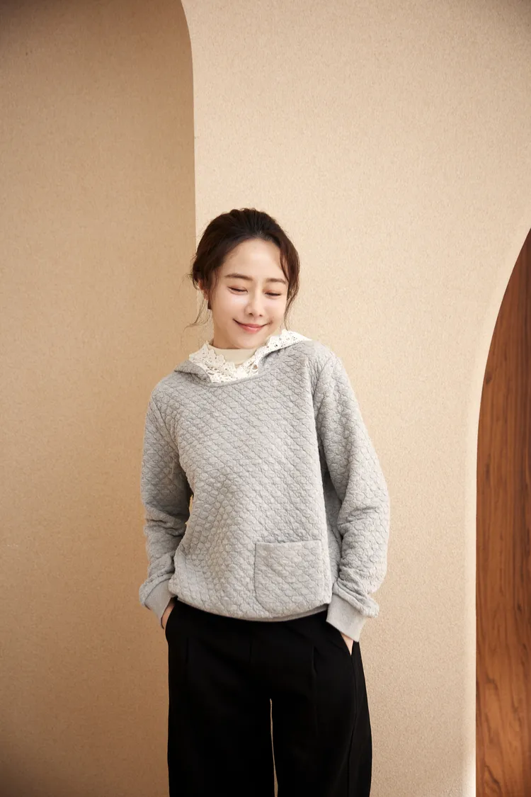 帽子外使用全棉的經編蕾絲,搭配澎澎布棉,非常可愛,無論從背面側面都能看到微微的蕾絲,好精緻的樣式!剛剛好的版型,不會因為穿著帽T而看起來臃腫沒精神,這件適合搭配各種寬鬆下半身,能提升身材比例,還有個小口袋增添造型感。