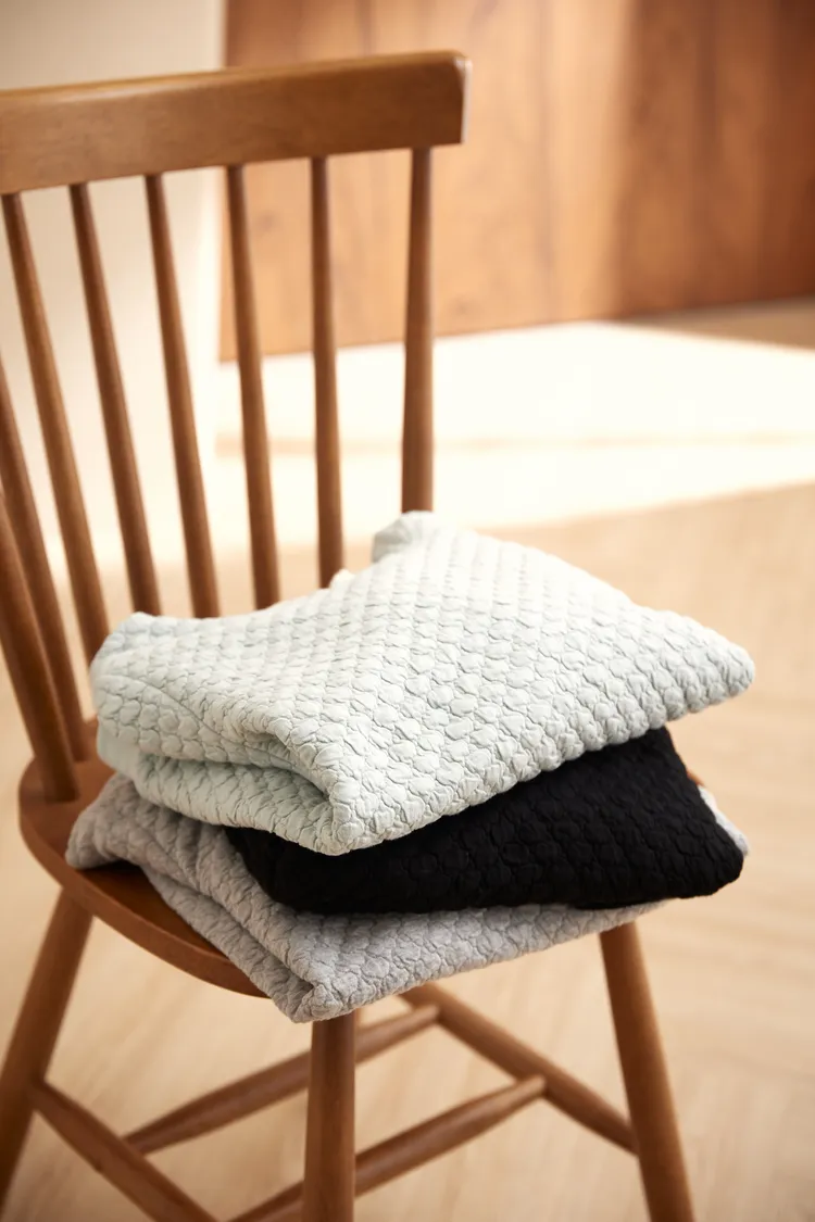 在布料上是織紋蓬鬆,裡面織著彈性纖維的針織布,看起來像鋪棉,表面上是30支100%棉布,待也T恤手感舒適柔軟,底下是由彈性絲構成,兩者收縮力不同,呈現出像鋪棉的柔軟感。