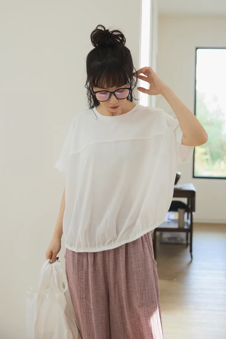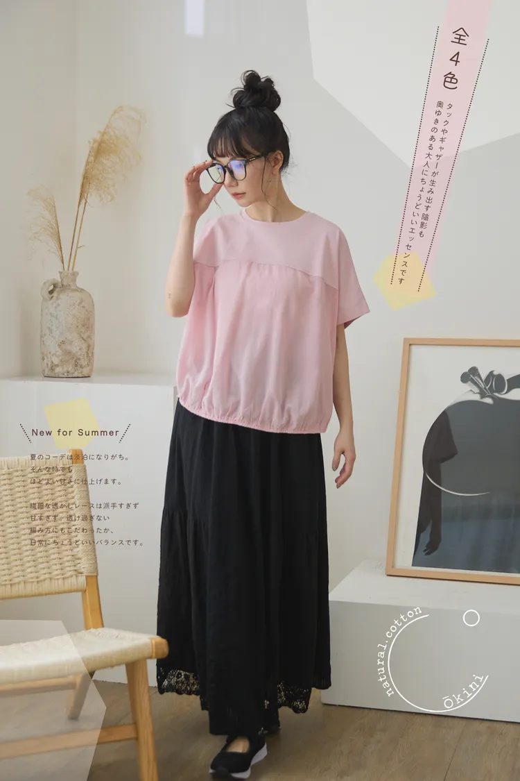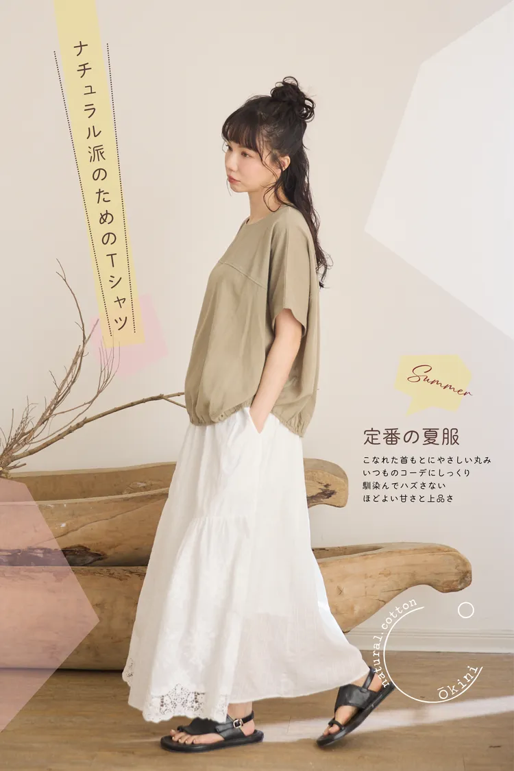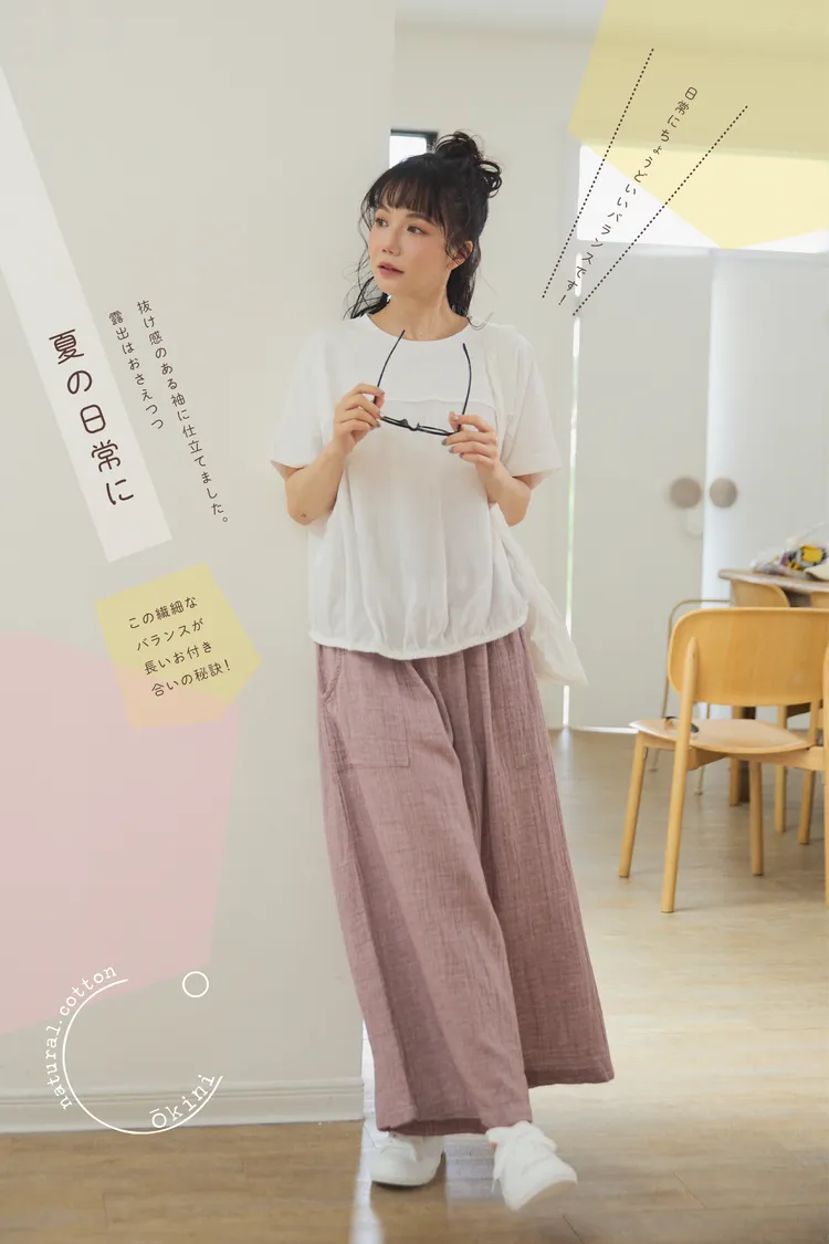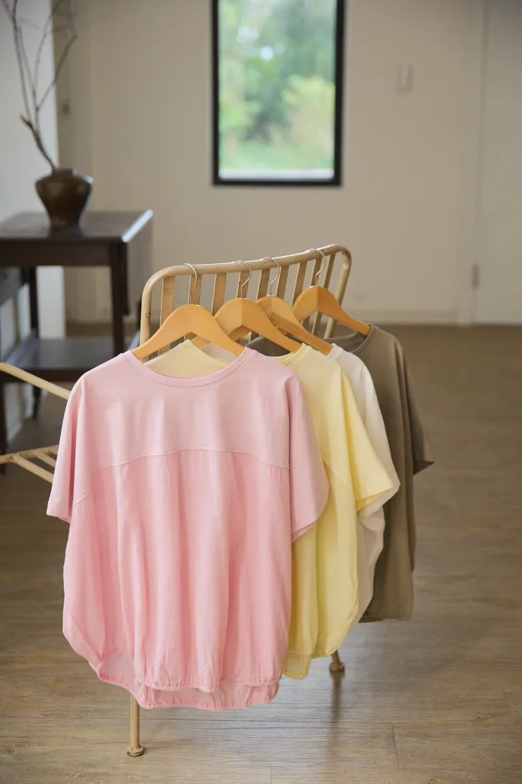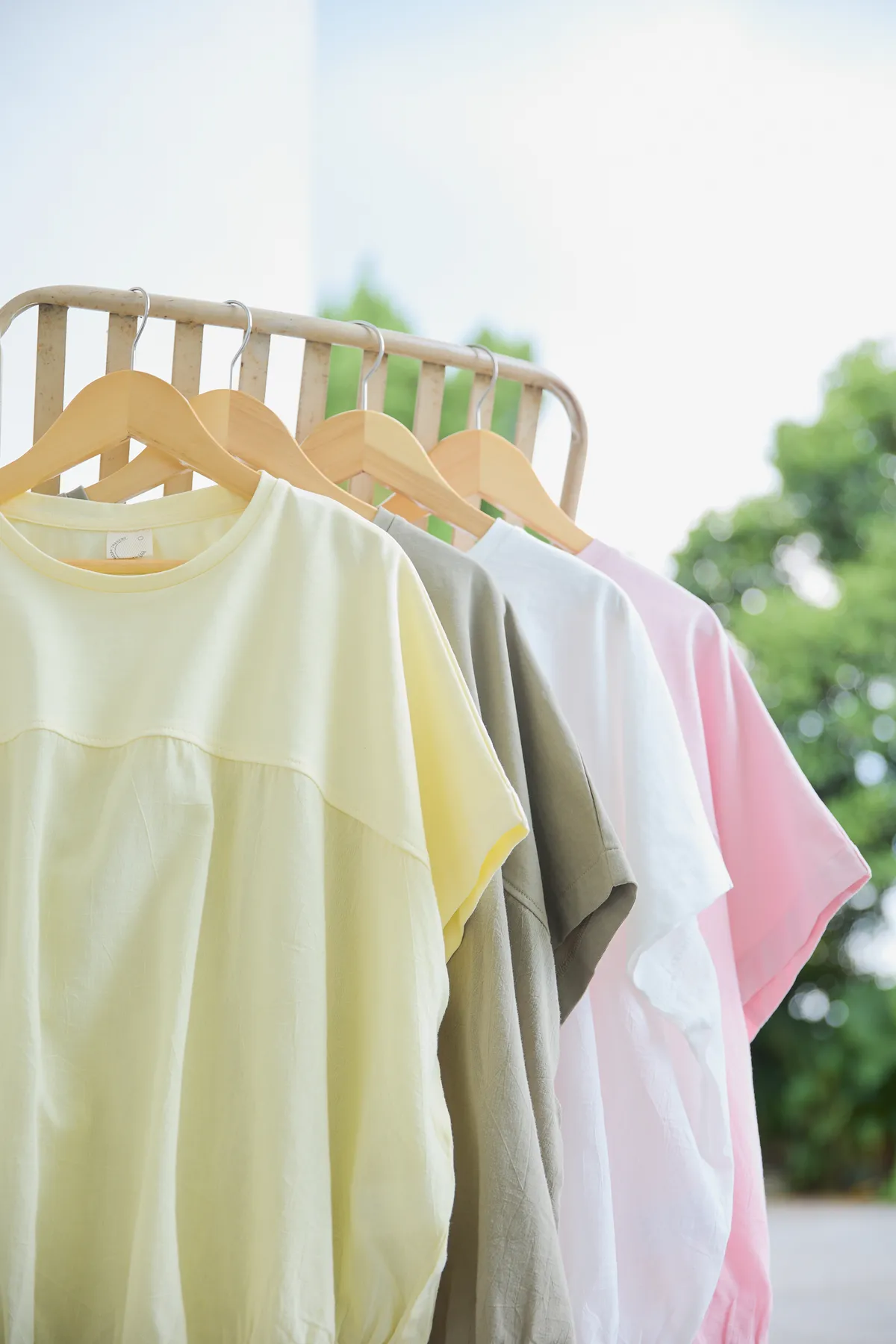 這件真的會讓妳忍不住包色!因為它太會修飾了,而且夏天一週七天都能輪著穿,顏色全都好看到爆。我們這個年紀,夏天穿衣最大的痛點就是——手臂鬆肉、小腹凸凸、布料一悶就皺又黏皮膚。這件一次直接解決這三大煩惱。連袖的剪裁把二の腕包得剛剛好;下擺鬆鬆微泡泡的設計,腰間和小腹立刻像消失一樣,視覺整個小一號。