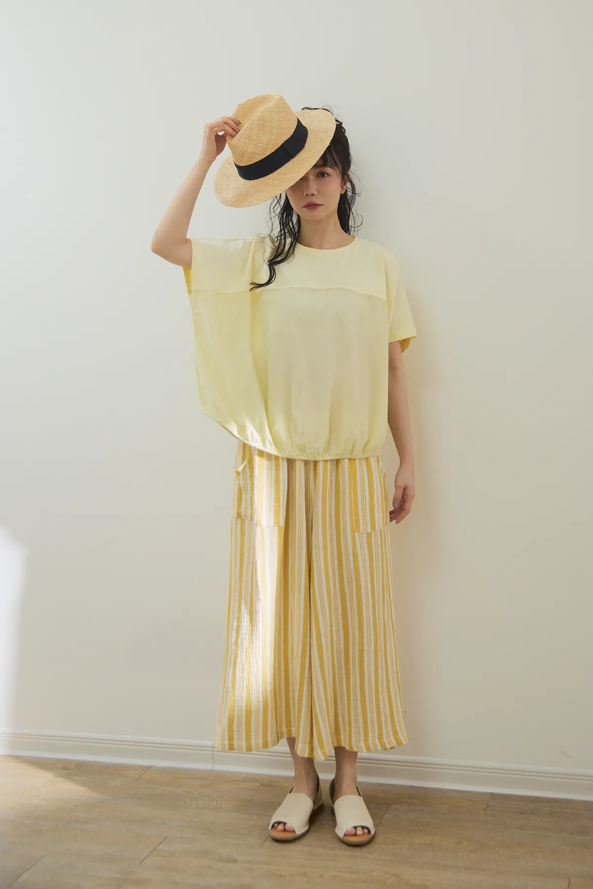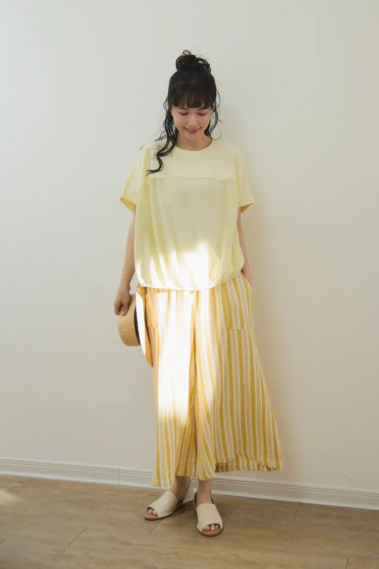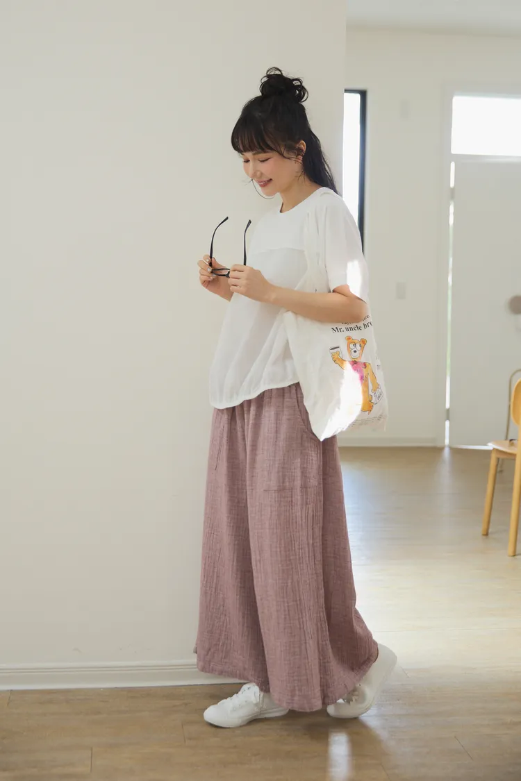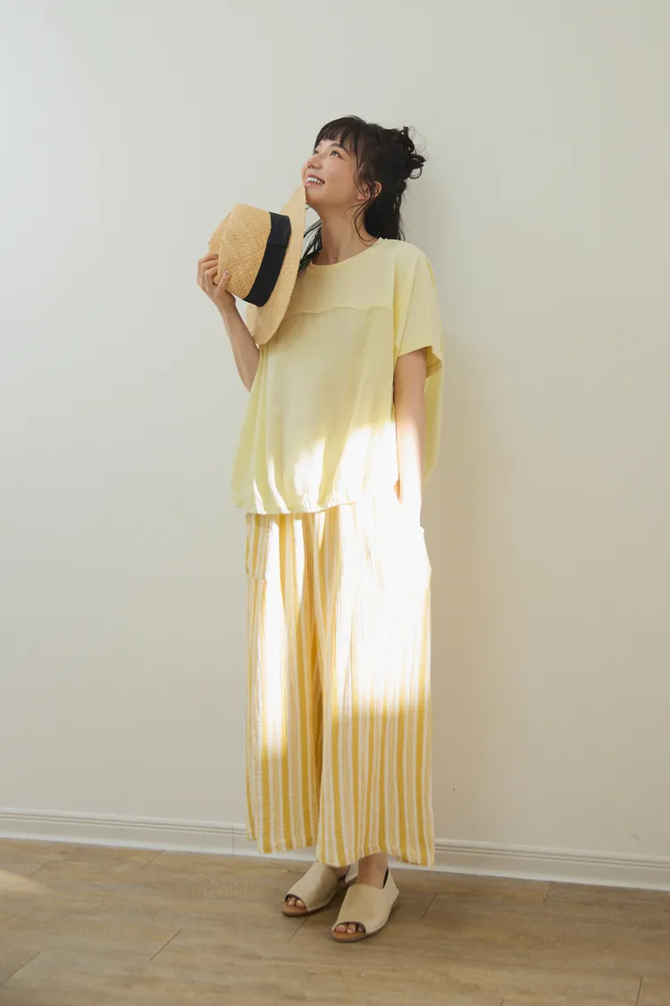 布料拼接也很有心。上半段採用緊實、冰涼感的雙紗,貼在皮膚上像開了冷氣,穿起來清爽又不黏膚;下半段是水洗有機棉,透氣度超好,戶外逛一整天回家照鏡子還是清爽不塌。那種微微的皺暗條紋其實是通風的小設計,既好看又好舒服。最棒的是超省事:免燙!洗完晾乾就能穿,完全不需要熨斗,對我們這年紀來說真的是省時又省力。腰部和下擺的彈性設計也不會緊勒,穿著整天都自在。