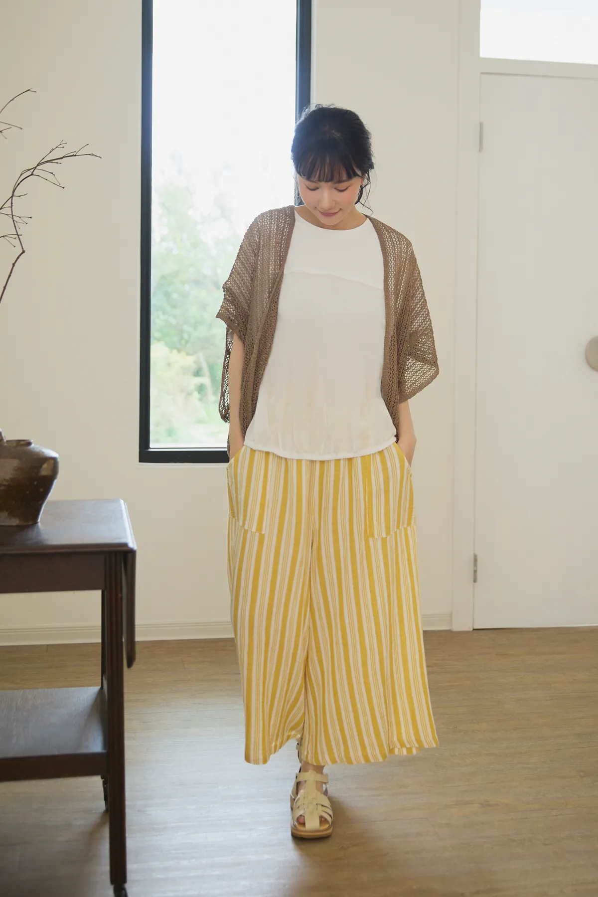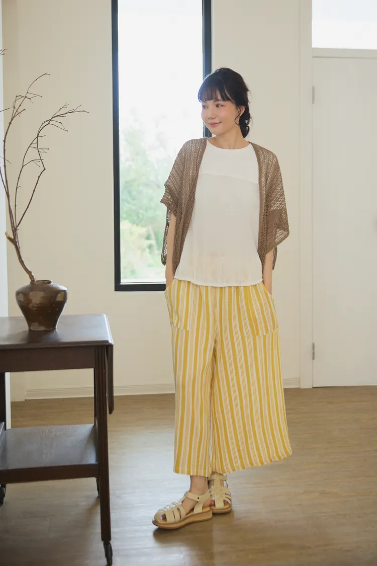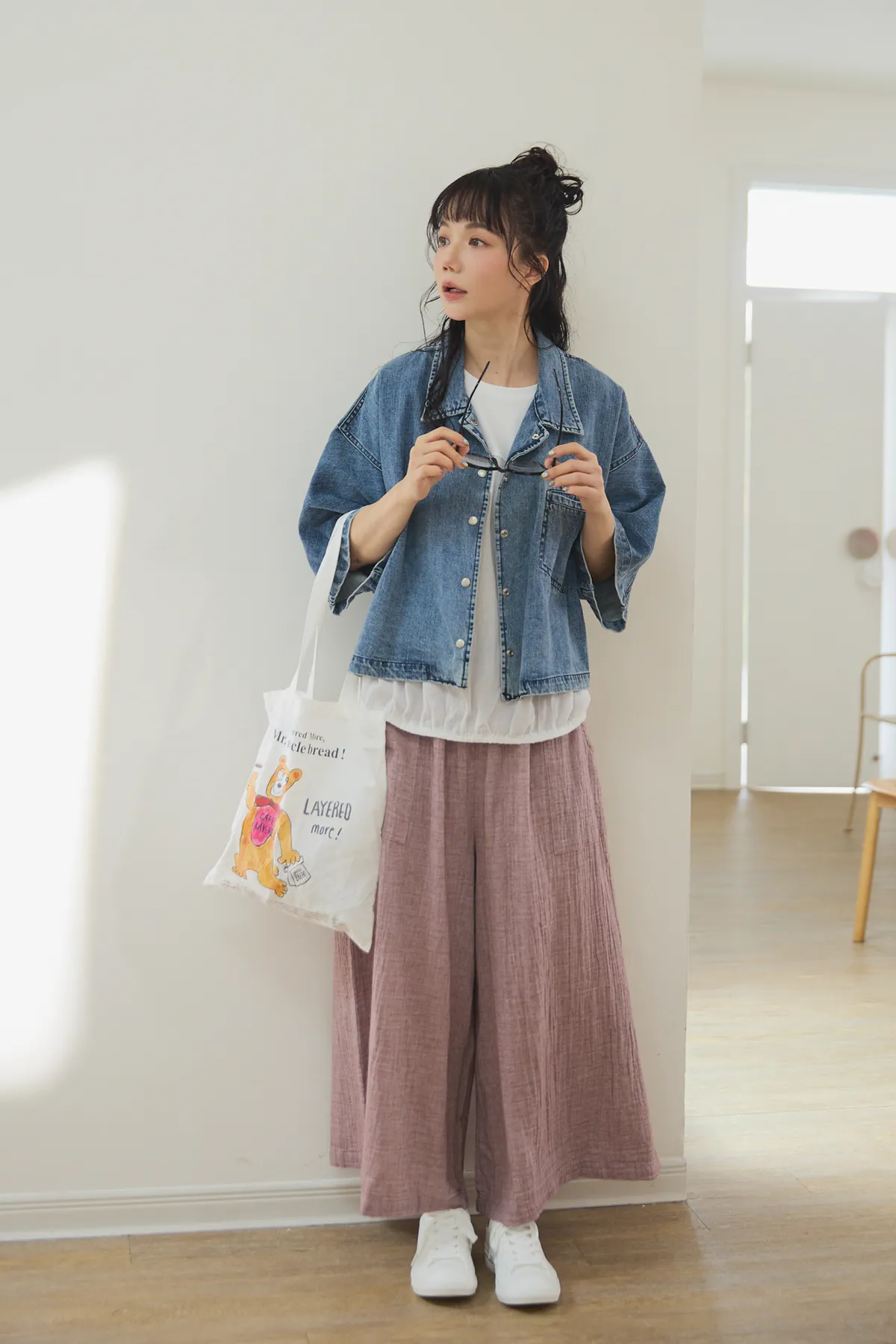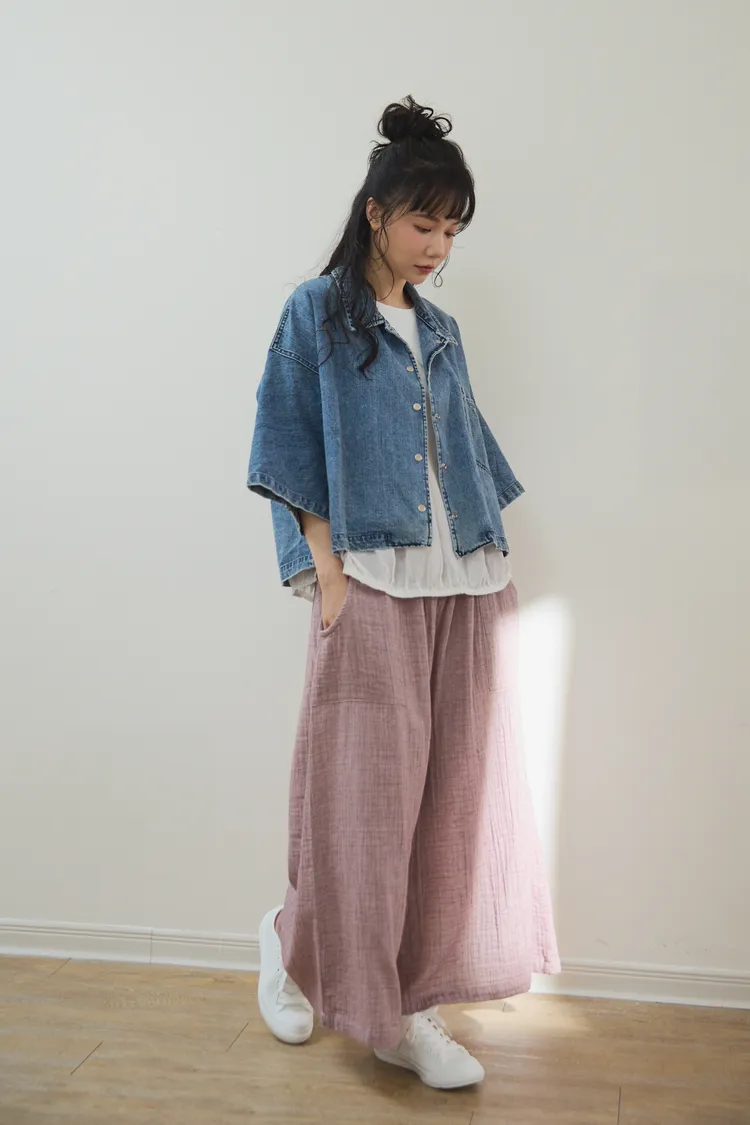 布料拼接也很有心。上半段採用緊實、冰涼感的雙紗,貼在皮膚上像開了冷氣,穿起來清爽又不黏膚;下半段是水洗有機棉,透氣度超好,戶外逛一整天回家照鏡子還是清爽不塌。那種微微的皺暗條紋其實是通風的小設計,既好看又好舒服。最棒的是超省事:免燙!洗完晾乾就能穿,完全不需要熨斗,對我們這年紀來說真的是省時又省力。腰部和下擺的彈性設計也不會緊勒,穿著整天都自在。