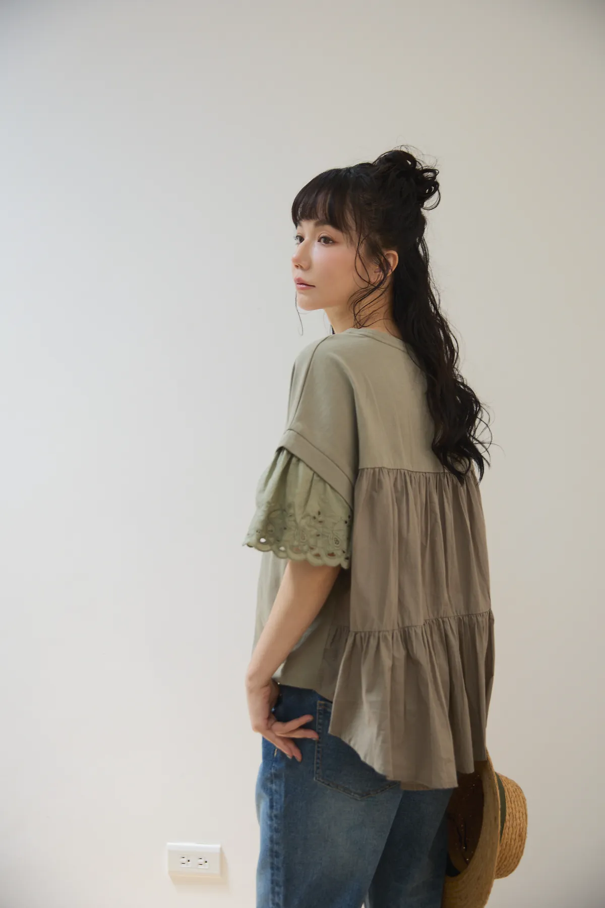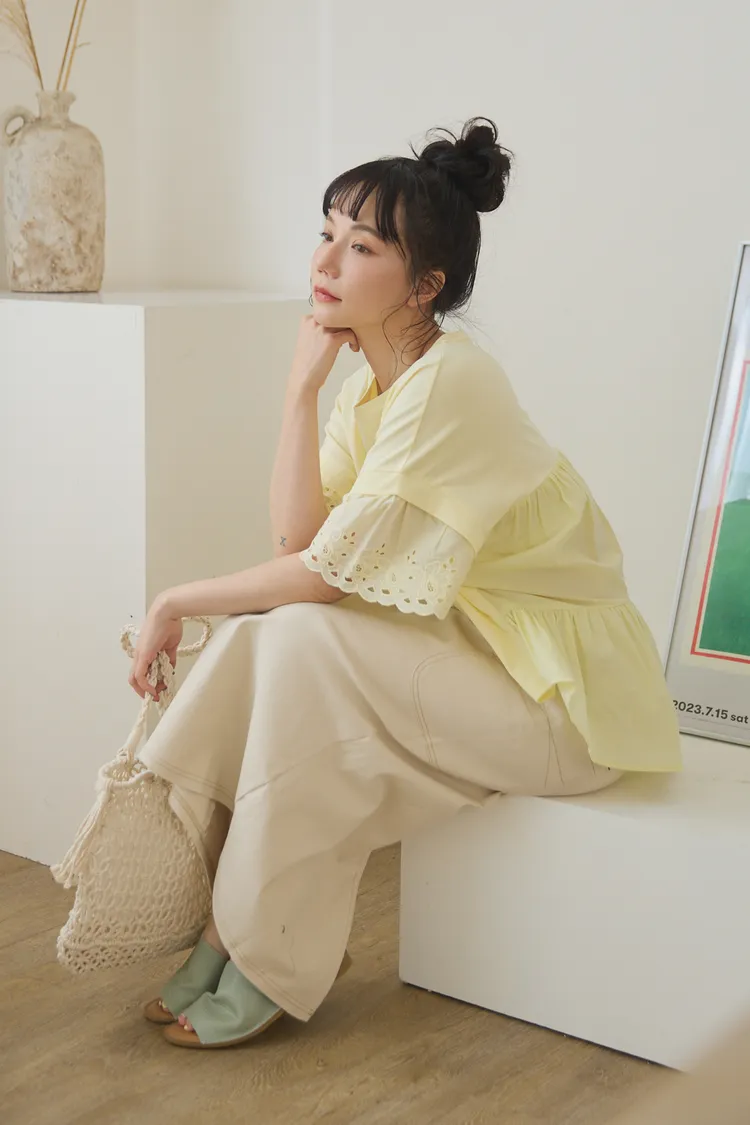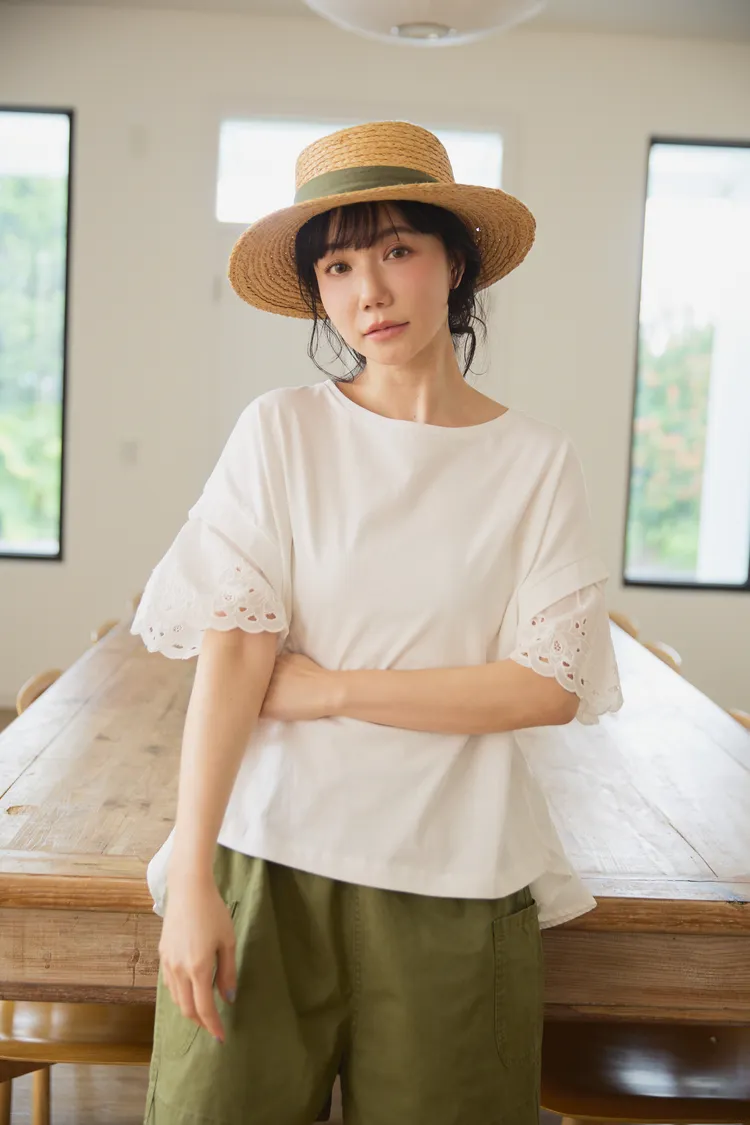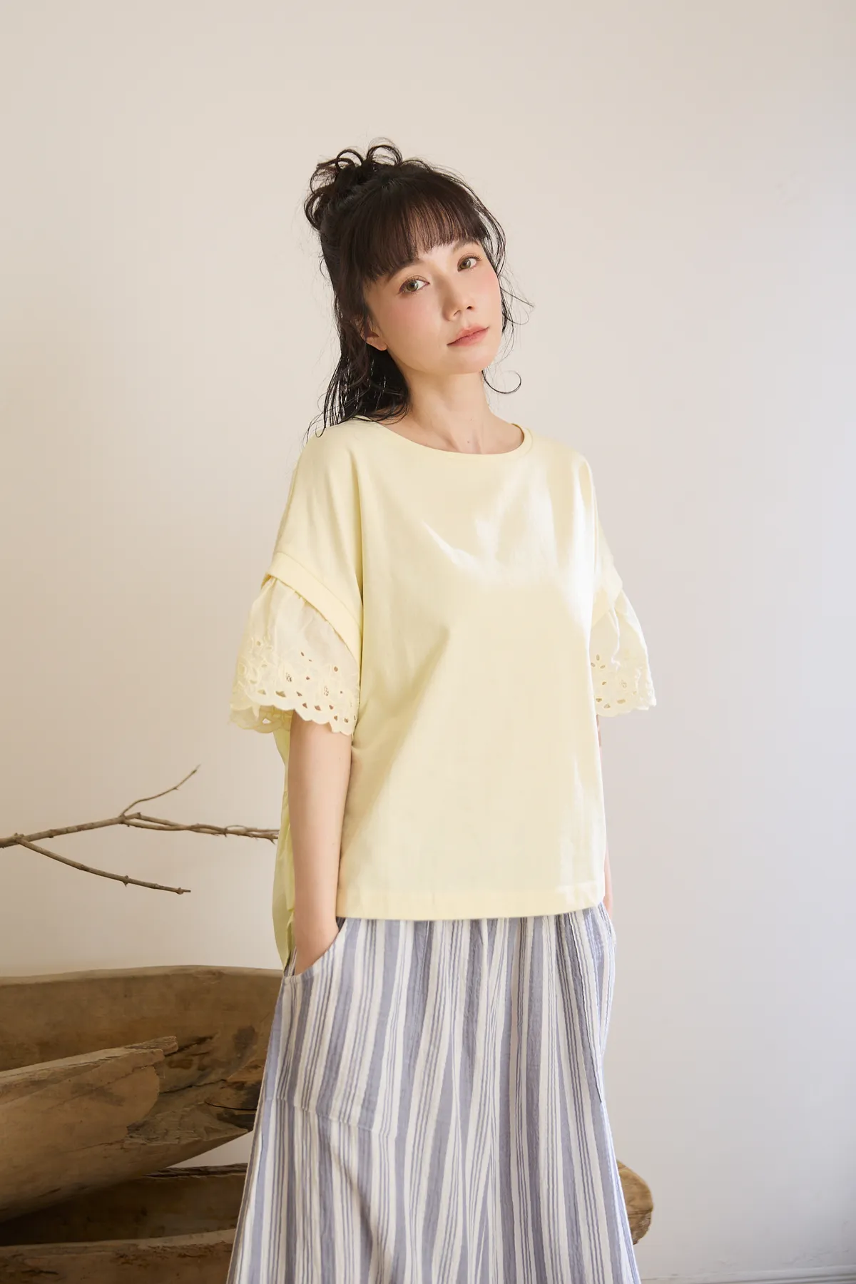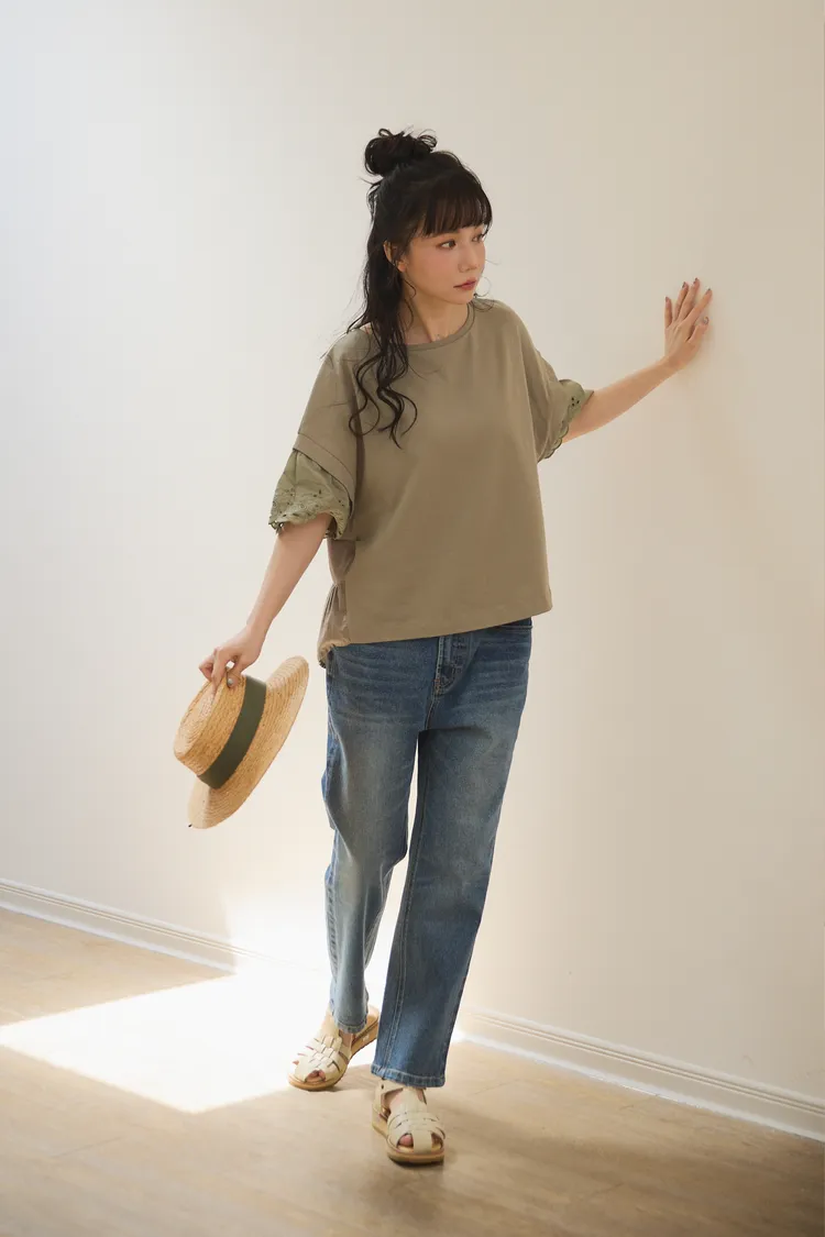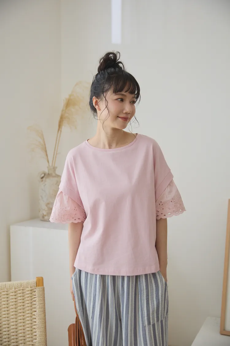 拼接棉質鏤空蕾絲,兼具透氣與挺度。切得剛剛好,可以修飾手臂線條,不會垮也不會勒。版型貼心=誰穿都修飾