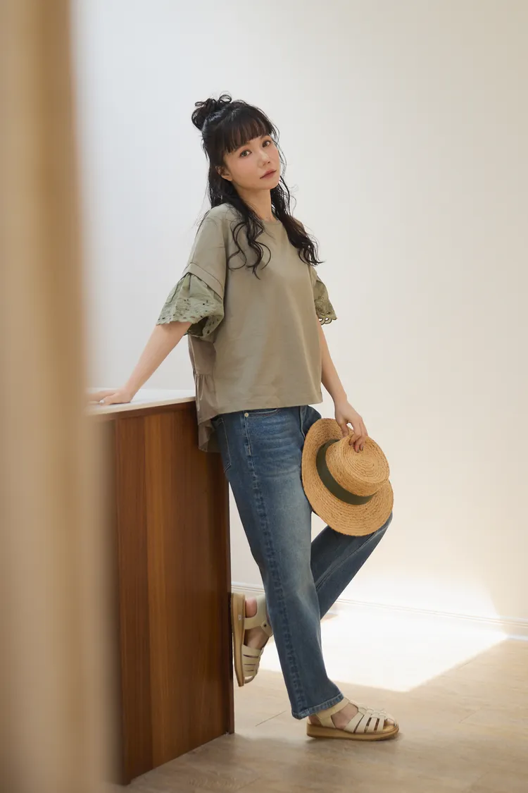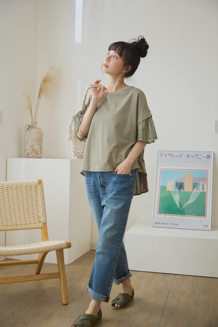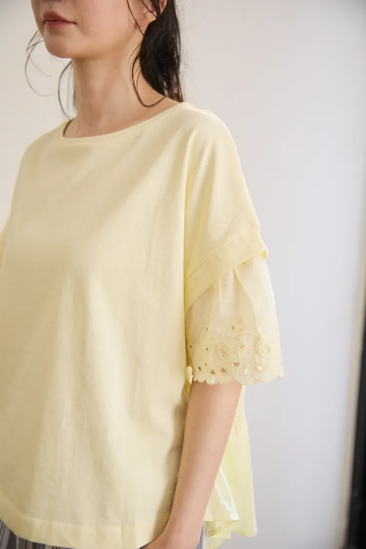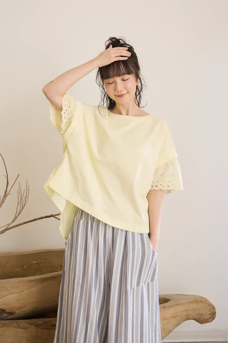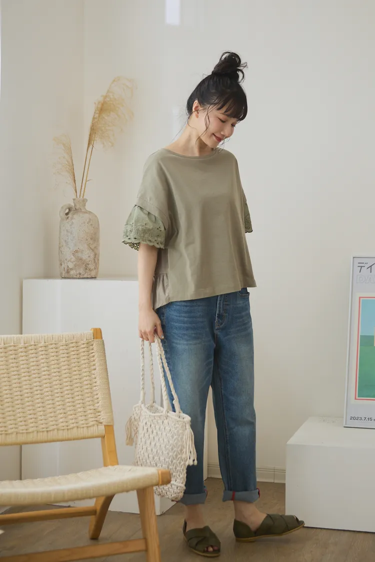 拼接棉質鏤空蕾絲,兼具透氣與挺度。切得剛剛好,可以修飾手臂線條,不會垮也不會勒。版型貼心=誰穿都修飾
