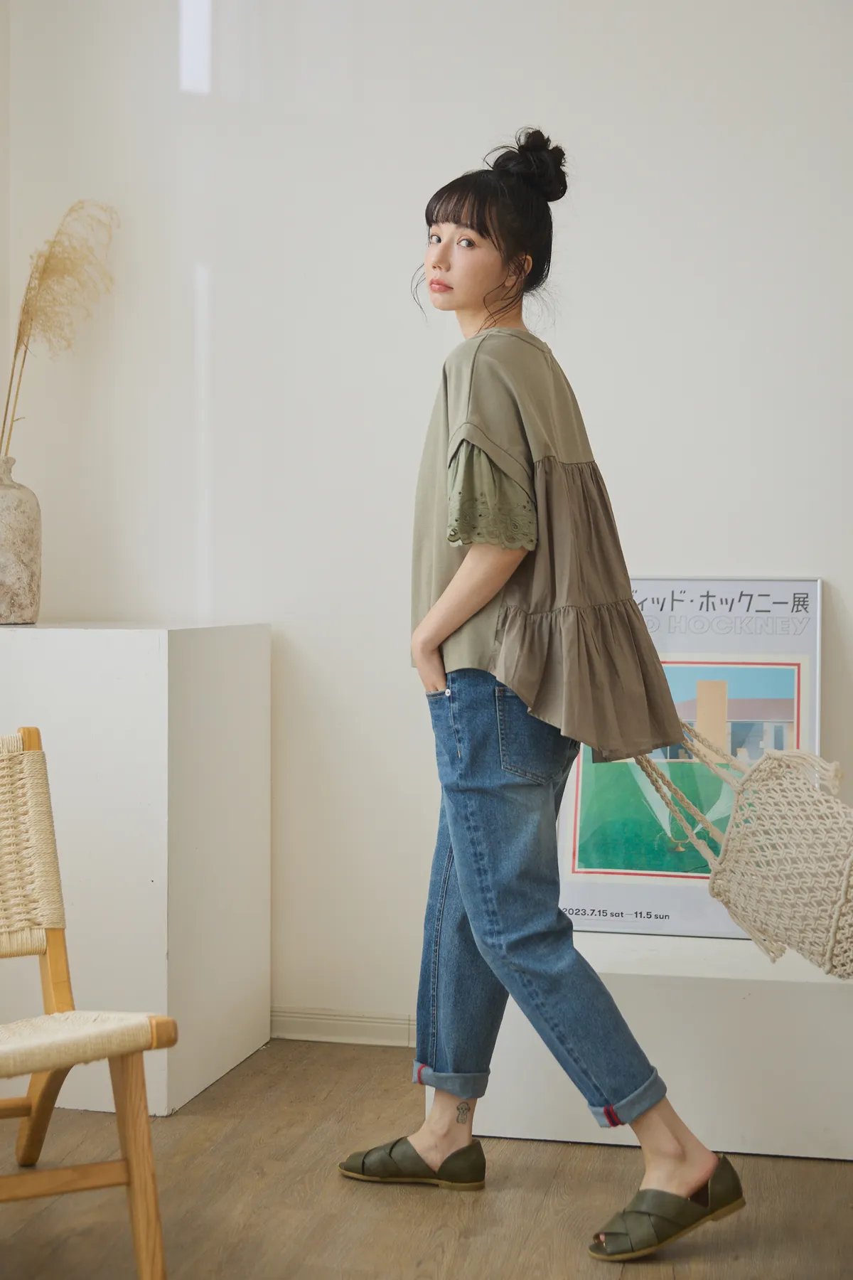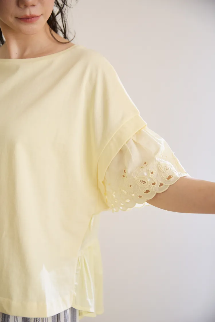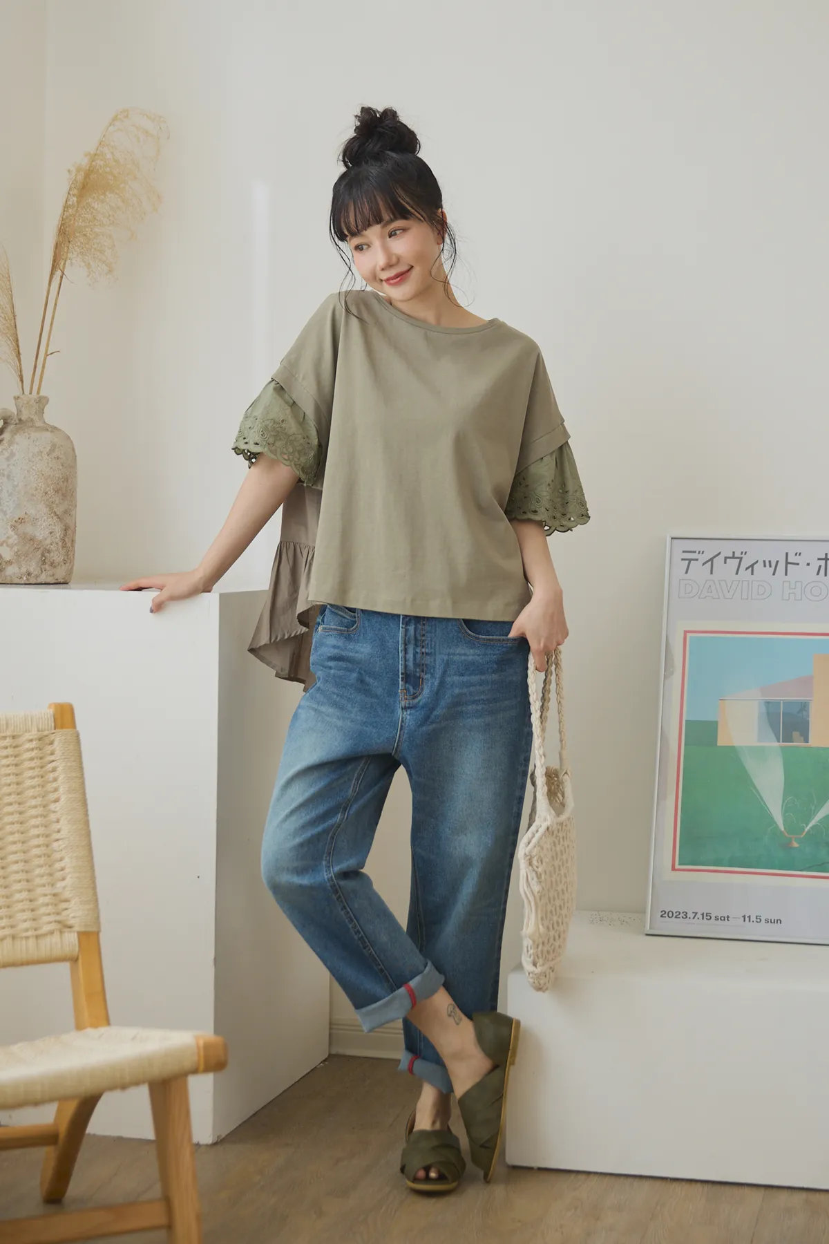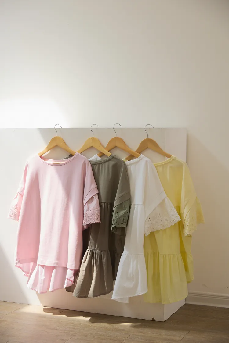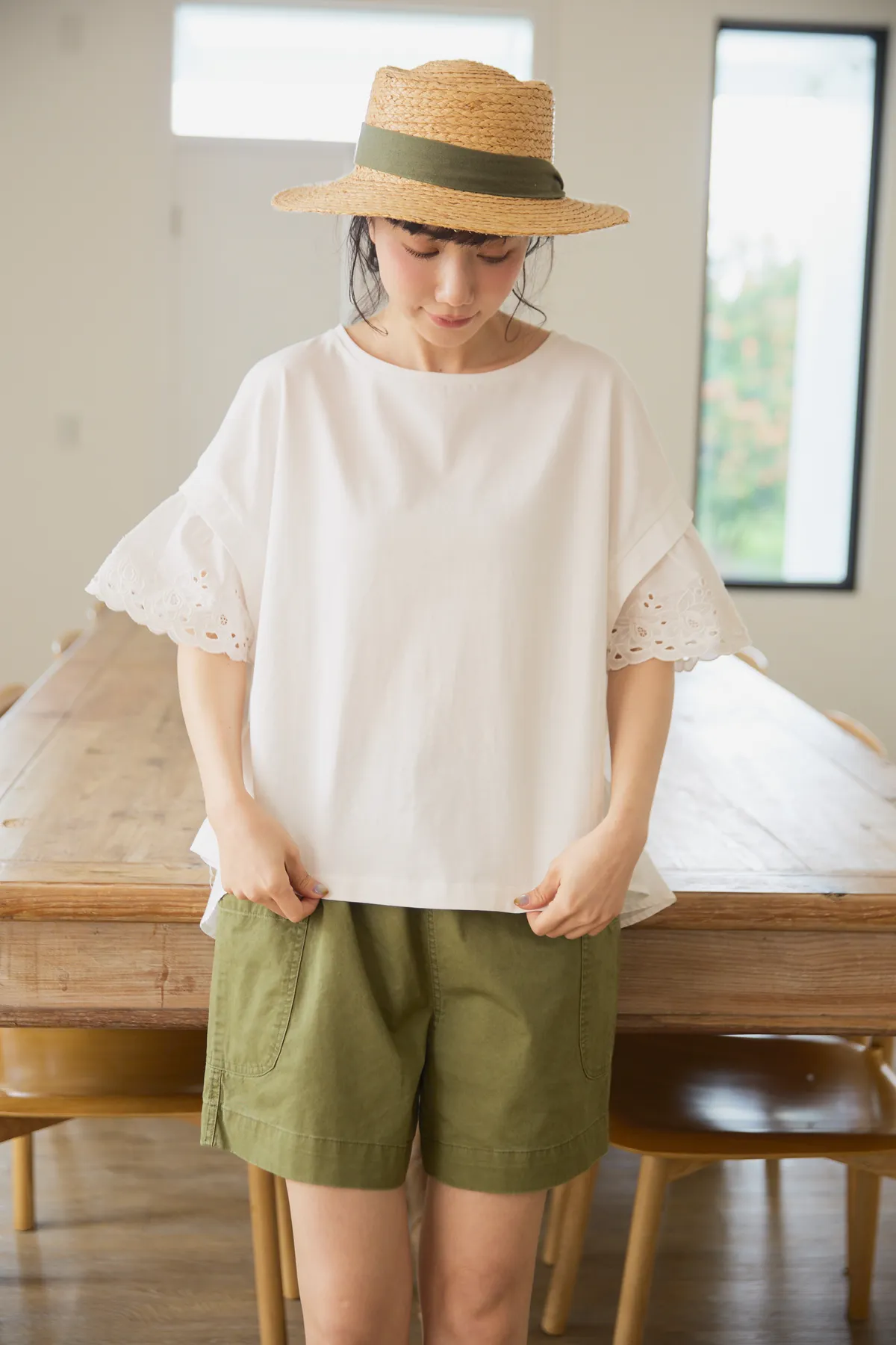 拼接棉質鏤空蕾絲,兼具透氣與挺度。切得剛剛好,可以修飾手臂線條,不會垮也不會勒。版型貼心=誰穿都修飾