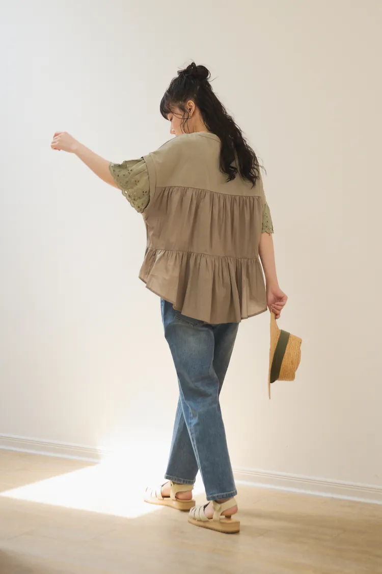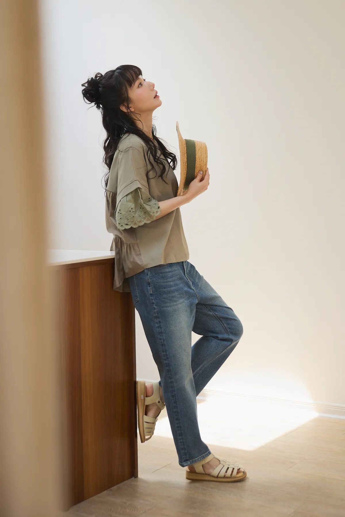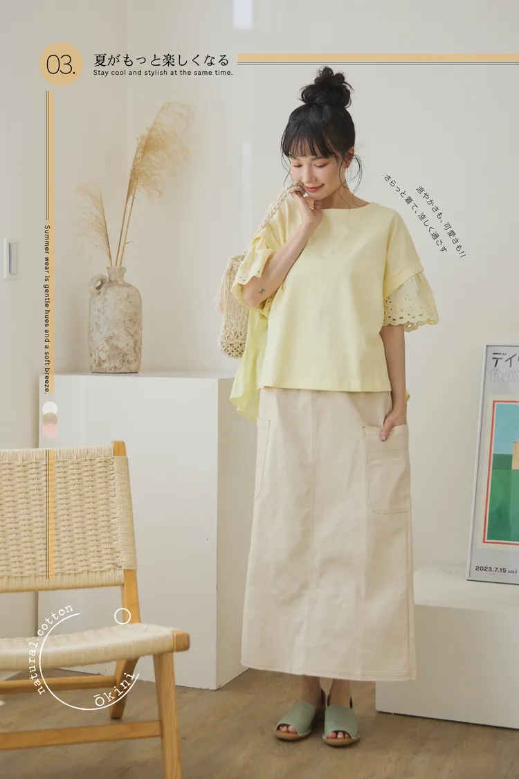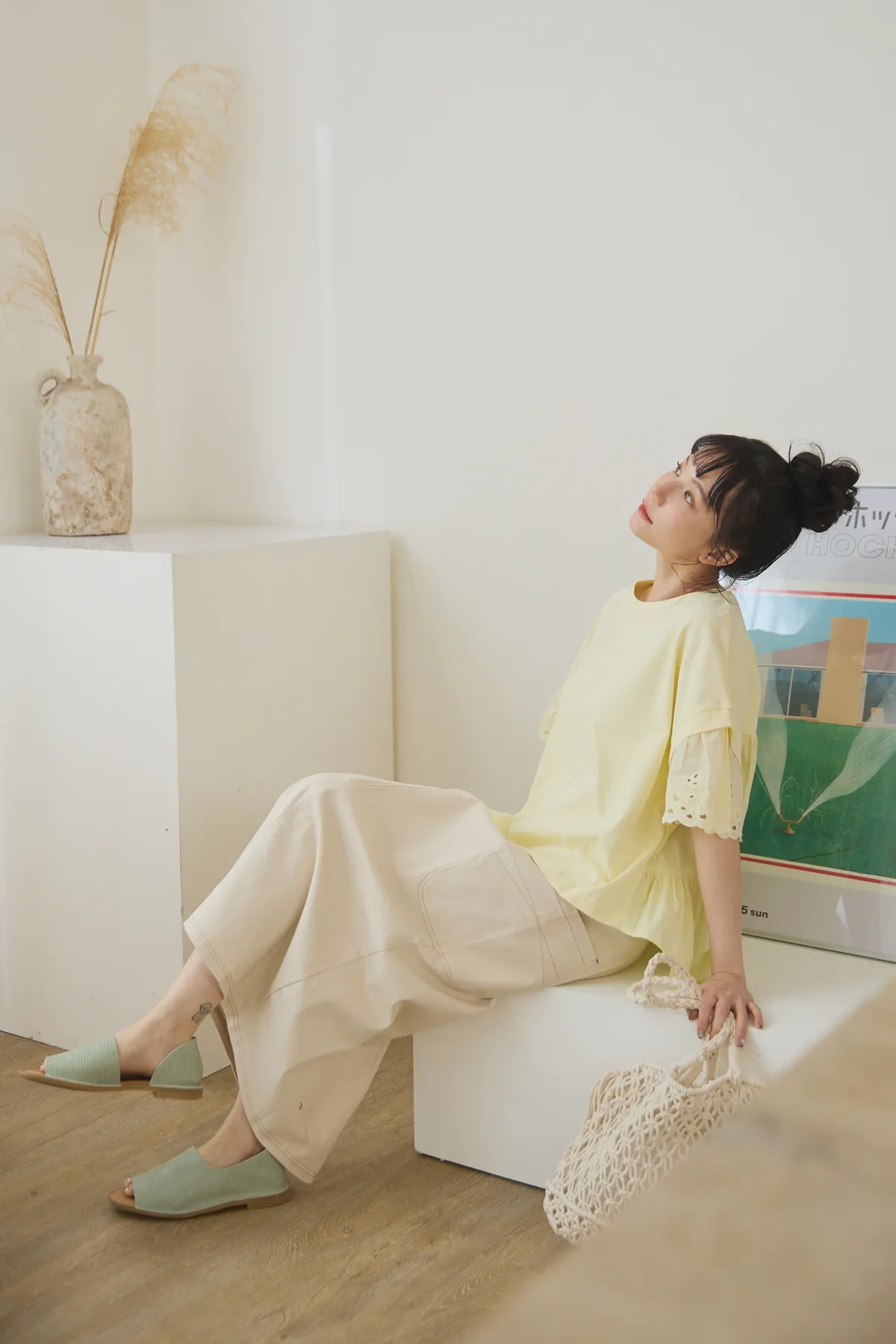 60S 水洗平紋布,細緻又輕軟,洗後自然鬆弛,形成層層「蛋糕裙式」細摺。整體不是過度甜膩的小公主風,而是剛好點到「減齡」那個位子,既有女生味又不幼稚。袖子細節(修飾手臂)