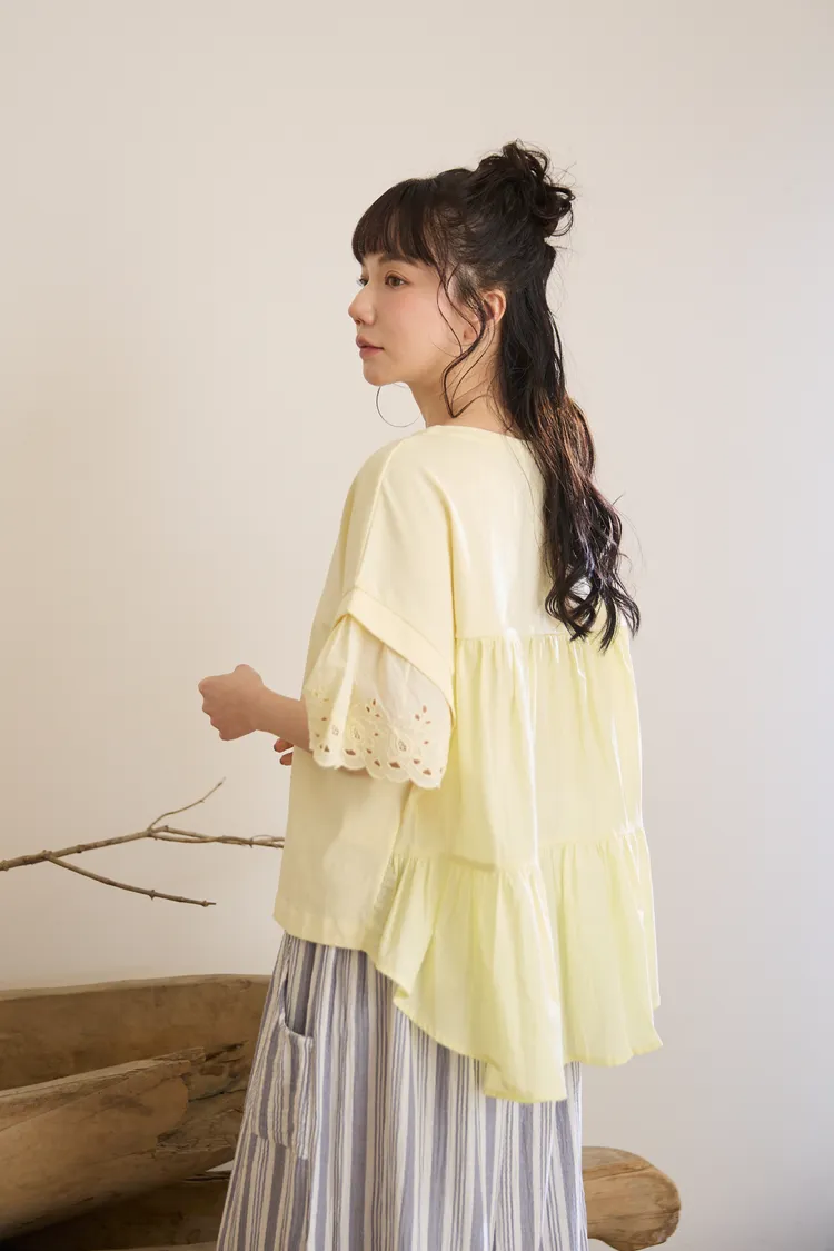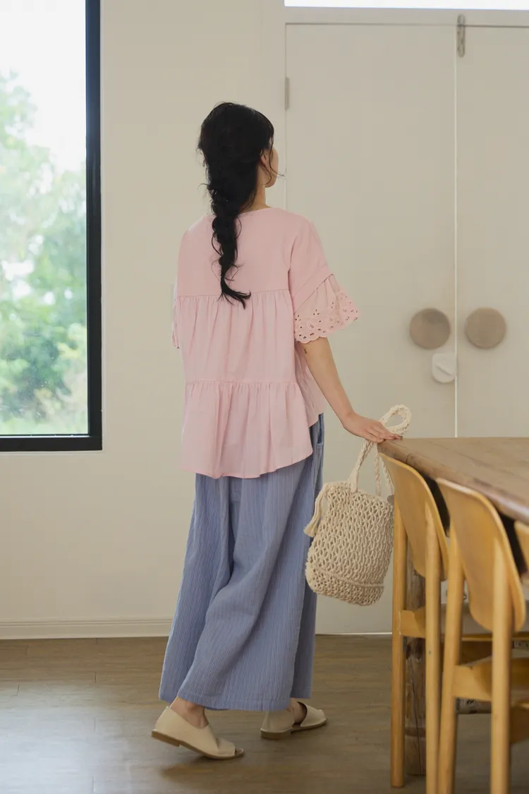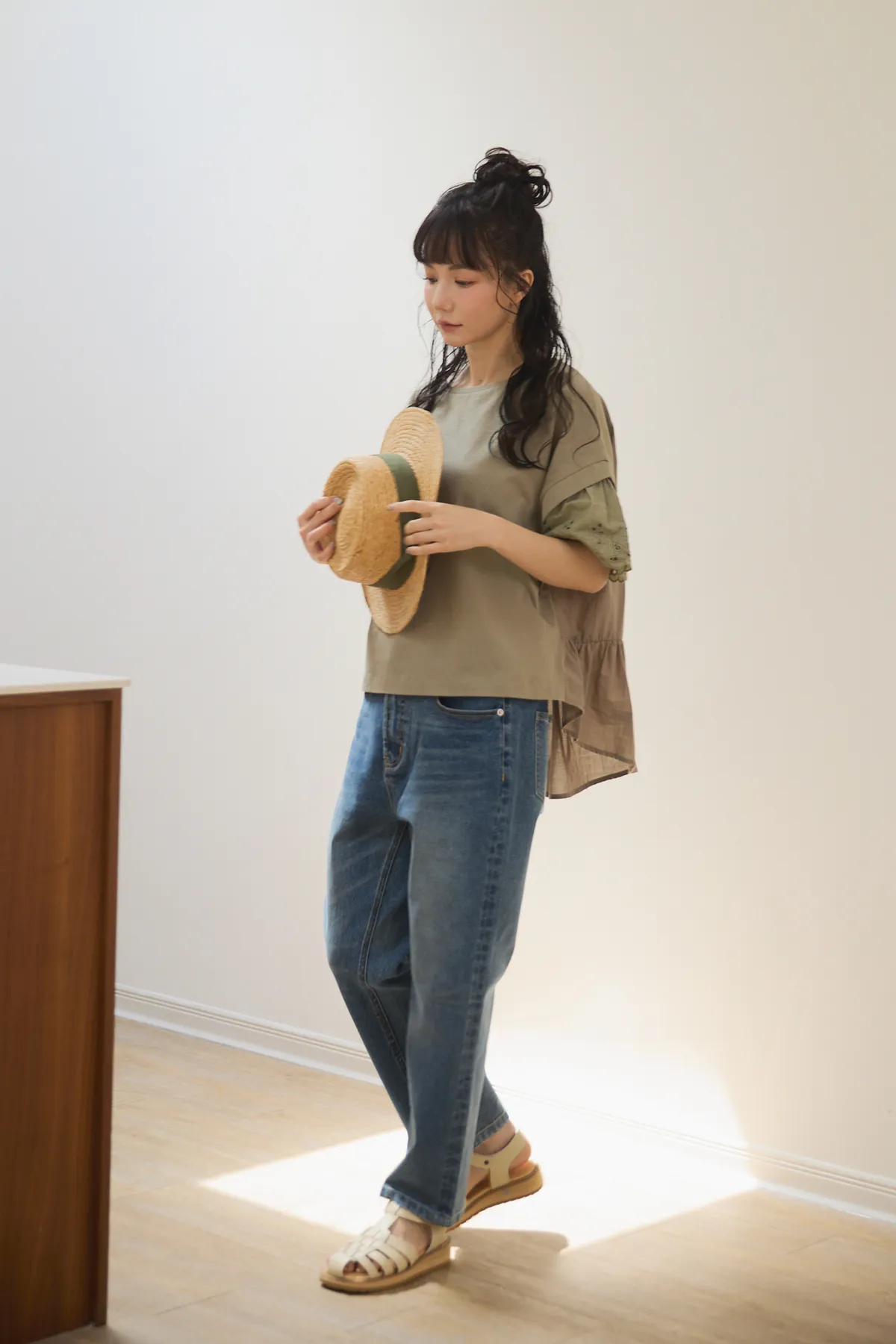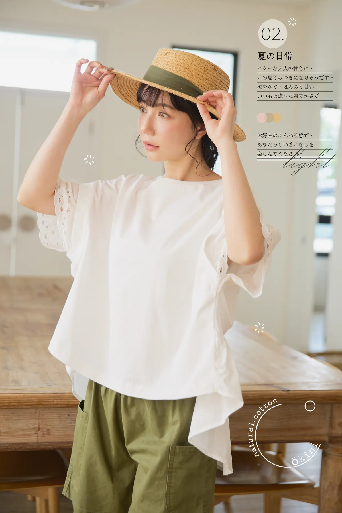 60S 水洗平紋布,細緻又輕軟,洗後自然鬆弛,形成層層「蛋糕裙式」細摺。整體不是過度甜膩的小公主風,而是剛好點到「減齡」那個位子,既有女生味又不幼稚。袖子細節(修飾手臂)