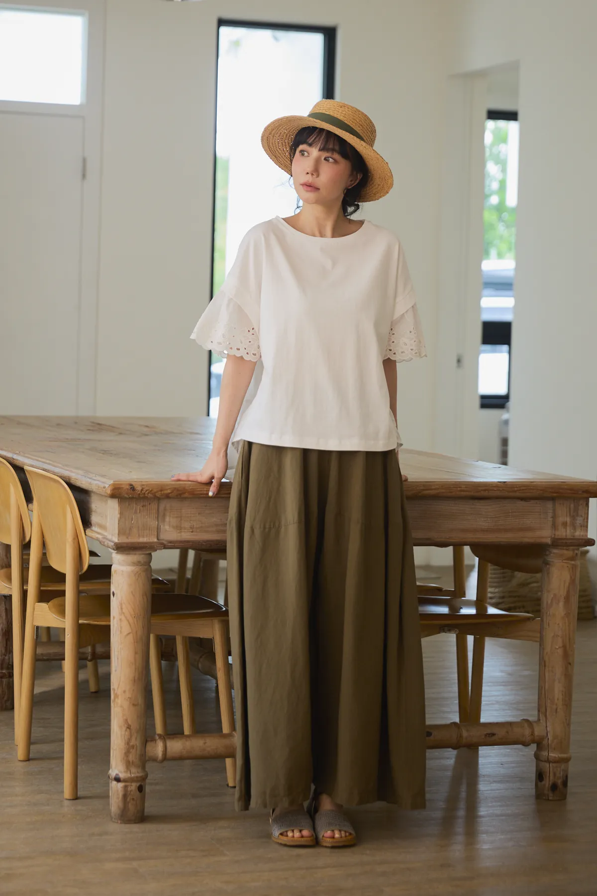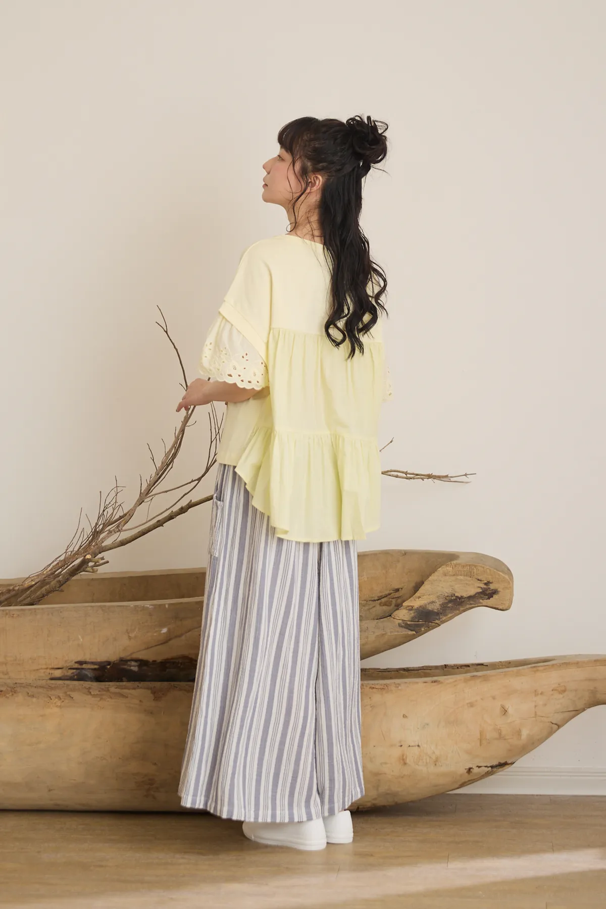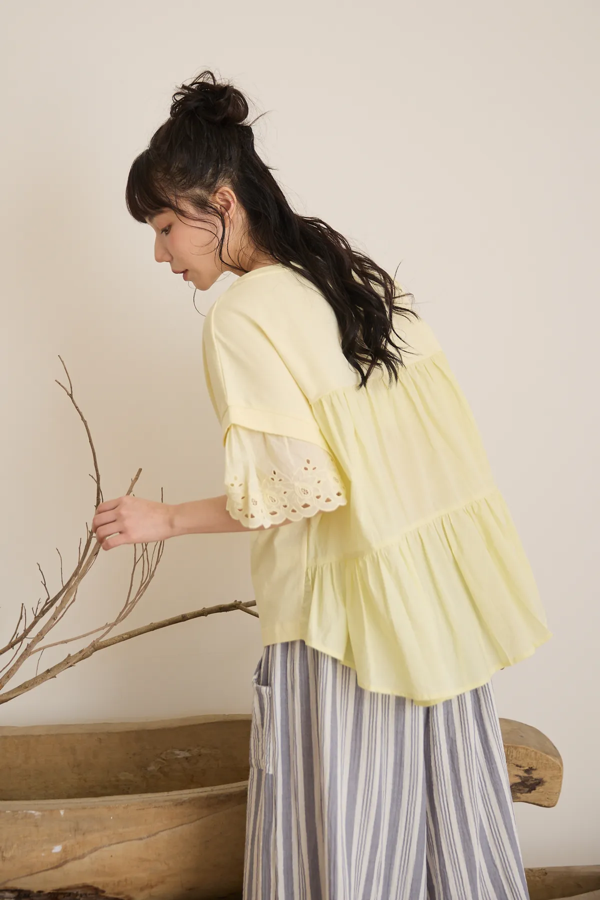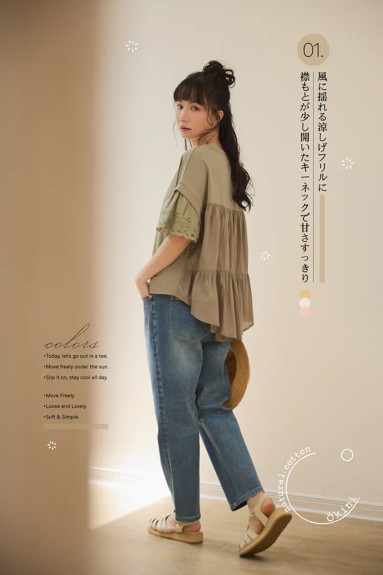 60S 水洗平紋布,細緻又輕軟,洗後自然鬆弛,形成層層「蛋糕裙式」細摺。整體不是過度甜膩的小公主風,而是剛好點到「減齡」那個位子,既有女生味又不幼稚。袖子細節(修飾手臂)