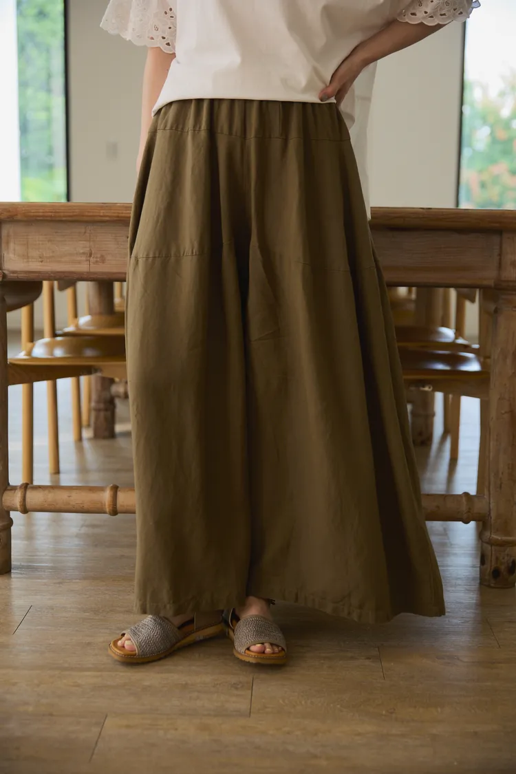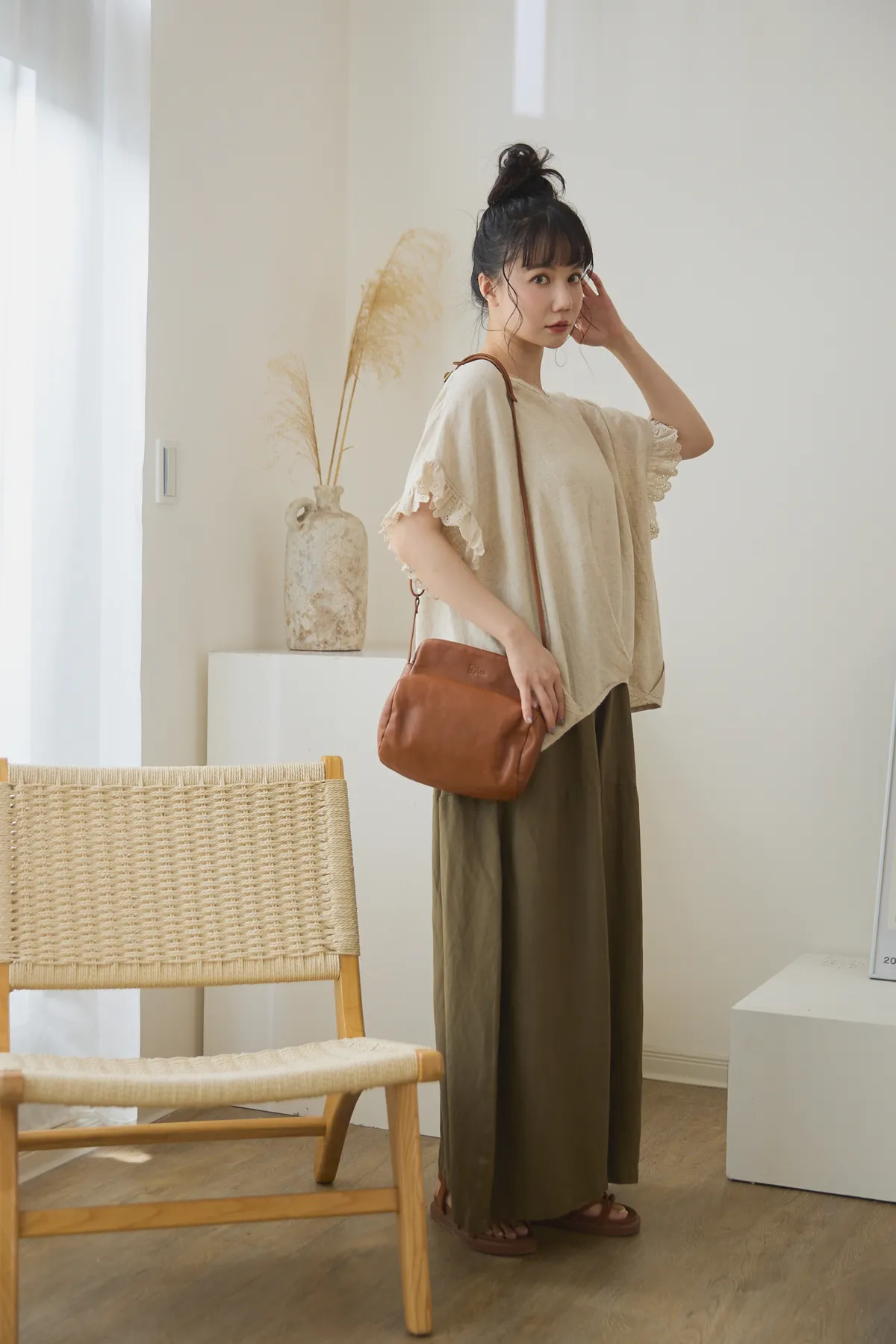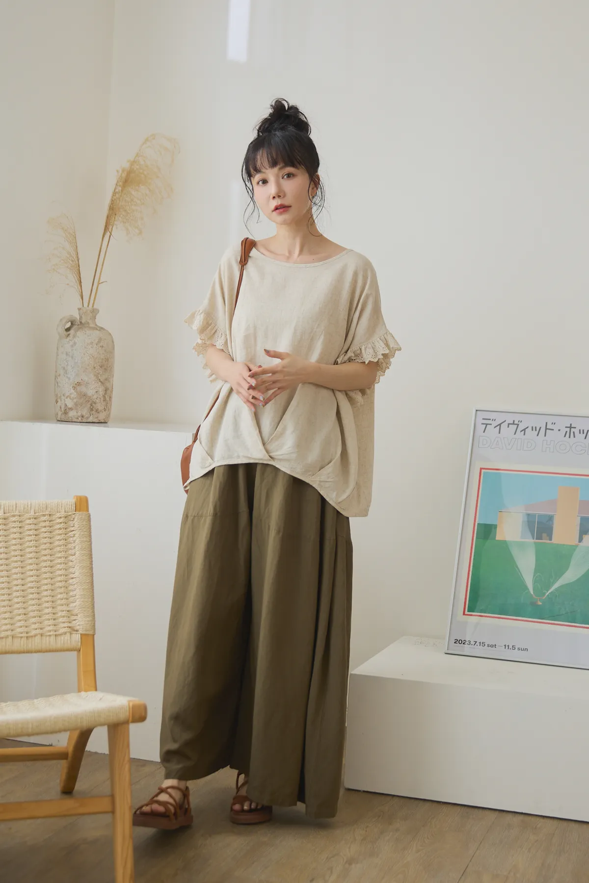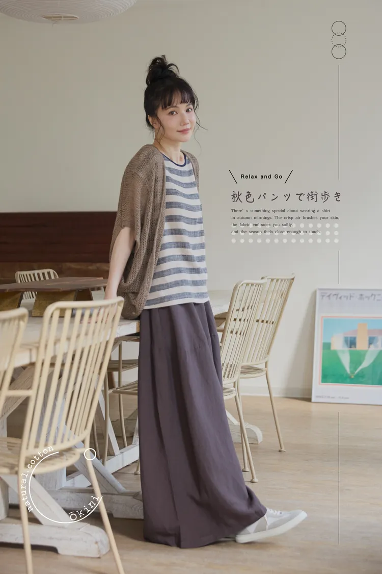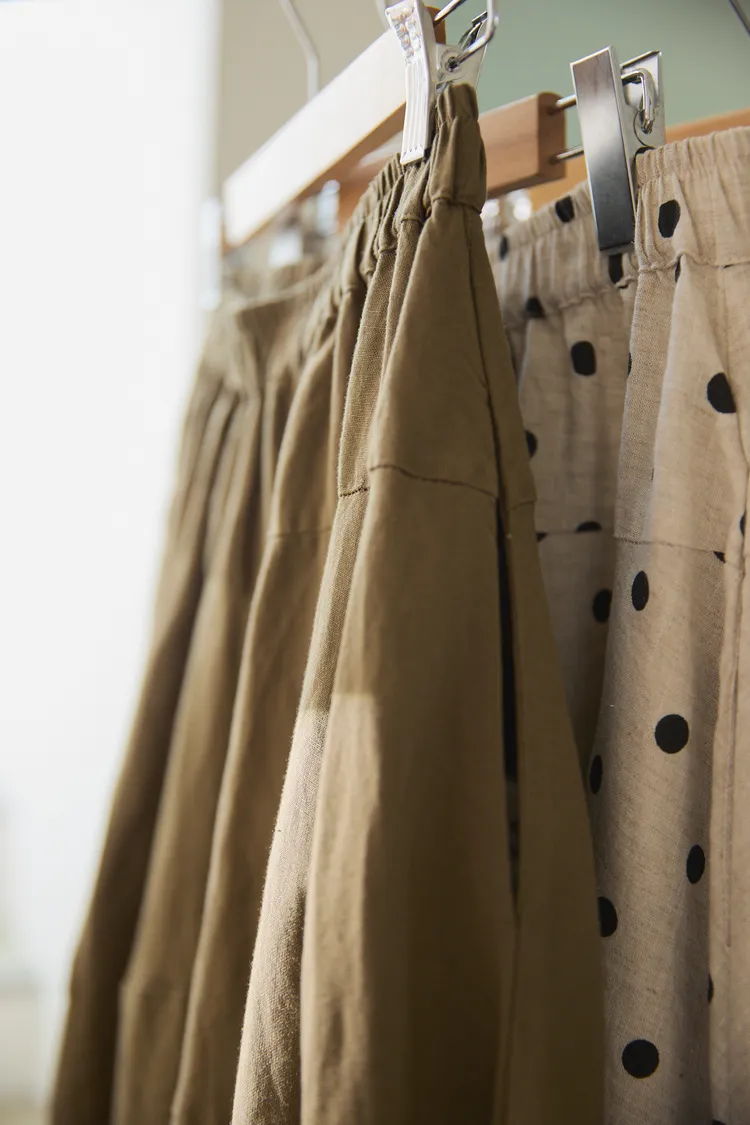 布料是關鍵。它由 55% 麻、45% 嫘縈混紡組成:麻給了褲子必要的挺度與自然涼感,嫘縈則帶來滑順與垂墜,使整條褲子「有骨架但不硬」,摸起來有麻的透氣感卻完全不刺皮。這種組合讓褲子既能保持線條感,又有舒服的貼膚觸感——你可以從早上一路穿到晚上,從捷運到公司、從午休到接孩子回家,幾乎忘記自己穿著褲子。