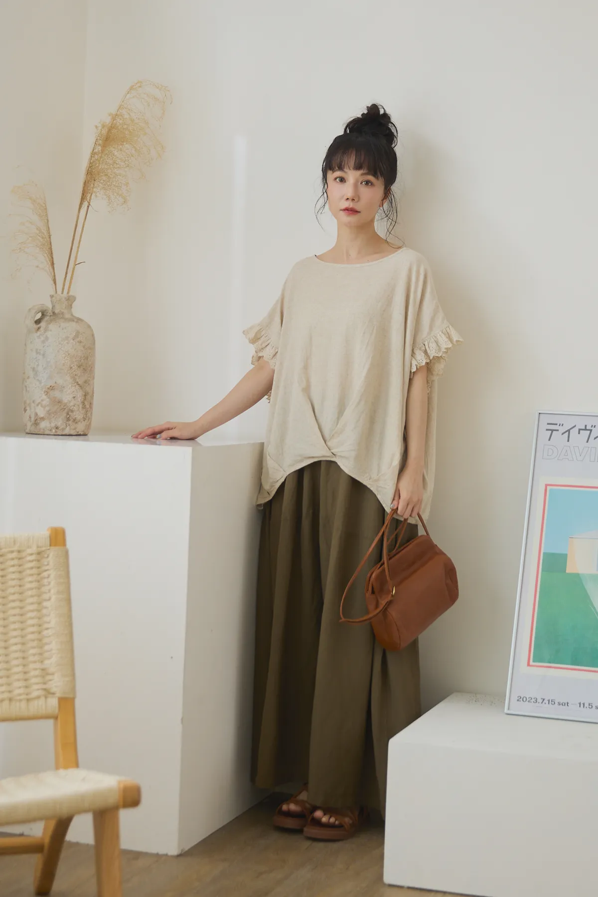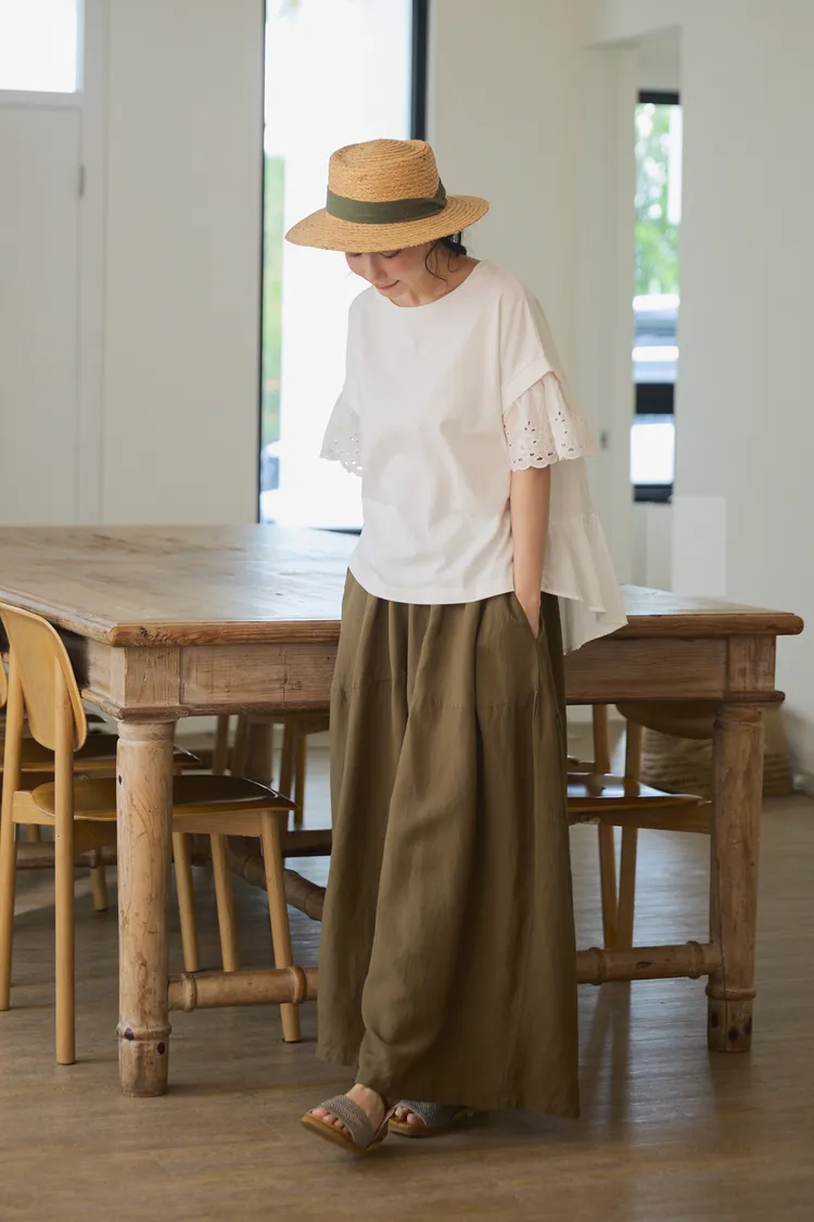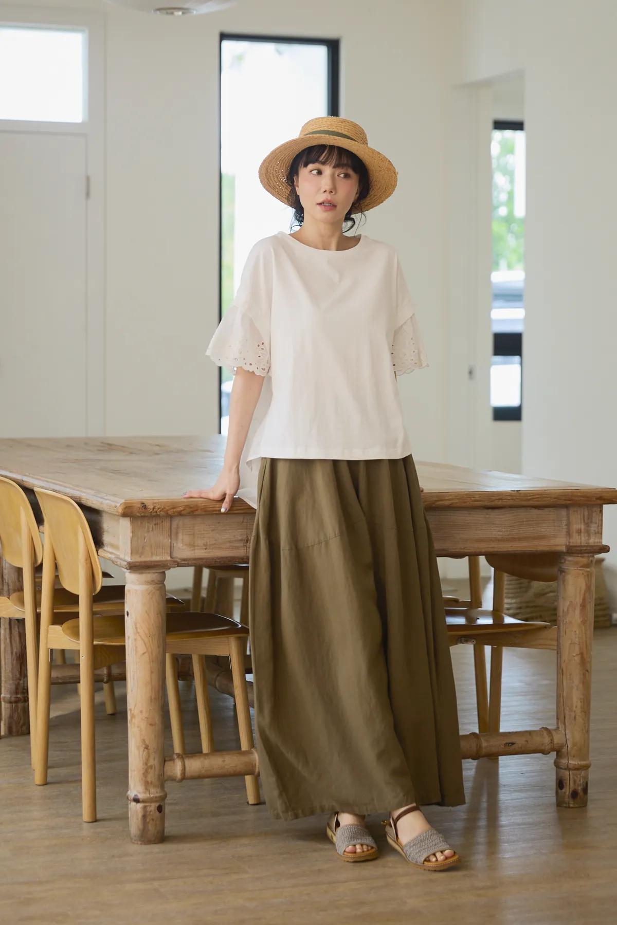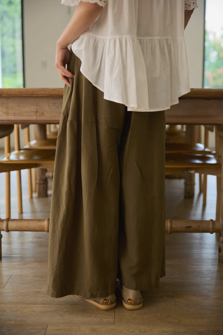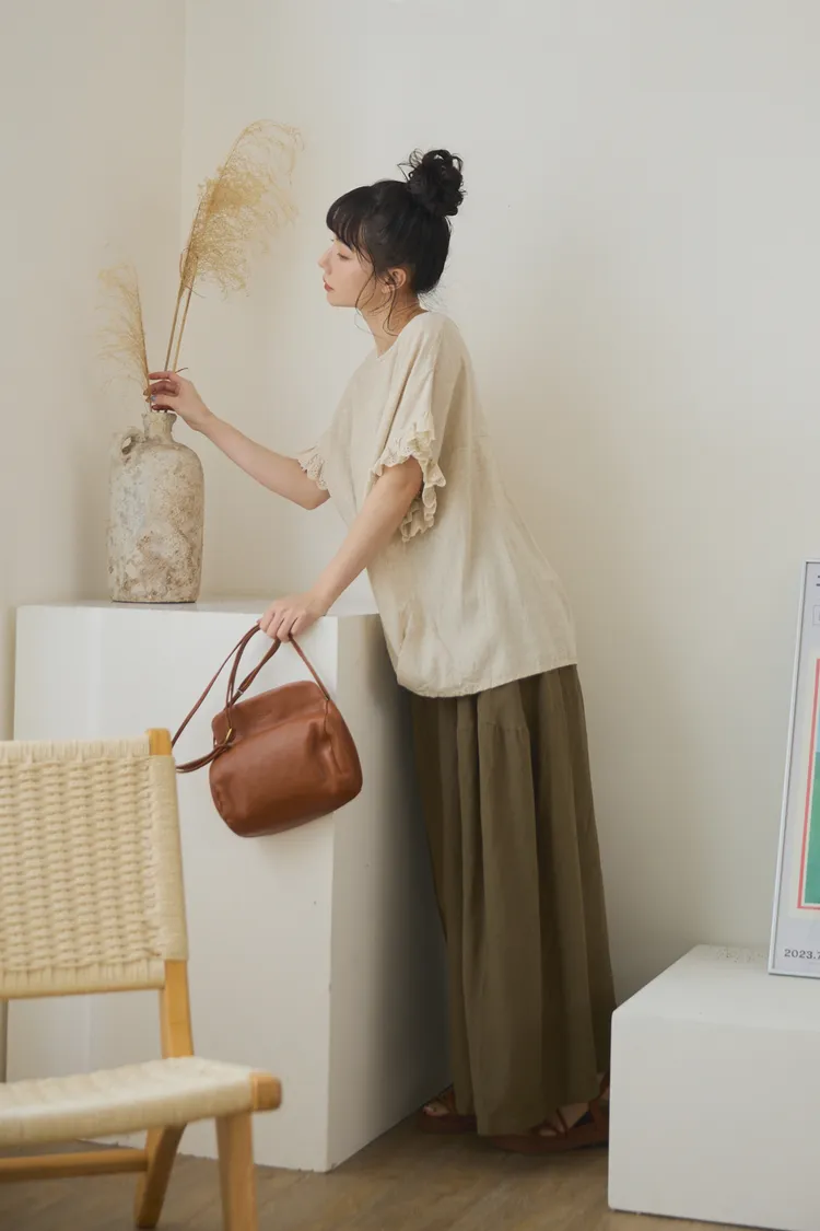 布料是關鍵。它由 55% 麻、45% 嫘縈混紡組成:麻給了褲子必要的挺度與自然涼感,嫘縈則帶來滑順與垂墜,使整條褲子「有骨架但不硬」,摸起來有麻的透氣感卻完全不刺皮。這種組合讓褲子既能保持線條感,又有舒服的貼膚觸感——你可以從早上一路穿到晚上,從捷運到公司、從午休到接孩子回家,幾乎忘記自己穿著褲子。